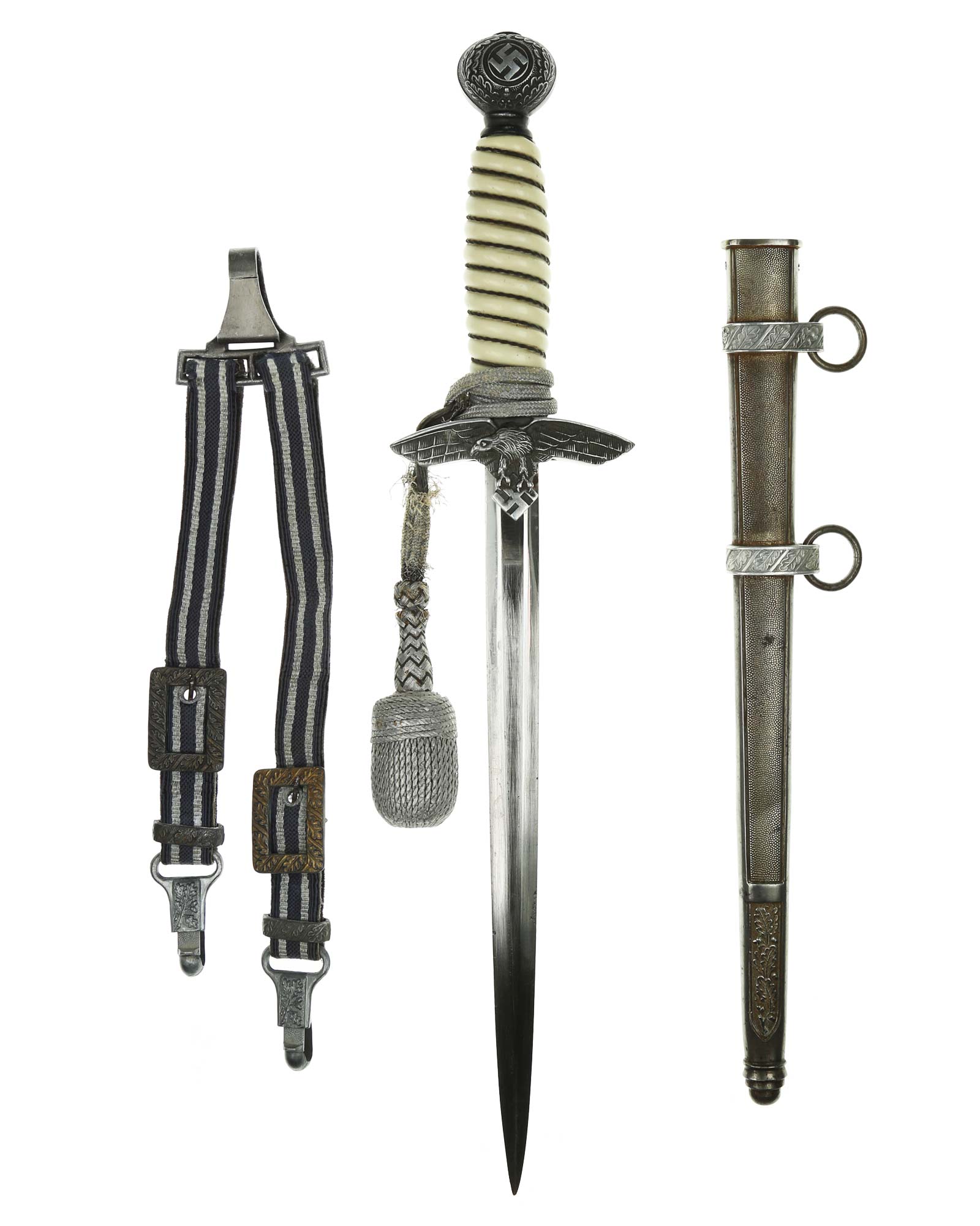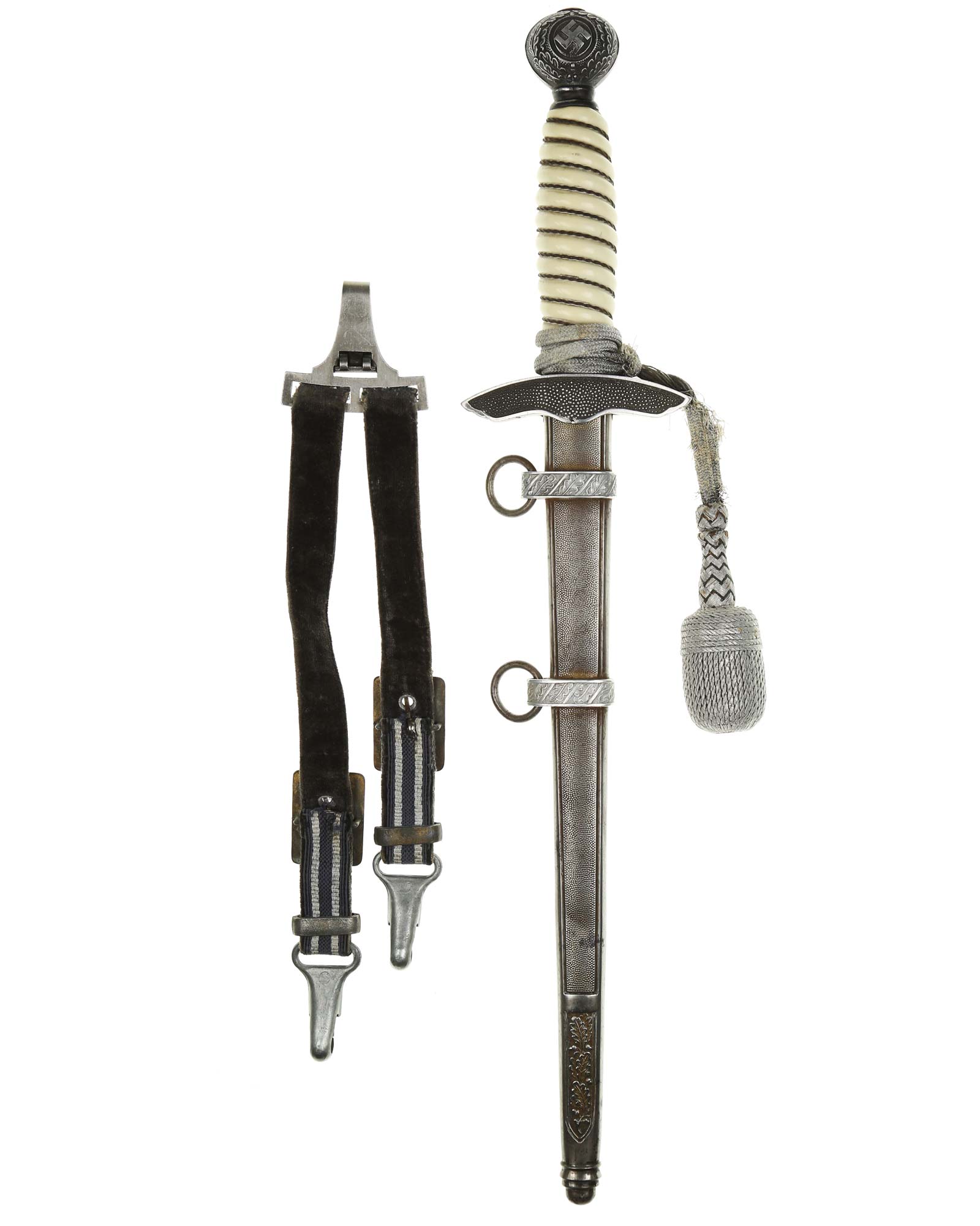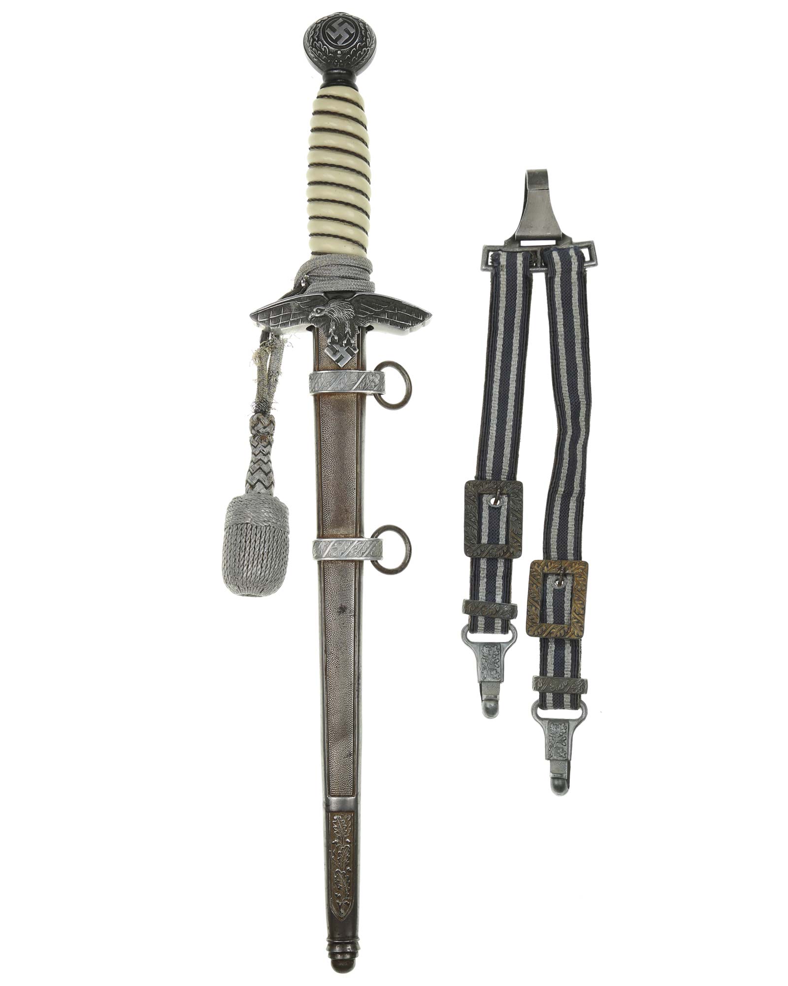 Dolch für Offiziere der Luftwaffe, M1937 - 2. Modell. Die Gesamtlänge beträgt 43,2 cm. Der Luftwaffen Offiziersdolch hat den Hersteller auf der Klinge: P.D. Lüneschloss Solingen und ist zusammen mit einem zweiteiligem Gehänge.