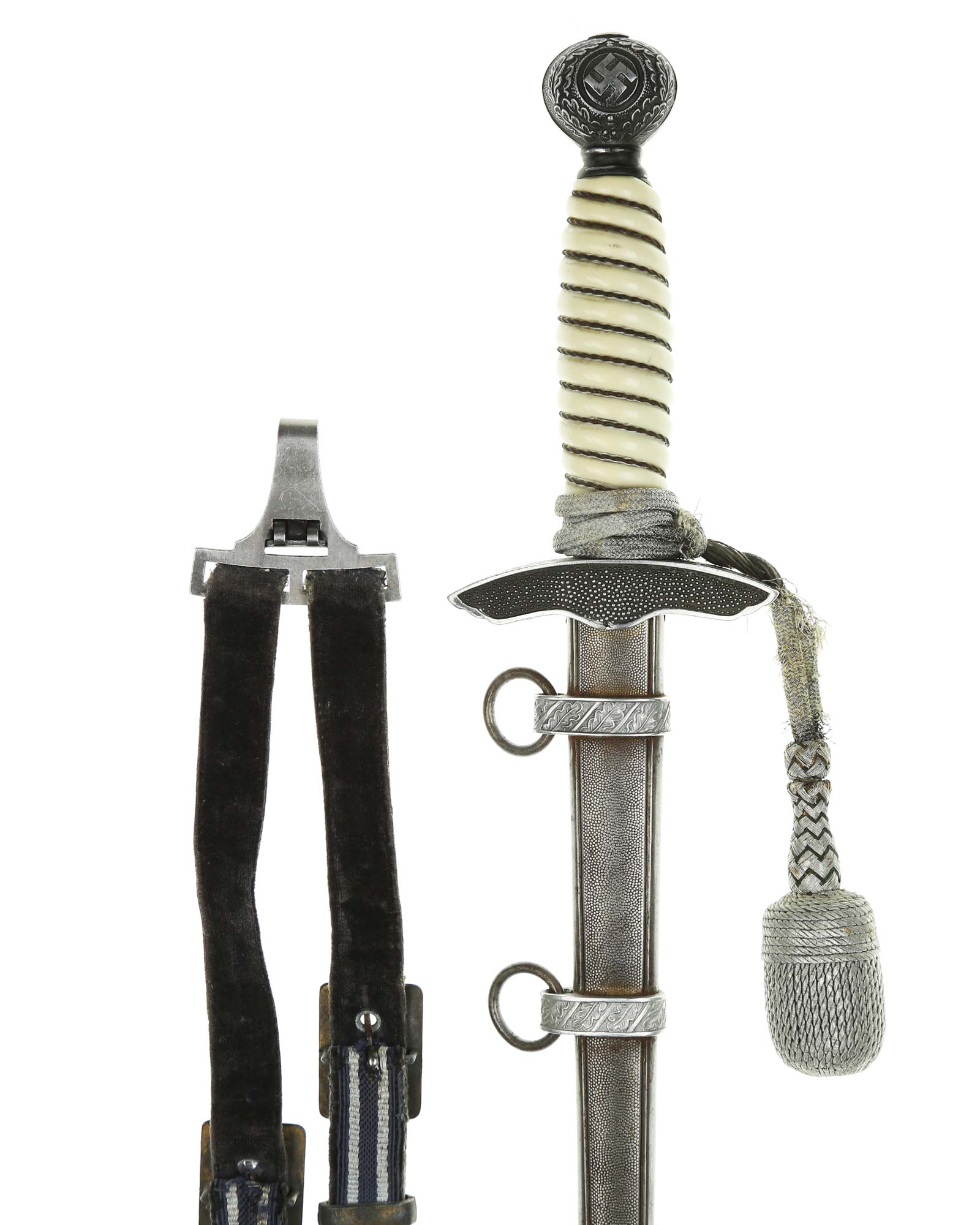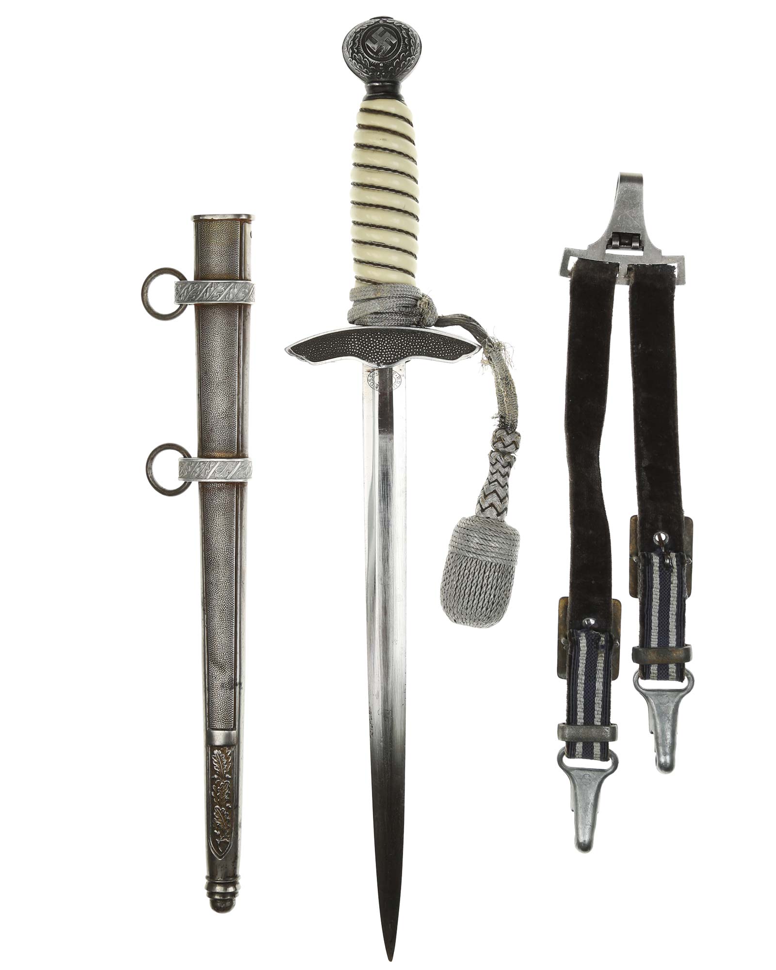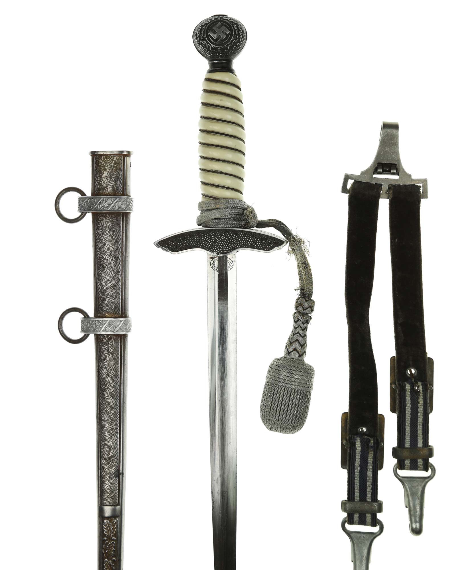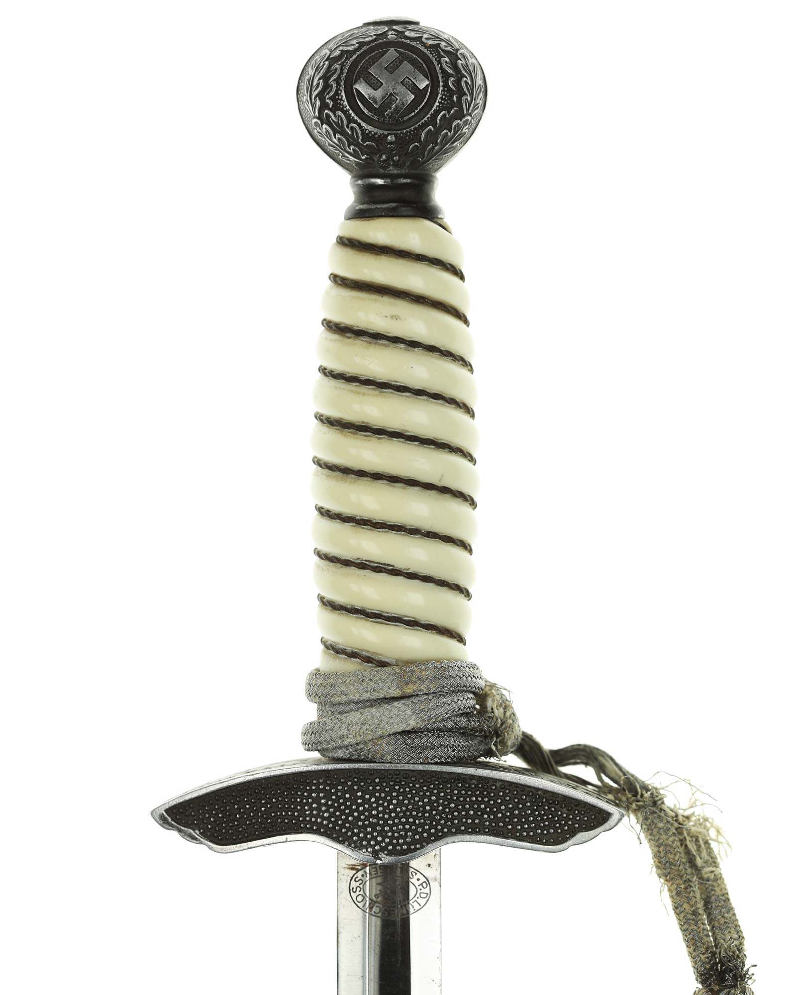 Dolch für Offiziere der Luftwaffe, M1937 - 2. Modell. Die Gesamtlänge beträgt 43,2 cm. Der Luftwaffen Offiziersdolch hat den Hersteller auf der Klinge: P.D. Lüneschloss Solingen und ist zusammen mit einem zweiteiligem Gehänge.