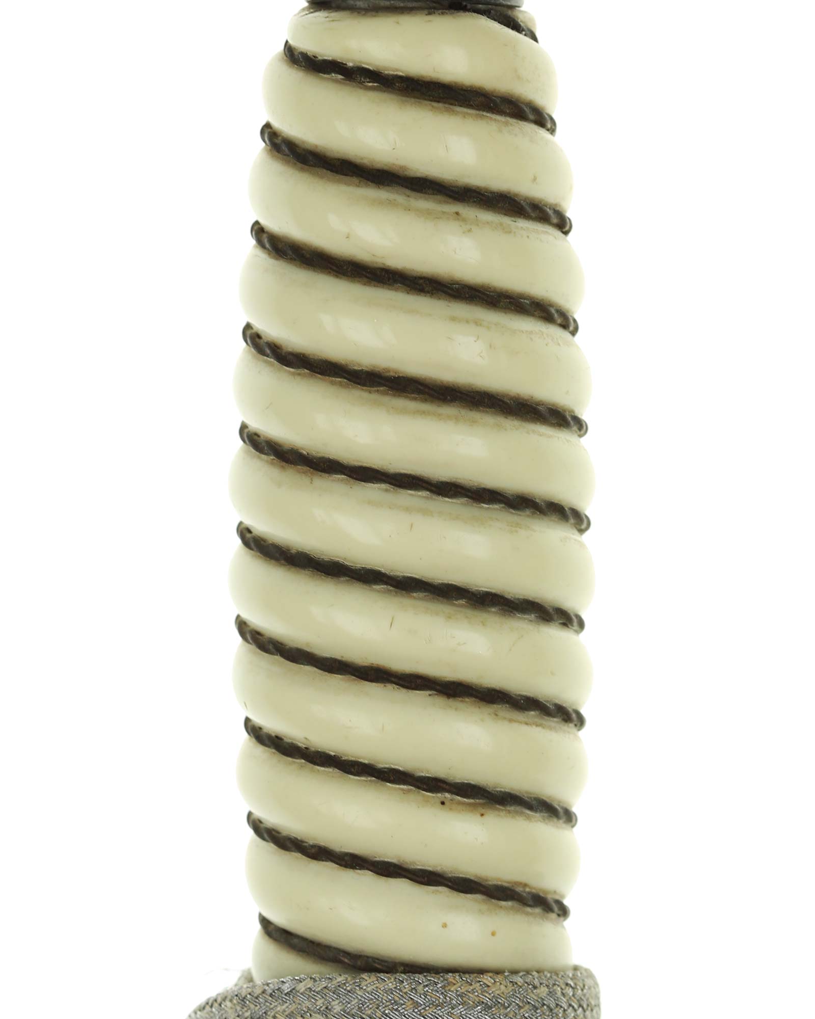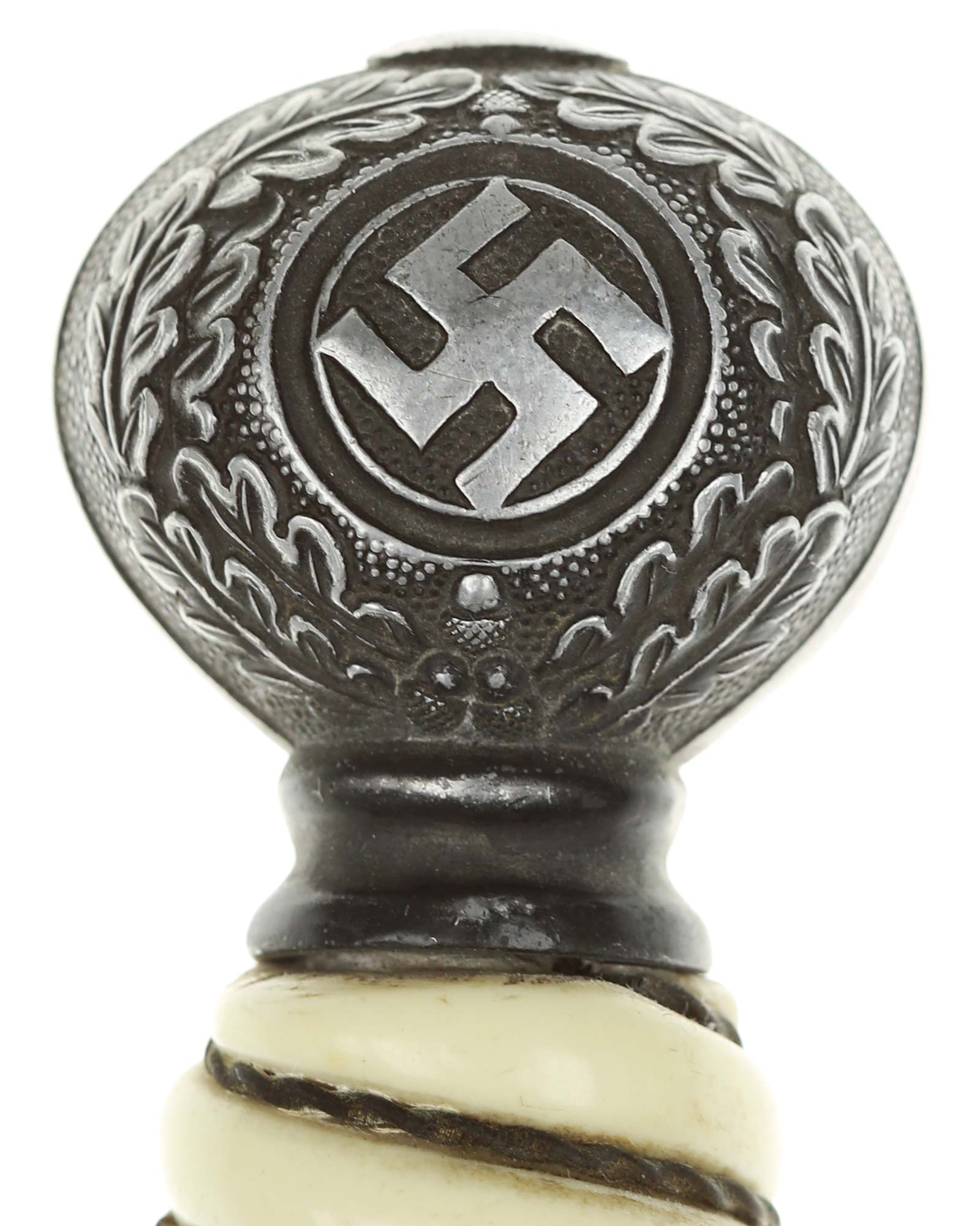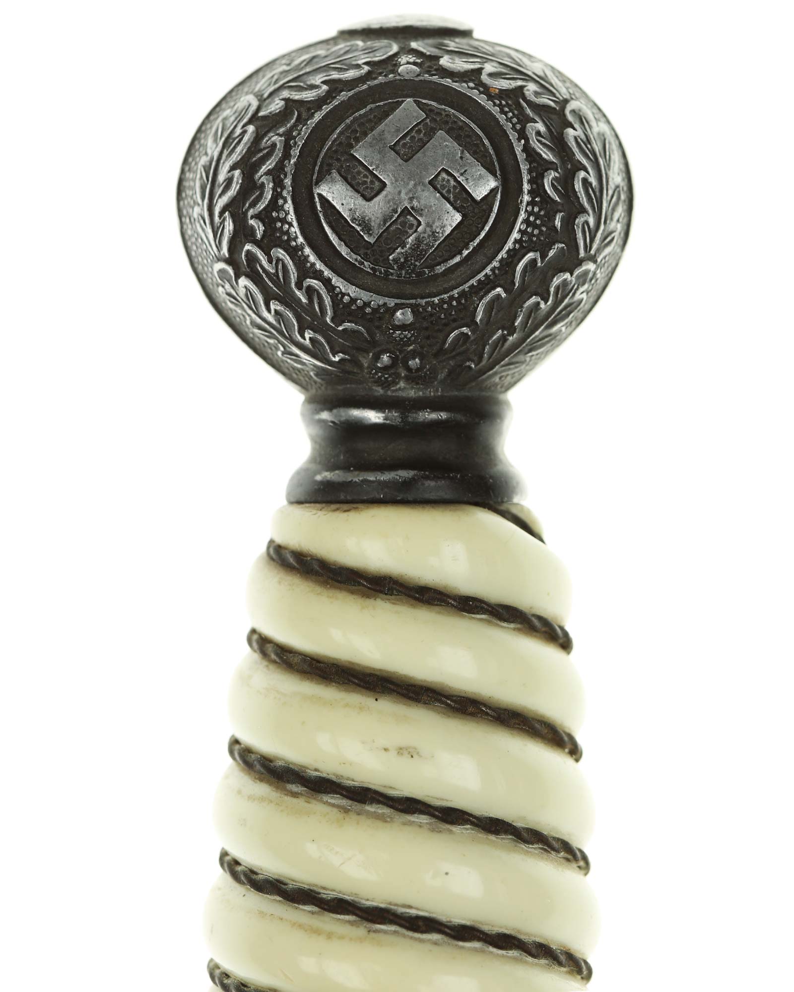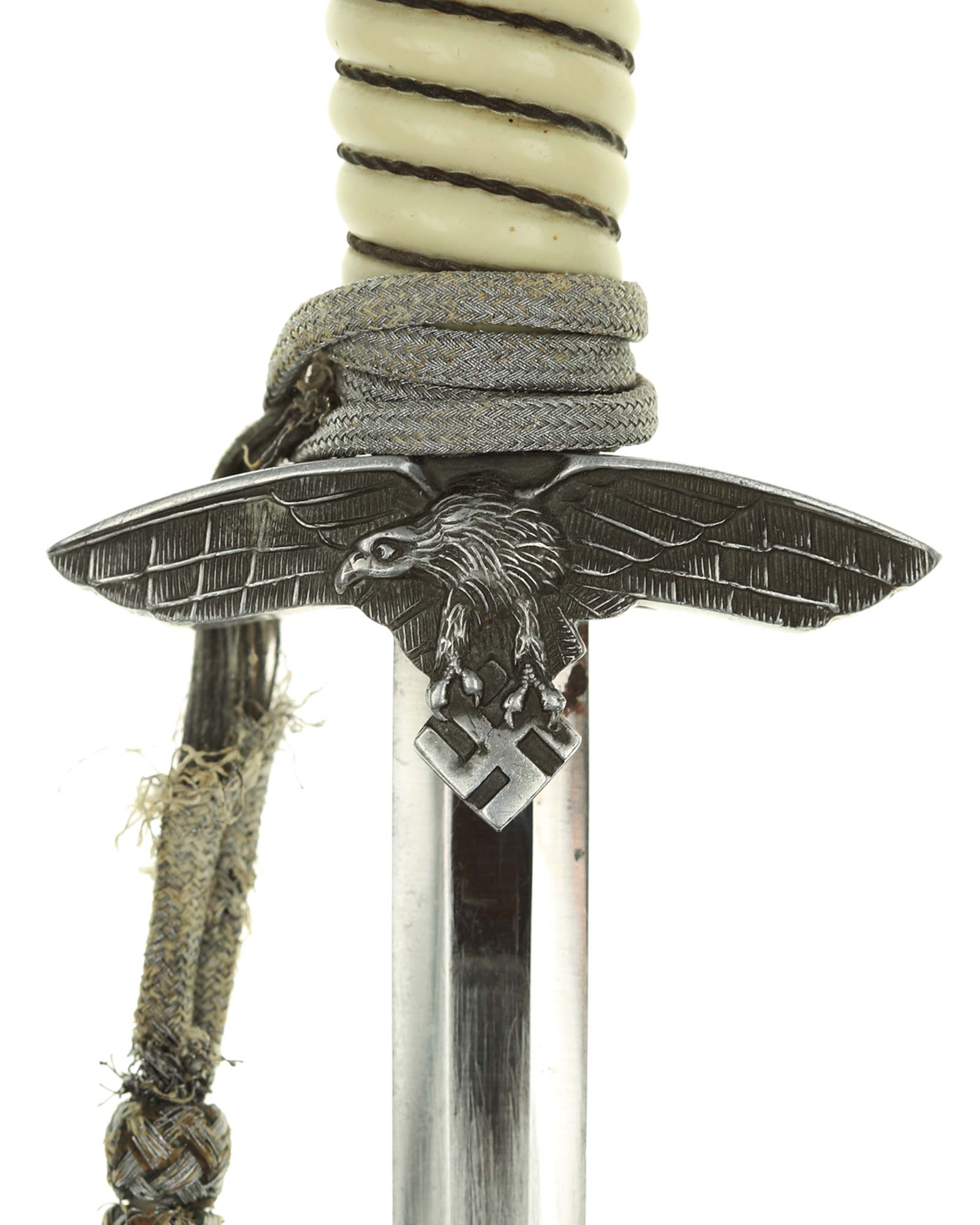 Griff: Der Griff ist weiß mit Doppeldraht-Wicklung. Die Form der Kanneluren ist konvex bzw. nach außen gewölbt. Der Knauf ist beidseitig mit Sonnenrädern und mit Eichenlaub verziert. Der Knauf ist auf die Klingenangel festgeschraubt. Die Parierstange ist in Form eines Luftwaffenadlers, der nach links schaut. Zu den beiden Enden hin verlaufen die Flügel nach unten. In der Mitte befindet sich der Adler, der in seinen Krallen ein Hakenkreuz festhält, die Rückseite der Parierstange ist gekörnt.