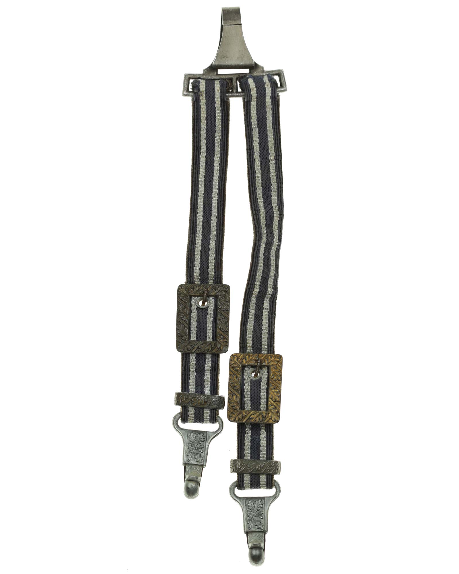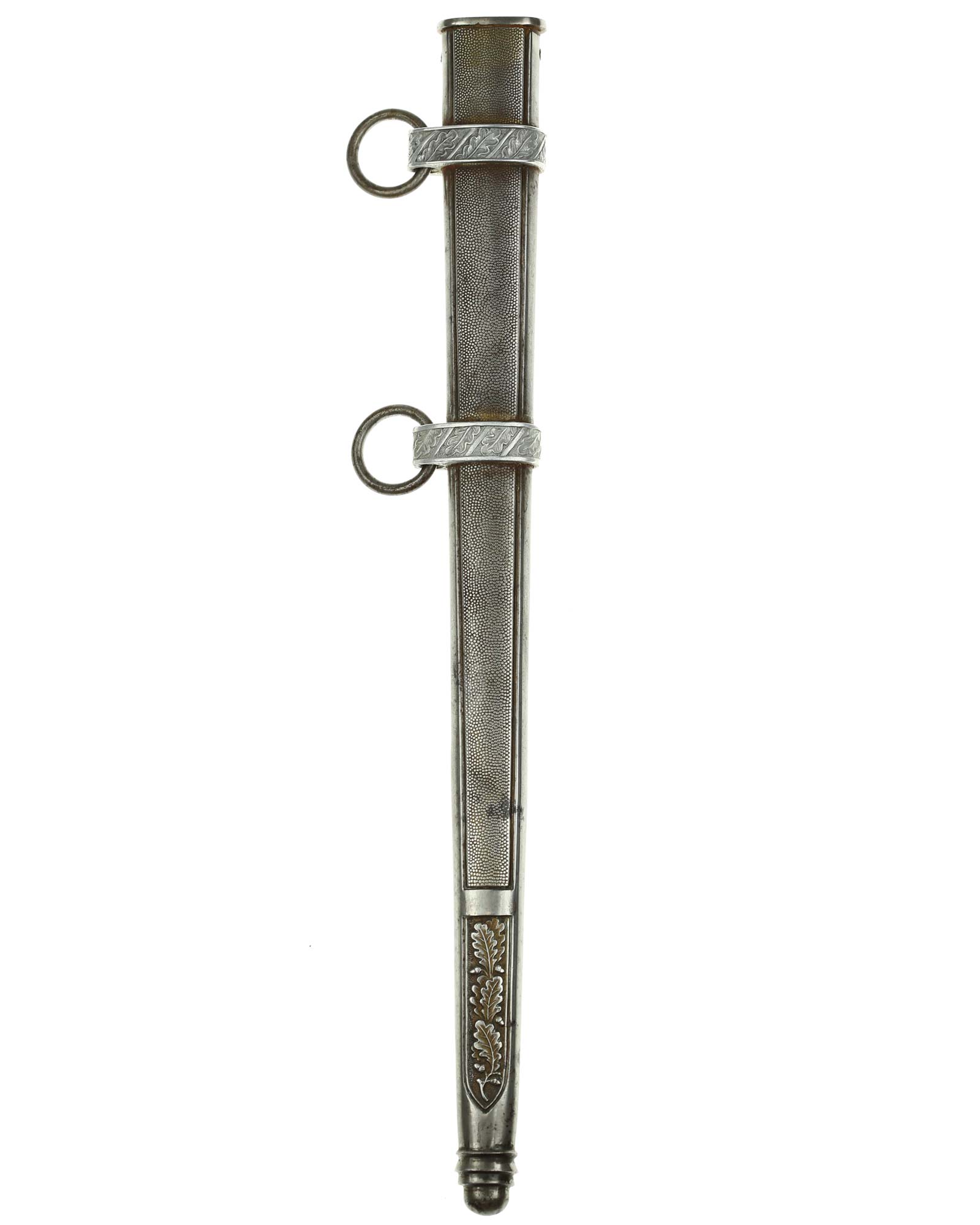Scheide: Die Scheide besteht aus Mundblech und aus zwei eichenlaubverzierten Scheidenbändern mit zwei losen Trageringen, diese sind komplett geschlossen. Die Scheide ist aus einem Stück Stahlblech gezogen und auf der Vorder- und Rückseite mit körniger Oberflächenstruktur versehen. Die Spitze ist abgerundet und unbeschädigt. Das Mundstück ist separat eingesetzt und wird mit zwei Schrauben seitlich festgehalten.