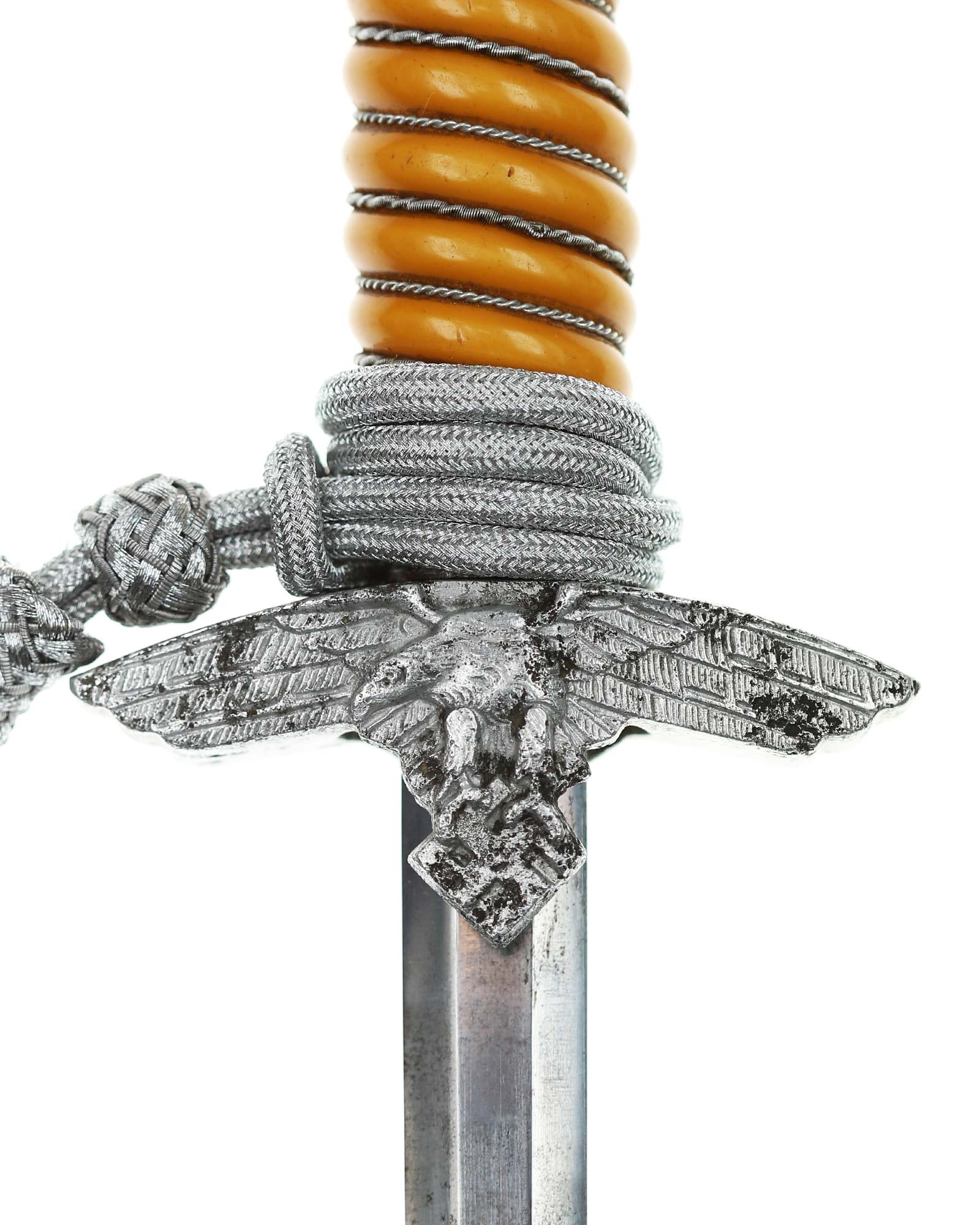 Griff: Der Griff ist orange leichter Beschädigung im oberen Bereich. Die Form der Kanneluren ist konvex bzw. nach außen gewölbt. Der Knauf ist beidseitig mit Sonnenrädern und mit Eichenlaub verziert, zum Teil ist die Vergoldung noch drauf. Der Knauf ist auf die Klingenangel festgeschraubt. Die Parierstange ist in Form eines Luftwaffenadlers, der nach links schaut. Zu den beiden Enden hin verlaufen die Flügel nach unten. In der Mitte befindet sich der Adler, der in seinen Krallen ein Hakenkreuz festhält, die Rückseite der Parierstange ist gekörnt.