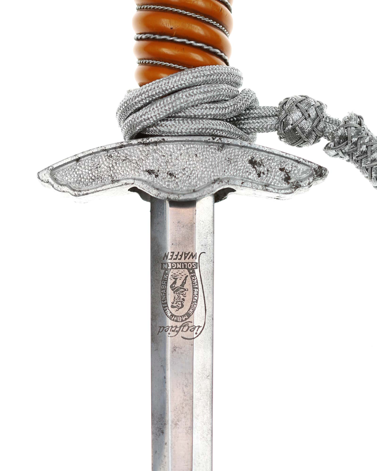 Klinge: Die Klinge ist blank. Auf der Rückseite der Klinge befindet sich die Herstellerbezeichnung: Ernst Pack & Söhne Solingen. Zwischen den Schultern der Klinge und der unteren Parierstange befindet sich das originale Stoßleder.
