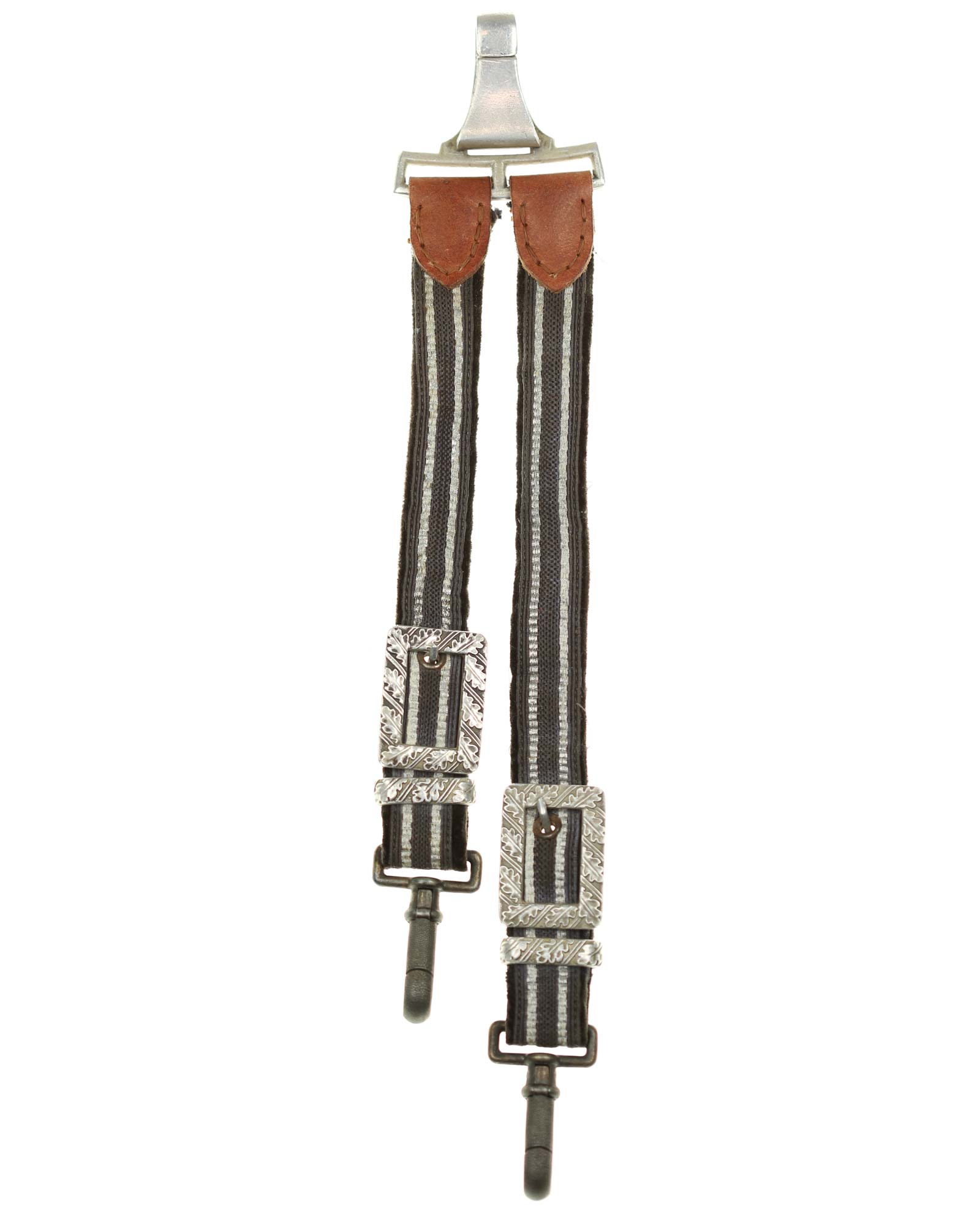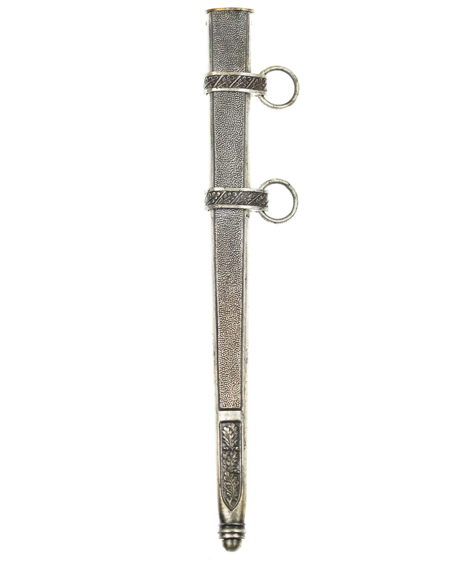 Scheide: Die Scheide besteht aus Mundblech und aus zwei eichenlaubverzierten Scheidenbändern mit zwei losen Trageringen, diese sind komplett geschlossen. Die Scheide ist aus einem Stück Stahlblech gezogen und auf der Vorder- und Rückseite mit körniger Oberflächenstruktur versehen. Die Spitze ist abgerundet und unbeschädigt. Das Mundstück ist separat eingesetzt und wird mit zwei Schrauben seitlich festgehalten.