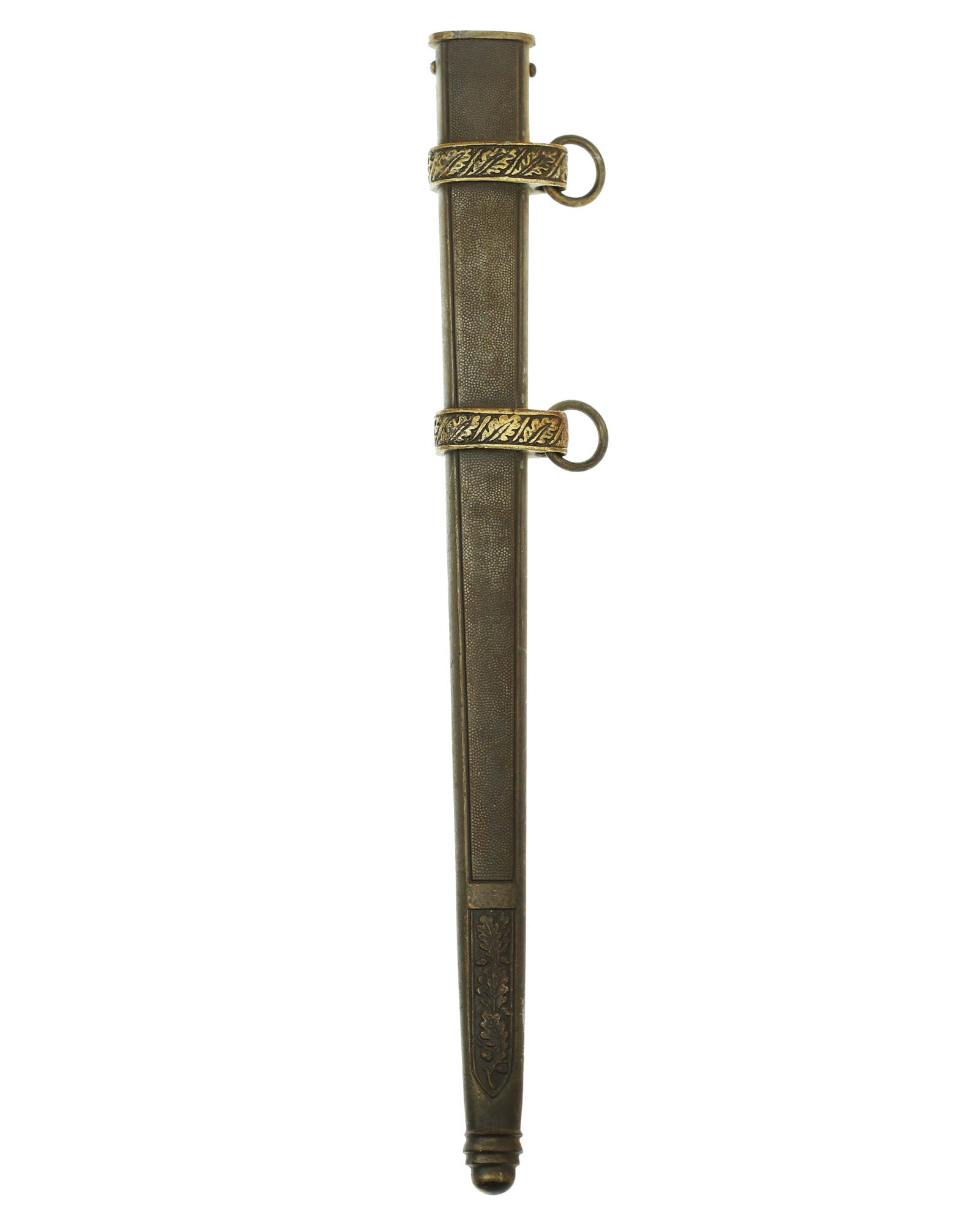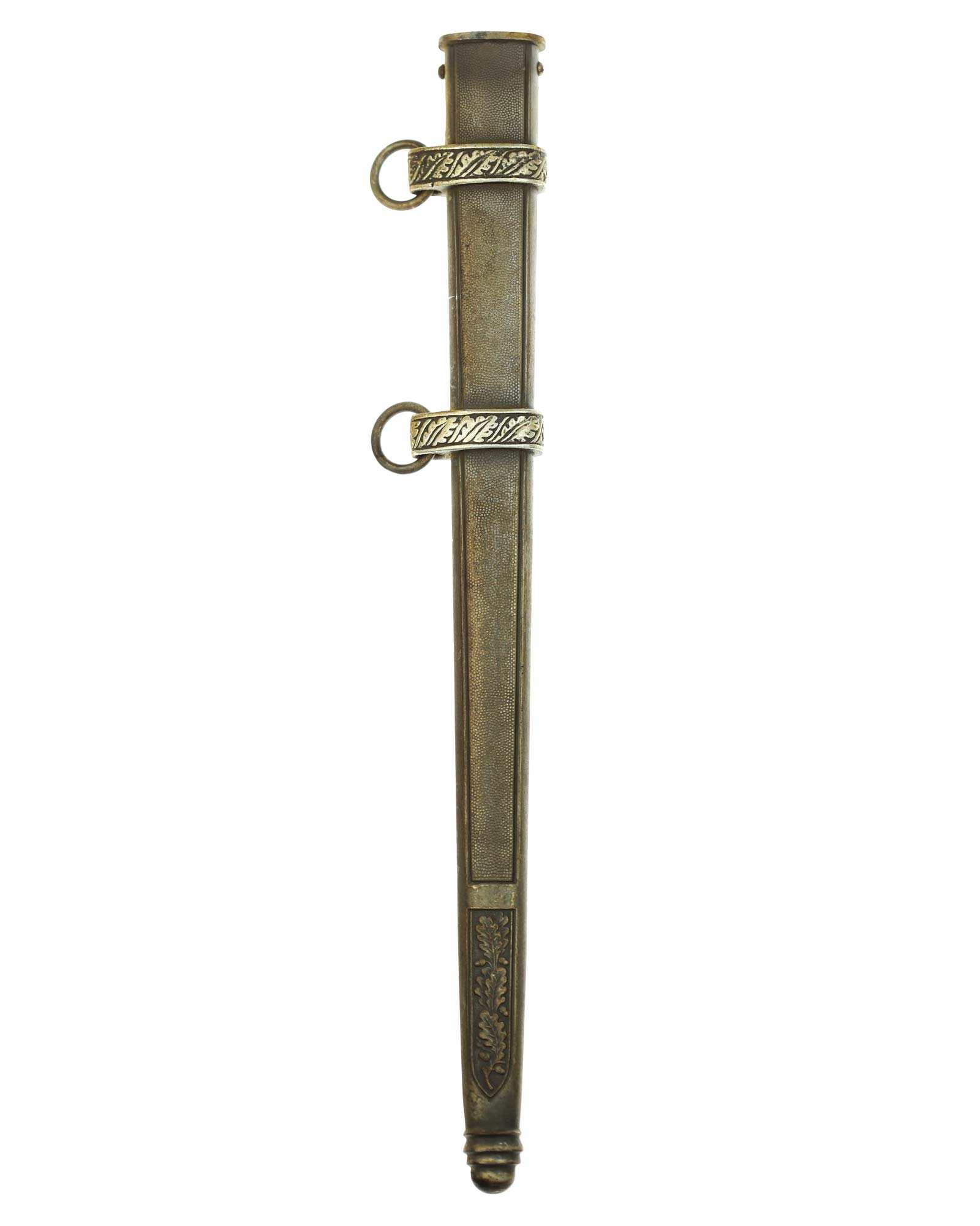 Scheide: Die Scheide besteht aus Mundblech und aus zwei eichenlaubverzierten Scheidenbändern mit zwei losen Trageringen. Die Scheide ist aus einem Stahlblech gezogen und auf der Vorder- und Rückseite mit körniger Oberflächenstruktur versehen. Die Spitze ist abgerundet und unbeschädigt. Das Mundstück ist separat eingesetzt und wird mit zwei Schrauben seitlich festgehalten.