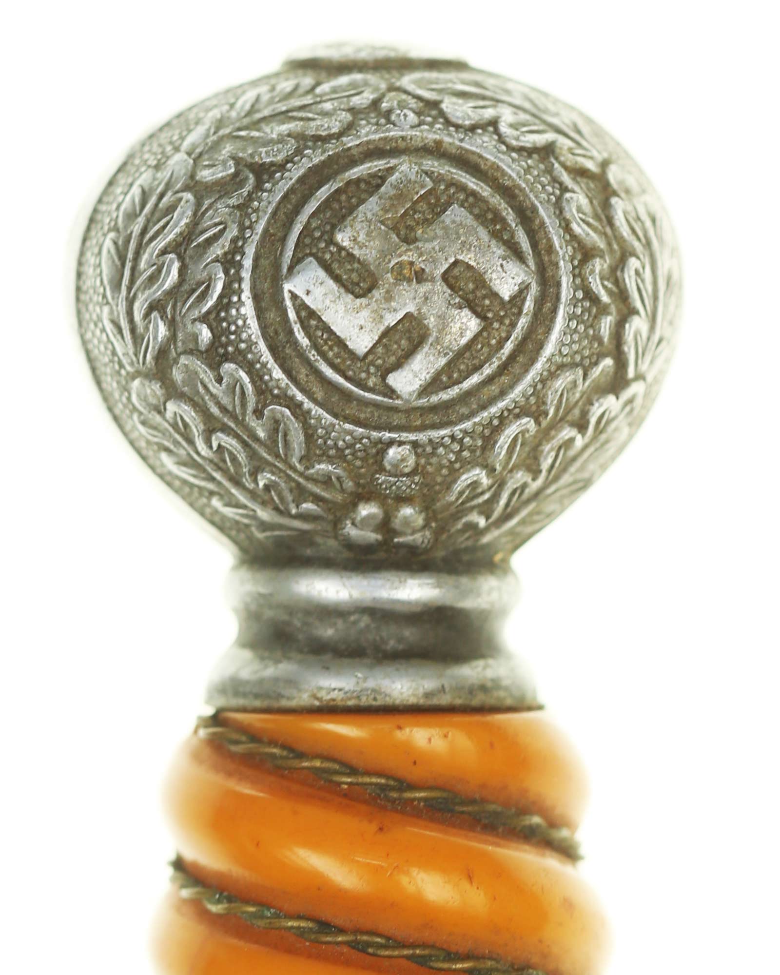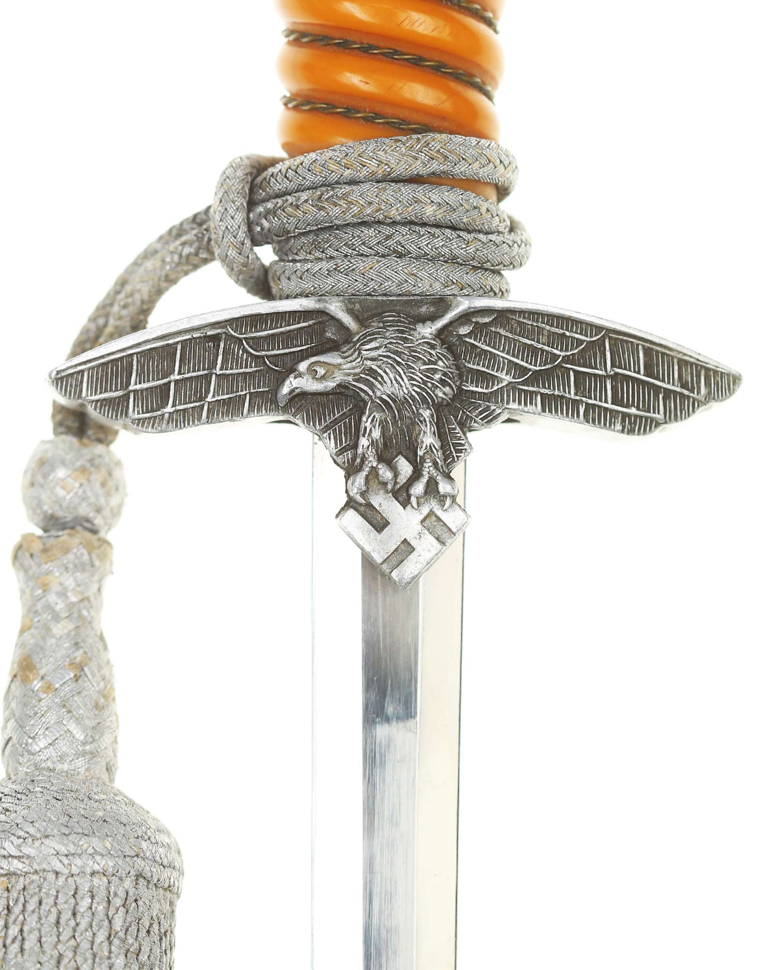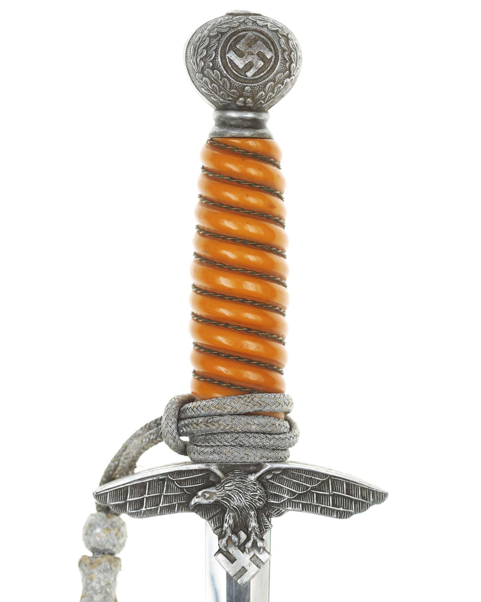 Griff: Der Griff ist orange und rund. Die Form der Kanneluren ist konvex bzw. nach außen gewölbt. Im unteren Bereich unter dem Griffring, ist ein Teil abgeplatzt. Der Knauf ist beidseitig mit Hakenkreuzen, diese sind noch vergoldet und mit Eichenlaub verziert. Knauf ist auf die Klingenangel festgeschraubt. Die Parierstange ist in Form eines Luftwaffenadlers, der nach links schaut. Zu den beiden Enden hin verlaufen die Flügel nach unten. In der Mitte befindet sich der Adler, der in seinen Krallen ein Hakenkreuz festhält, die Rückseite der Parierstange ist gekörnt.