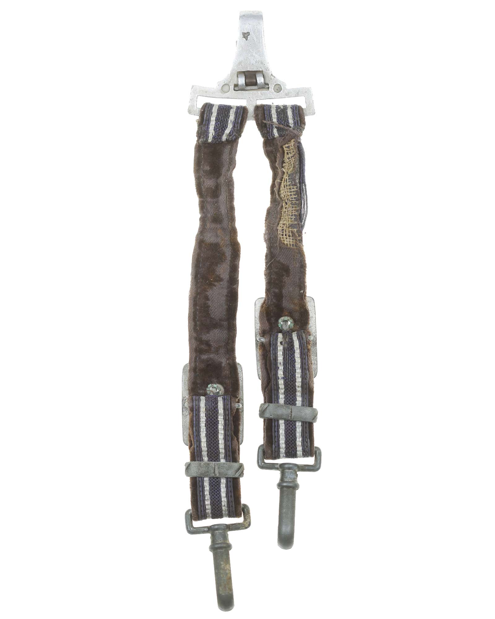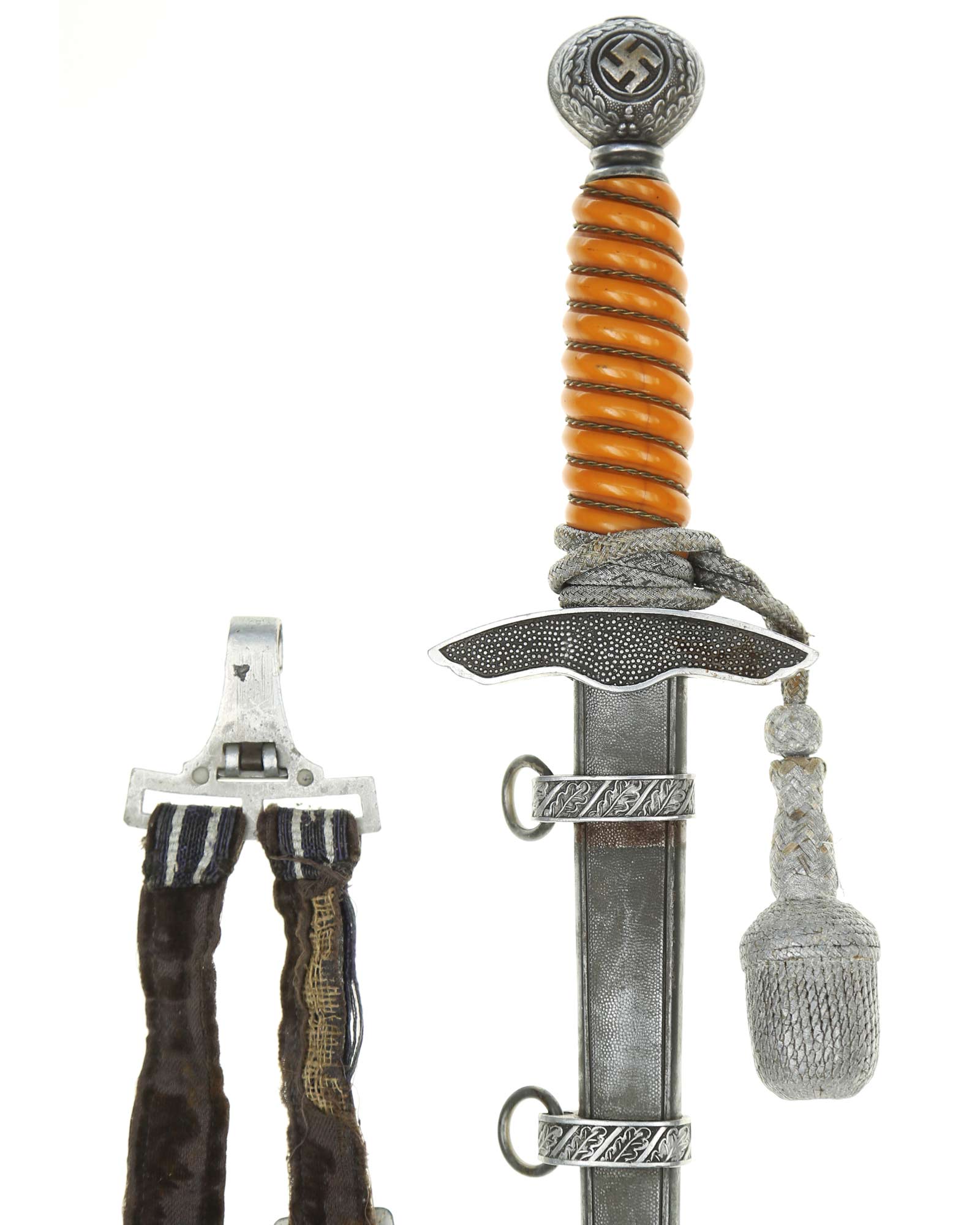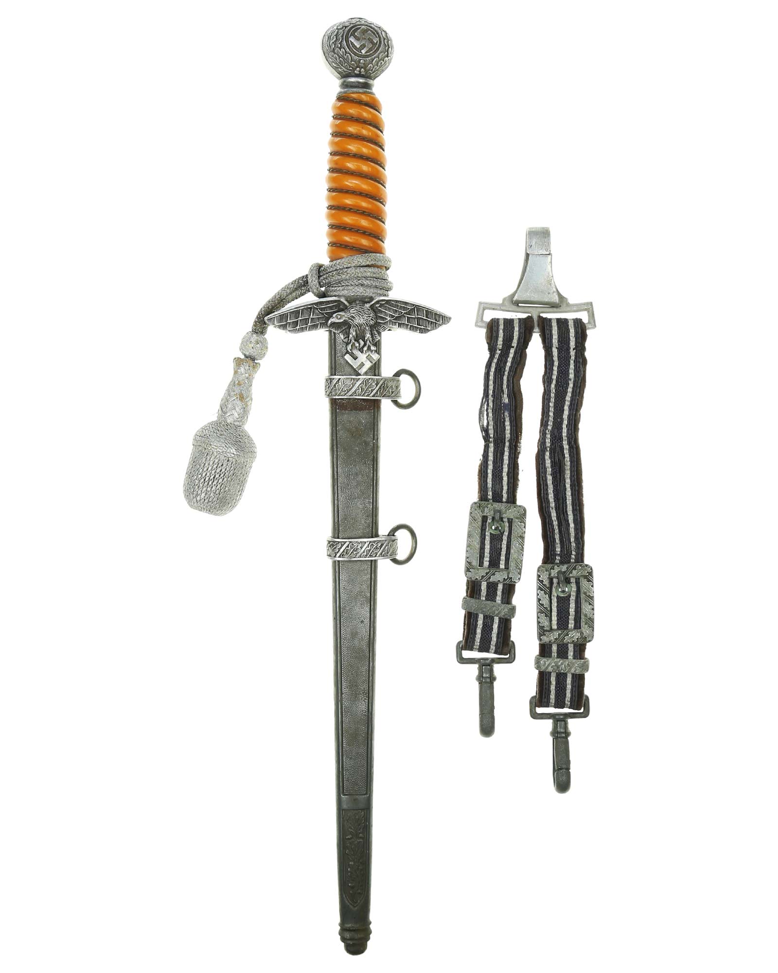 Dolch für Offiziere der Luftwaffe, M1937 - 2. Modell. Der Luftwaffen Offiziersdolch hat den Hersteller auf der Klinge: Carl Jul. Krebs Solingen und ist zusammen mit einem zweiteiligem Gehänge und kurzem Luftwaffenportepee. Die Gesamtlänge beträgt 42,5 cm.