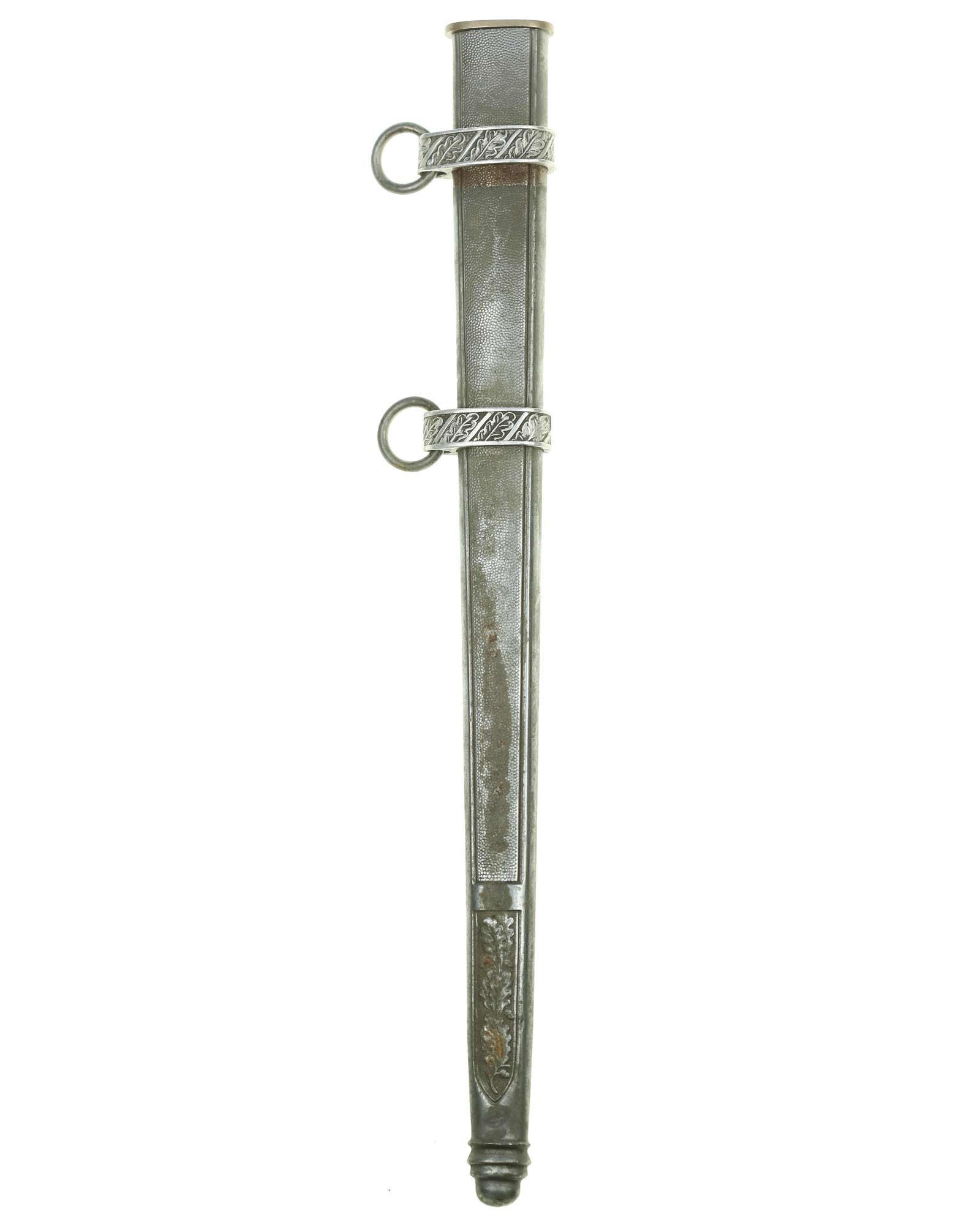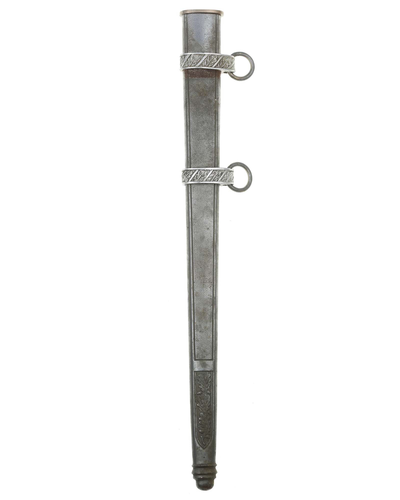 Scheide: Die Scheide besteht aus Mundblech und aus zwei eichenlaubverzierten Scheidenbändern mit zwei losen Trageringen, diese sind komplett geschlossen. Die Scheide ist aus einem Stück Stahlblech gezogen und auf der Vorder- und Rückseite mit körniger Oberflächenstruktur versehen. Die Spitze ist abgerundet und unbeschädigt. Das Mundstück ist separat eingesetzt.