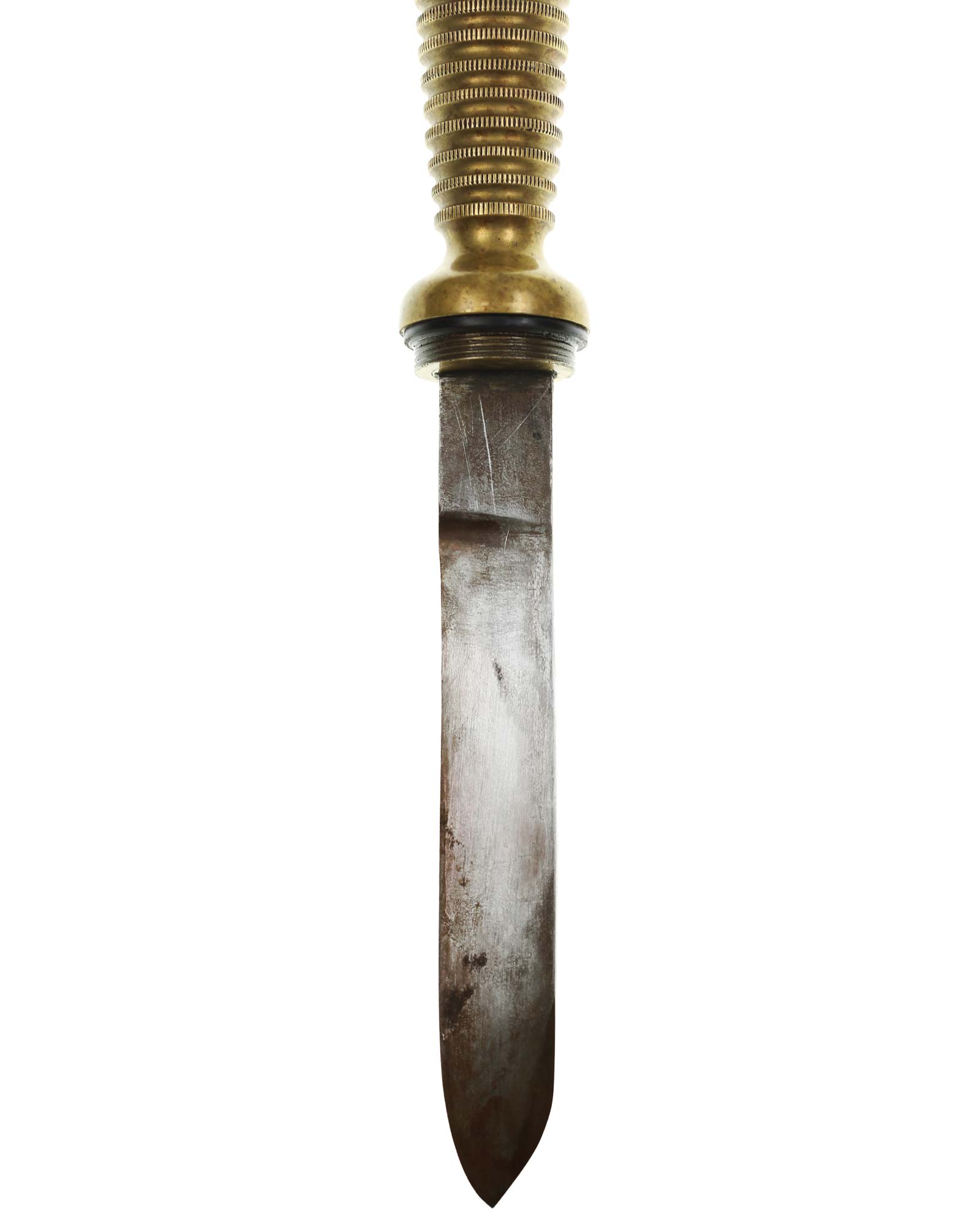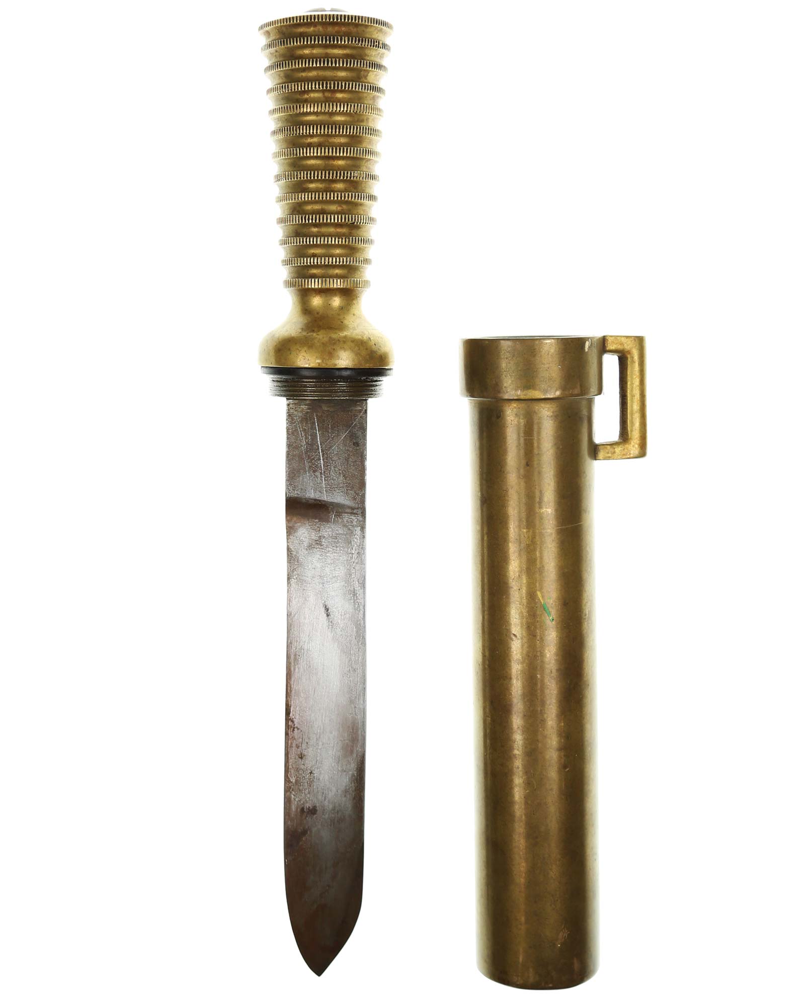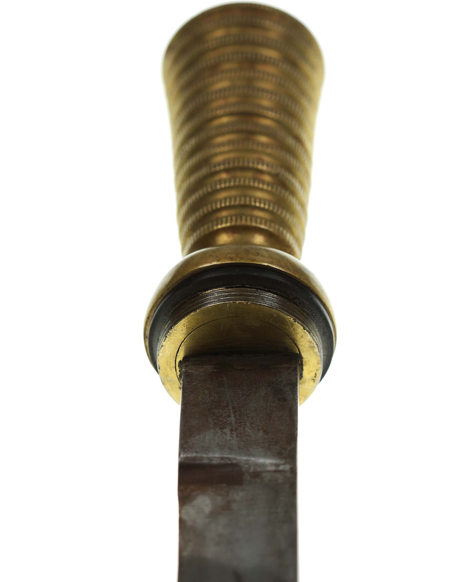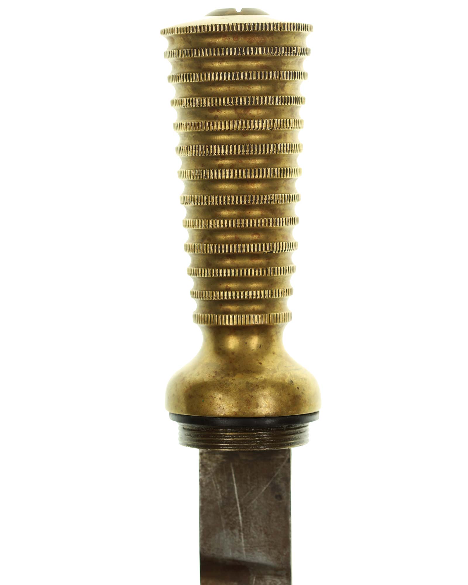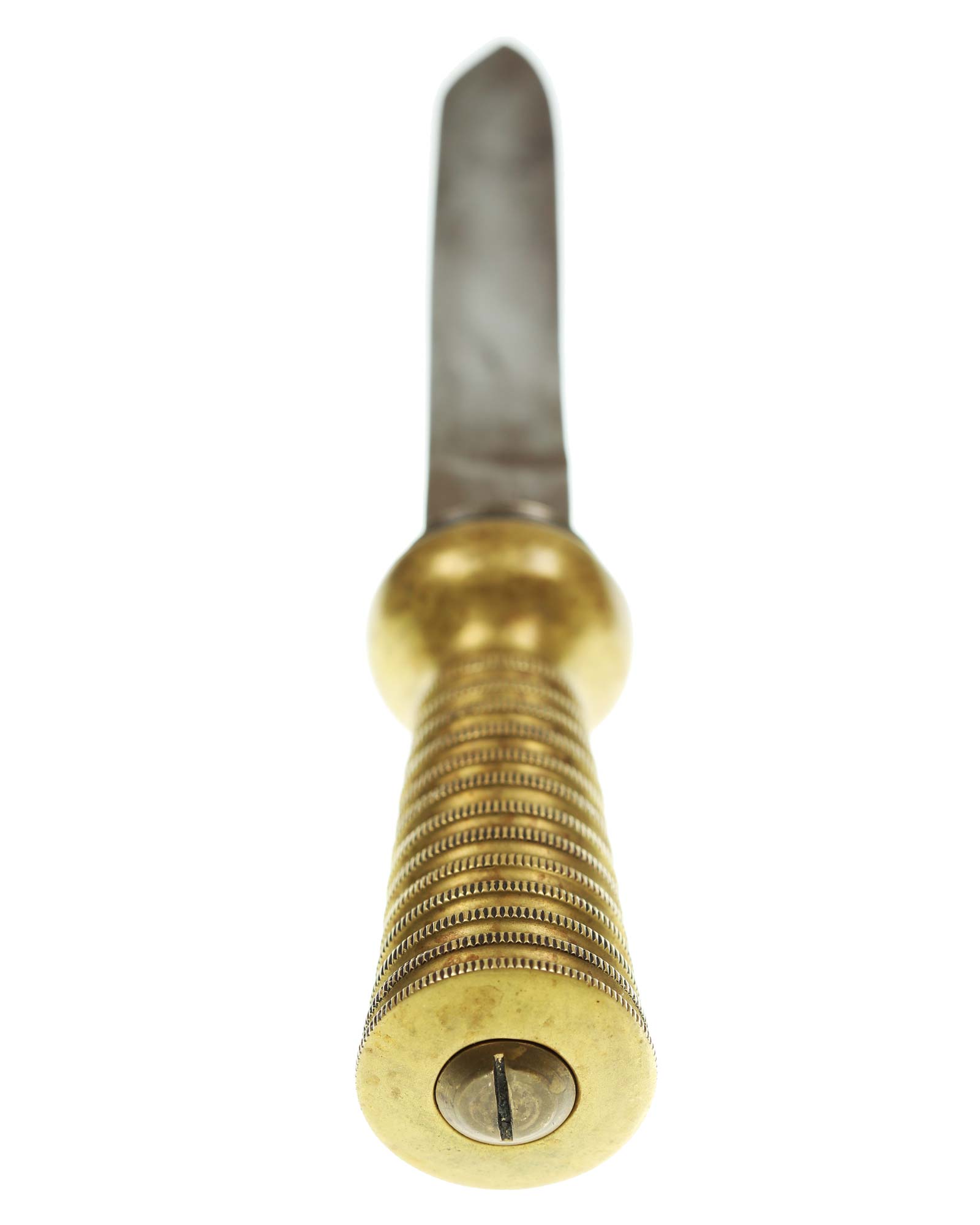 Seltenes Kriegsmarine Tauchermesser für Helmtaucher. Der Griff ist komplett aus Messing. Die Klinge ist aus Eisen und einschneidig, noch nicht poliert. Originale Gummidichtung befindet sich unter dem Griff. Die Klinge wird oben am Griff mit einer Schraube befestigt. Herstellermarkierung leider nicht mehr ersichtlich, aber es handelt sich um den Hersteller: J.A. Henckels Zwillingswerk in Solingen. Seitliche Tragevorrichtung zur Befestigung am Tauchergürtel. Gesamtlänge beträgt 33,6 cm. Gesamtgewicht ca. 2 kg. Das Tauchermesser ist noch ungereinigt im Originalzustand.