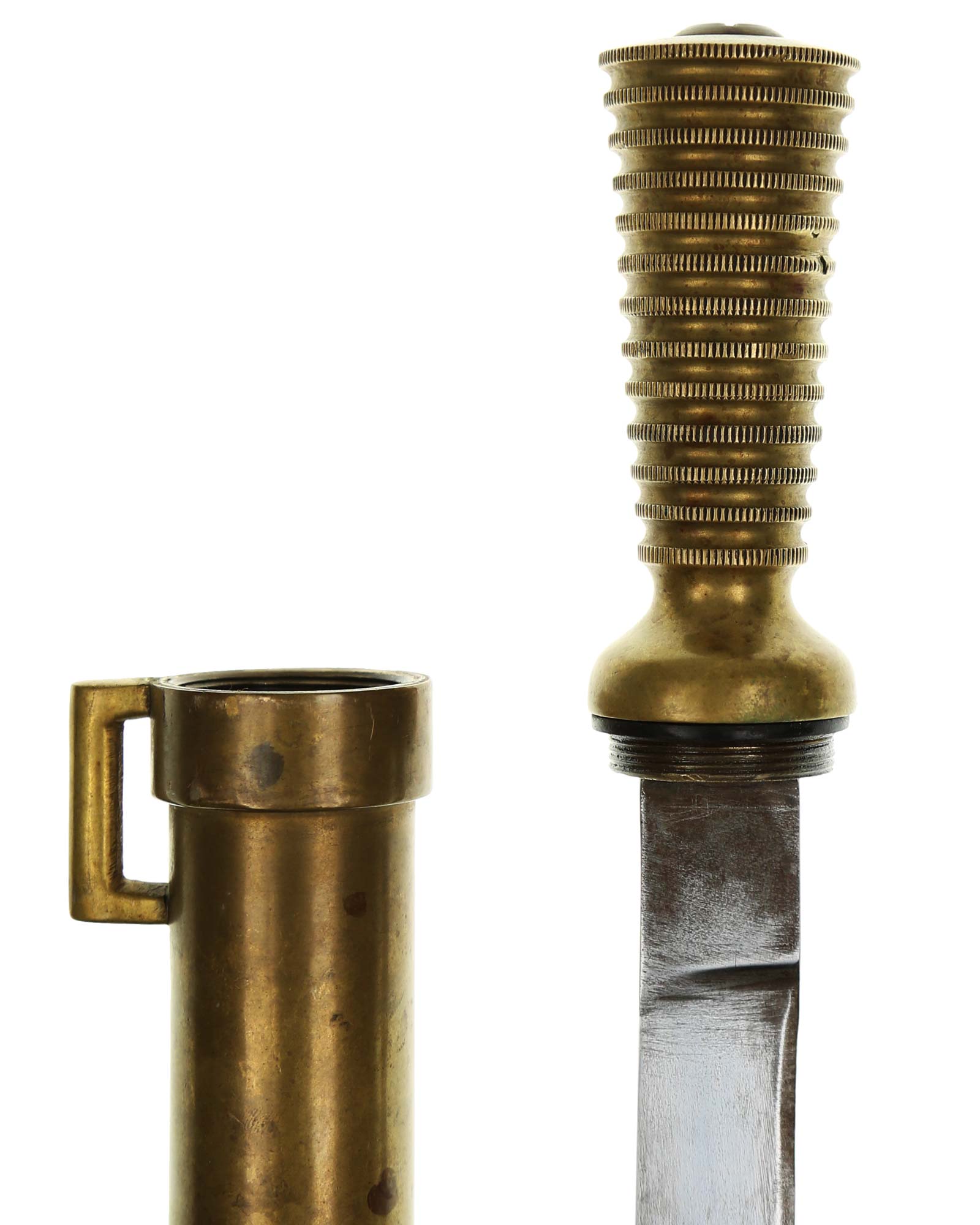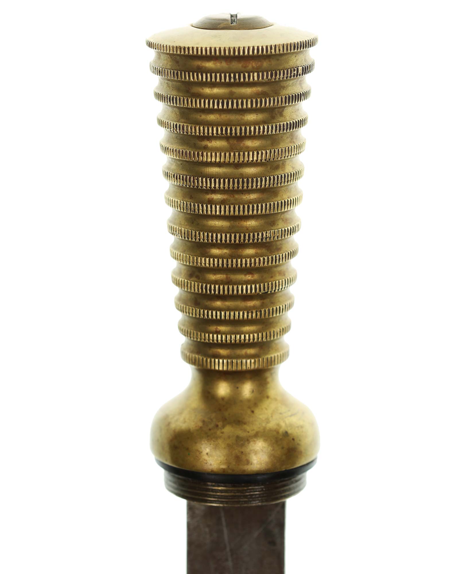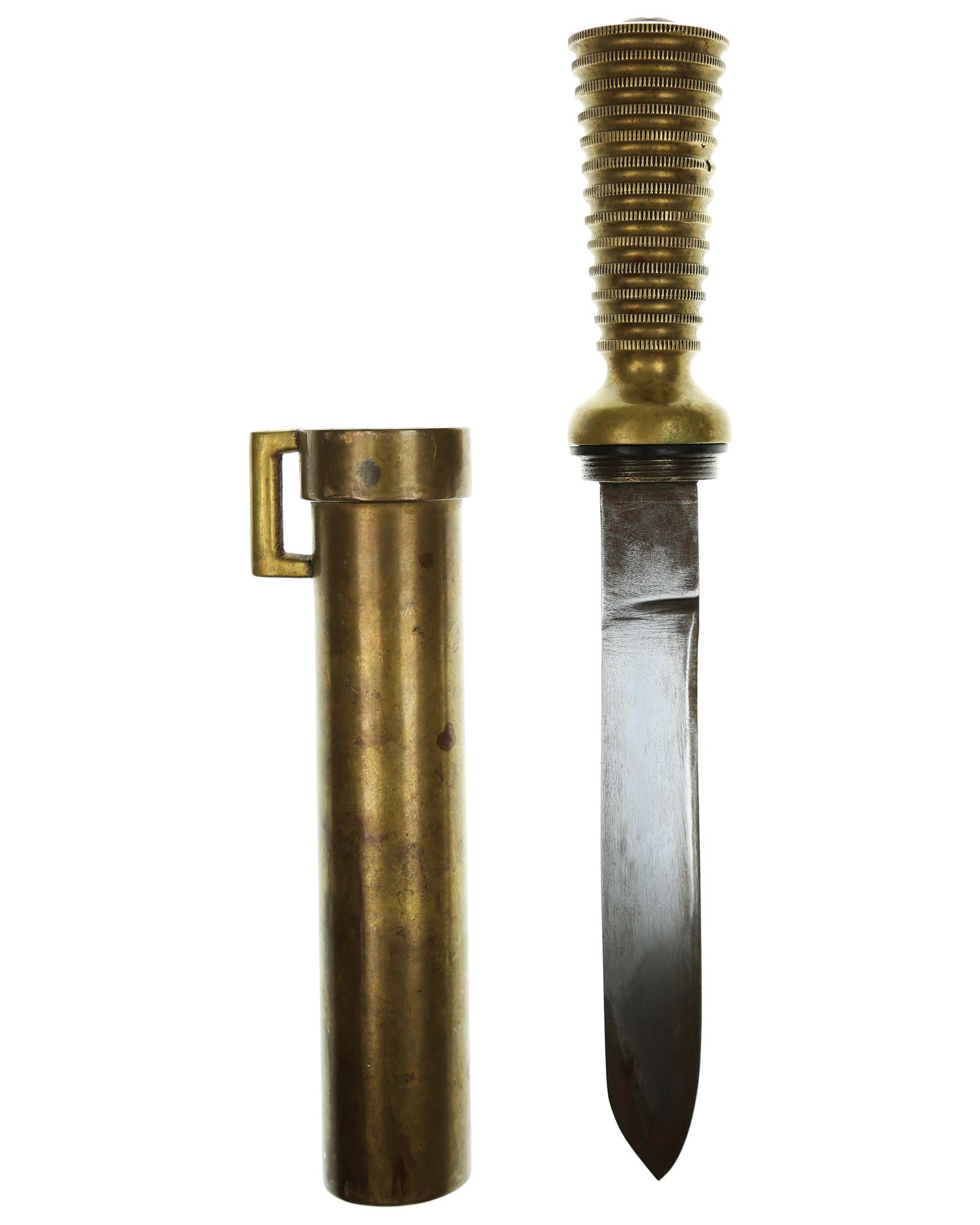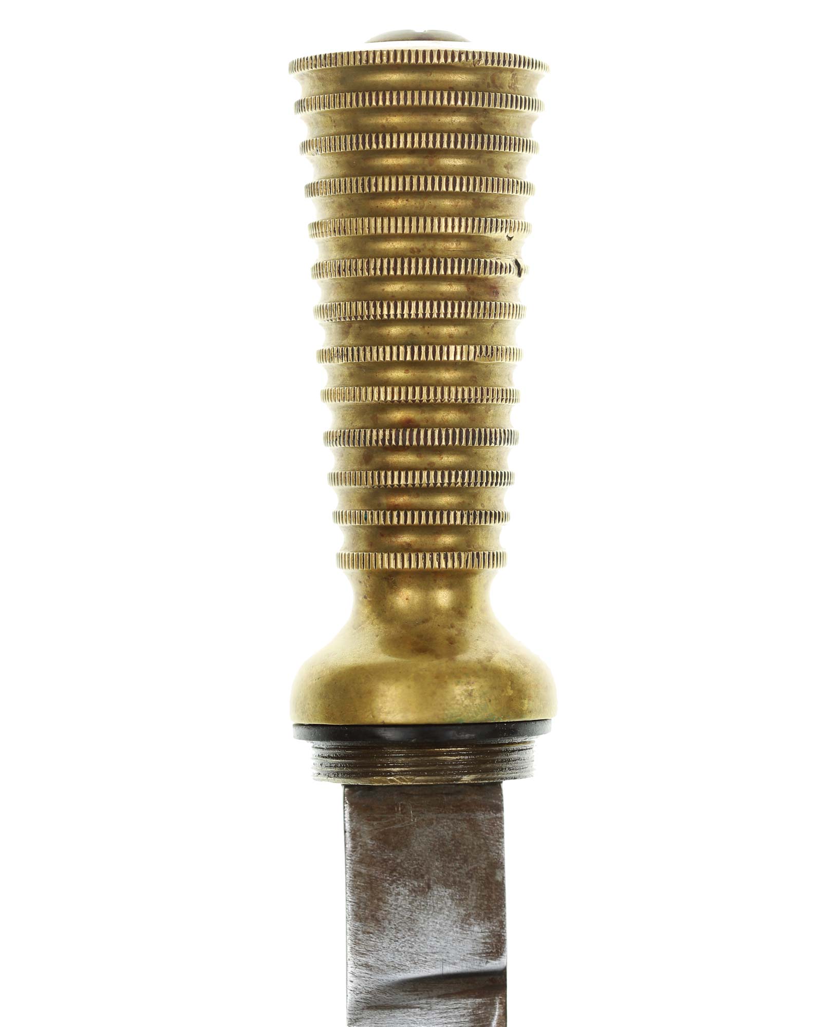 Seltenes Kriegsmarine Tauchermesser für Helmtaucher. Der Griff ist komplett aus Messing. Die Klinge ist aus Eisen und einschneidig, noch nicht poliert. Originale Gummidichtung befindet sich unter dem Griff. Die Klinge wird oben am Griff mit einer Schraube befestigt. Herstellermarkierung leider nicht mehr ersichtlich, aber es handelt sich um den Hersteller: J.A. Henckels Zwillingswerk in Solingen. Seitliche Tragevorrichtung zur Befestigung am Tauchergürtel. Gesamtlänge beträgt 33,6 cm. Gesamtgewicht ca. 2 kg. Das Tauchermesser ist noch ungereinigt im Originalzustand.