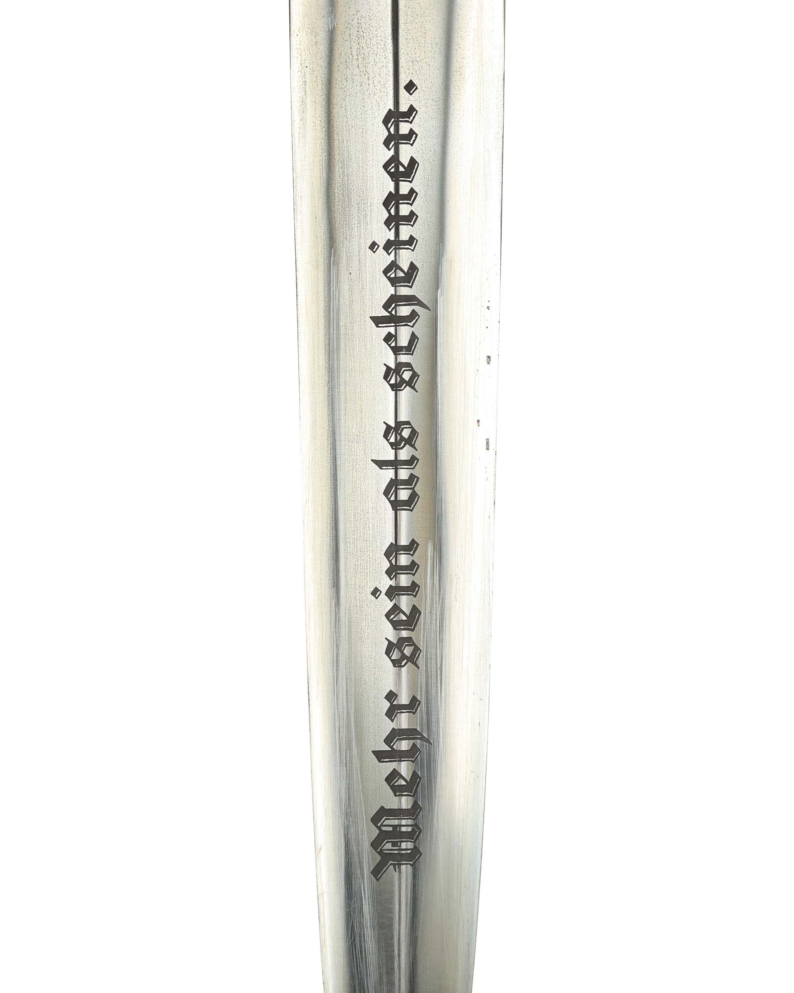 Klinge: Die Klinge ist avers und revers gereinigt. Auf der Vorderseite der Klinge befindet sich die typische NPEA Devise mit der Inschrift: Mehr sein als scheinen. Auf der Rückseite befindet sich das Vertreiberlogo von Karl Burgsmüller Berlin. Die Klingenschultern passen perfekt zu der unteren Parierstange.