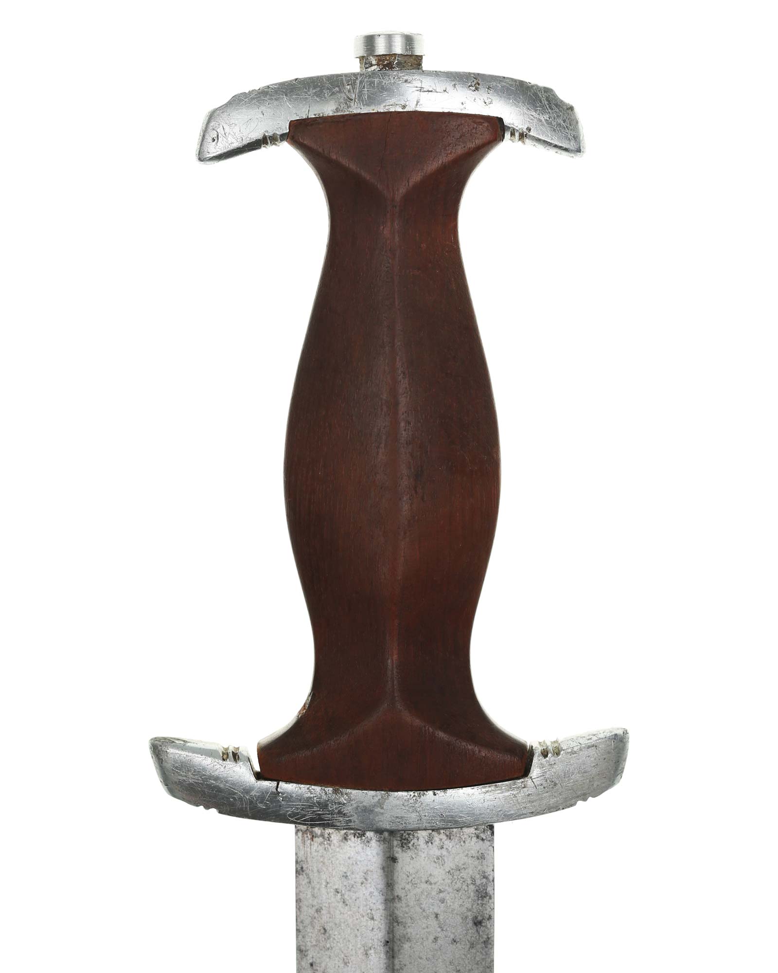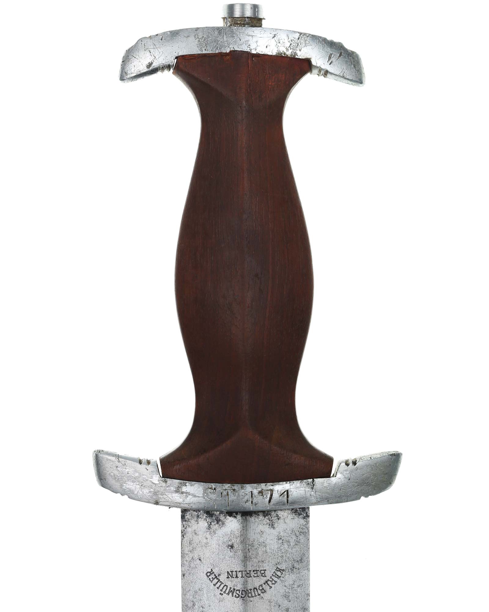 Griff: Brauner Holzgriff. Beide Parierstangen und die Griffschraube sind aus Aluminium. Untere Parierstange mit Schulkürzel ST 171 (NPEA Schule Stuhm).