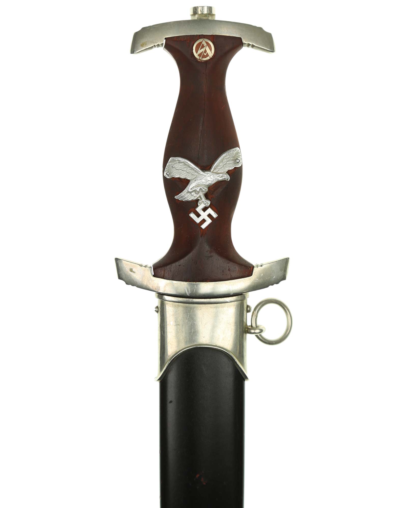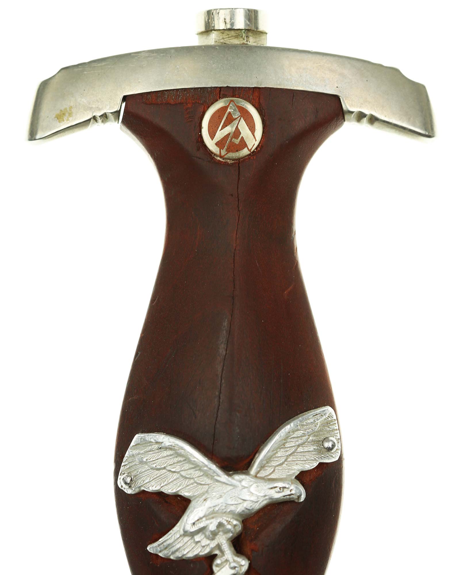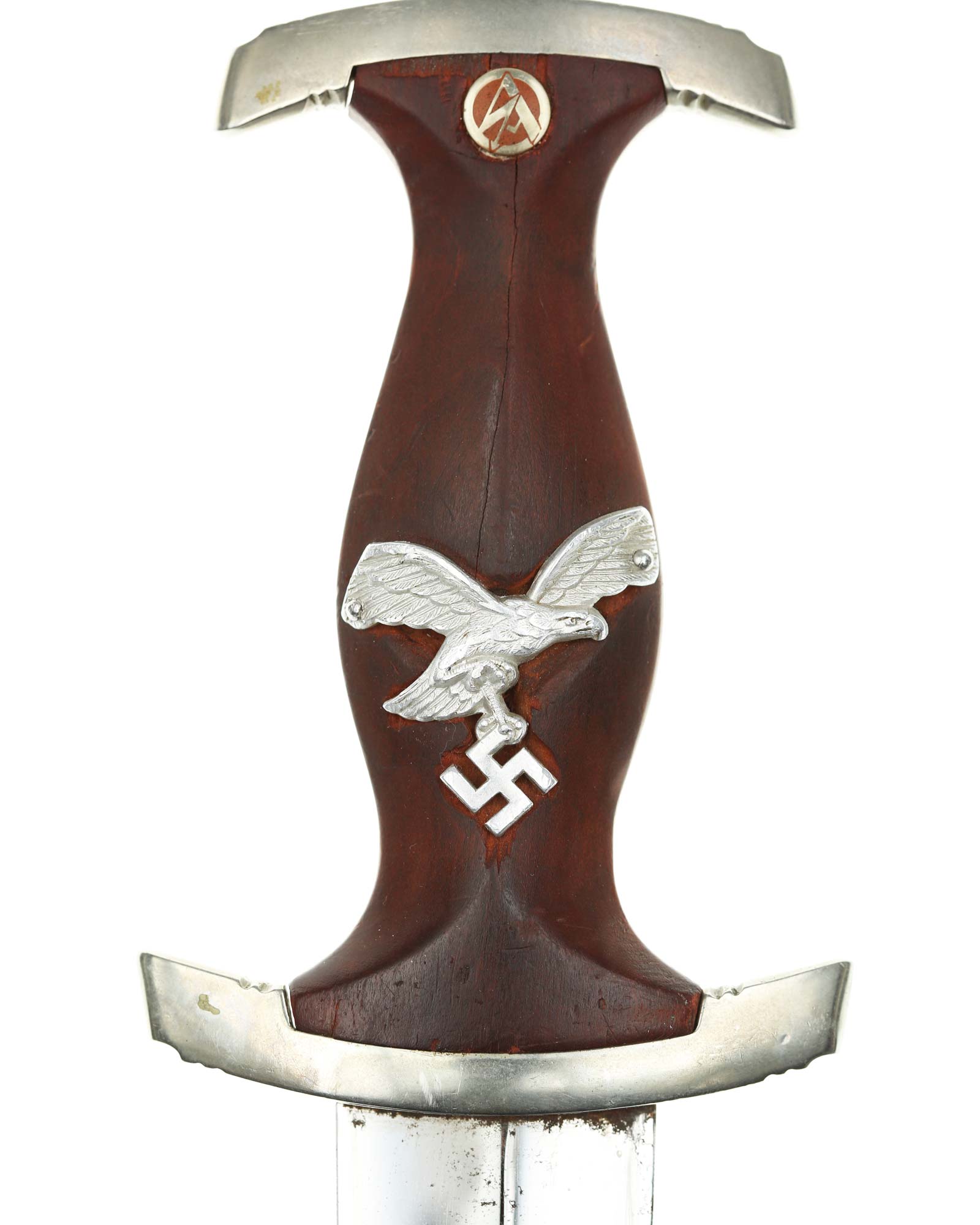 Griff: Brauner Holzgriff mit nachträglich angebrachtem Luftwaffen-Adler aus Aluminium, darüber befindet sich das SA-Emblem. Beide Parierstangen sind aus Nickel. Die untere Parierstange ist auf der Rückseite mit dem Gruppenstempel P handgestanzt.