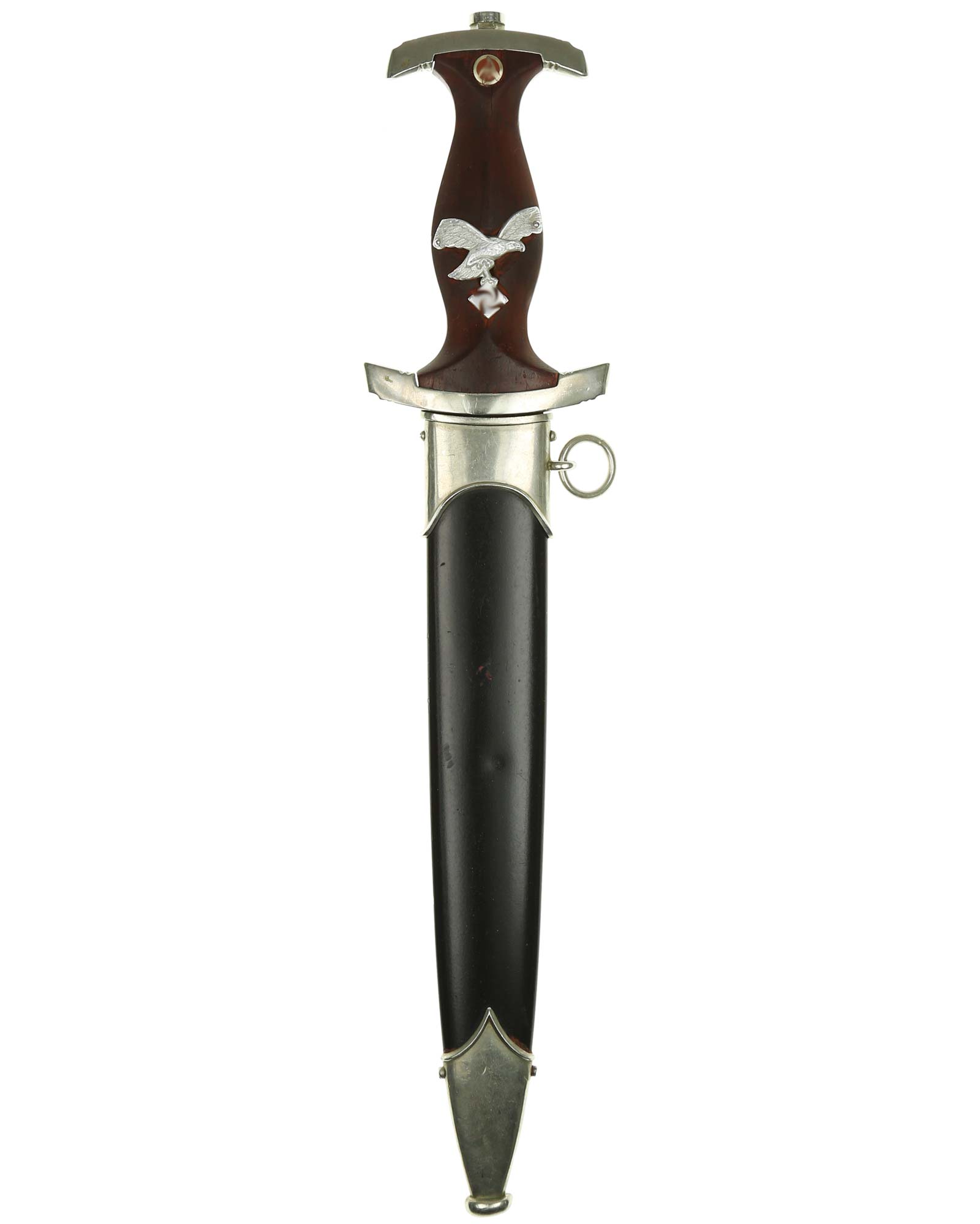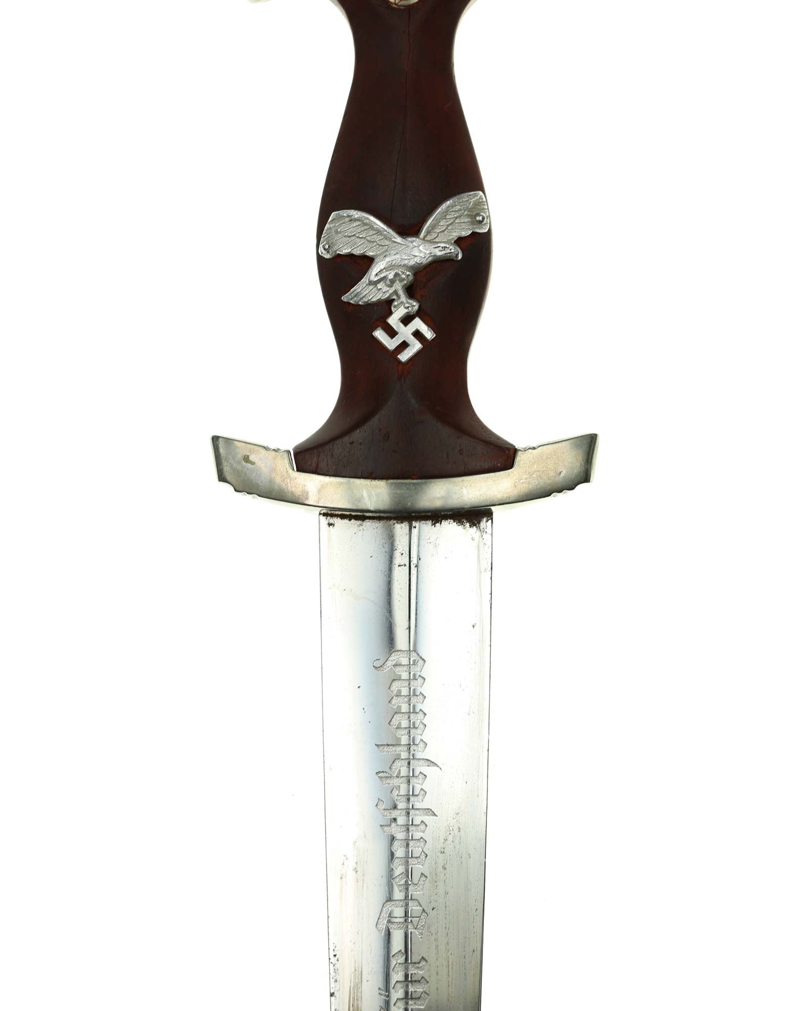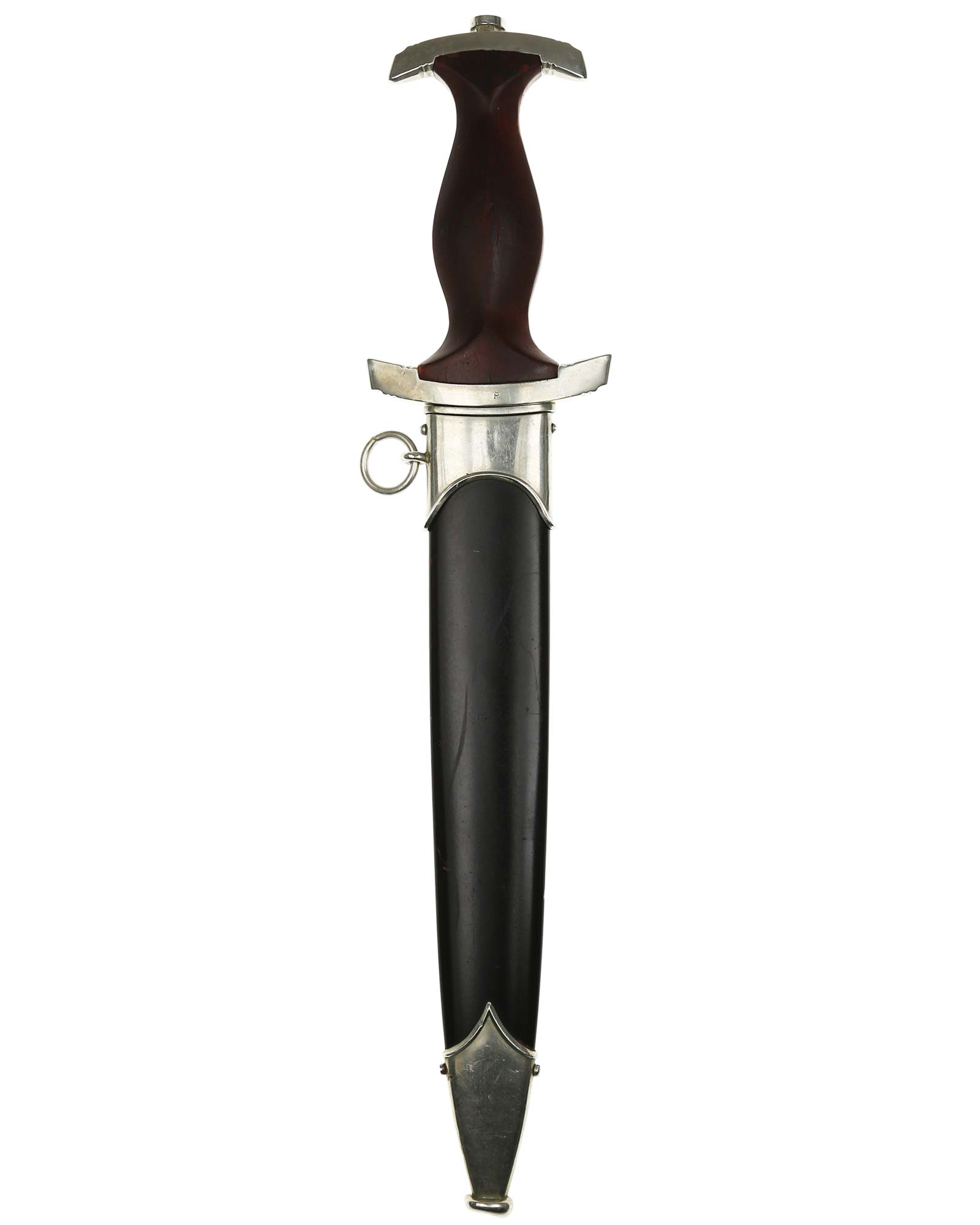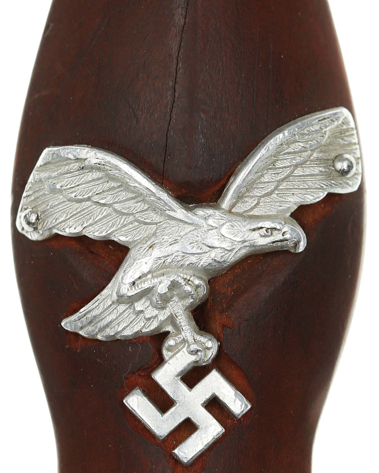 Griff: Brauner Holzgriff mit nachträglich angebrachtem Luftwaffen-Adler aus Aluminium, darüber befindet sich das SA-Emblem. Beide Parierstangen sind aus Nickel. Die untere Parierstange ist auf der Rückseite mit dem Gruppenstempel P handgestanzt.