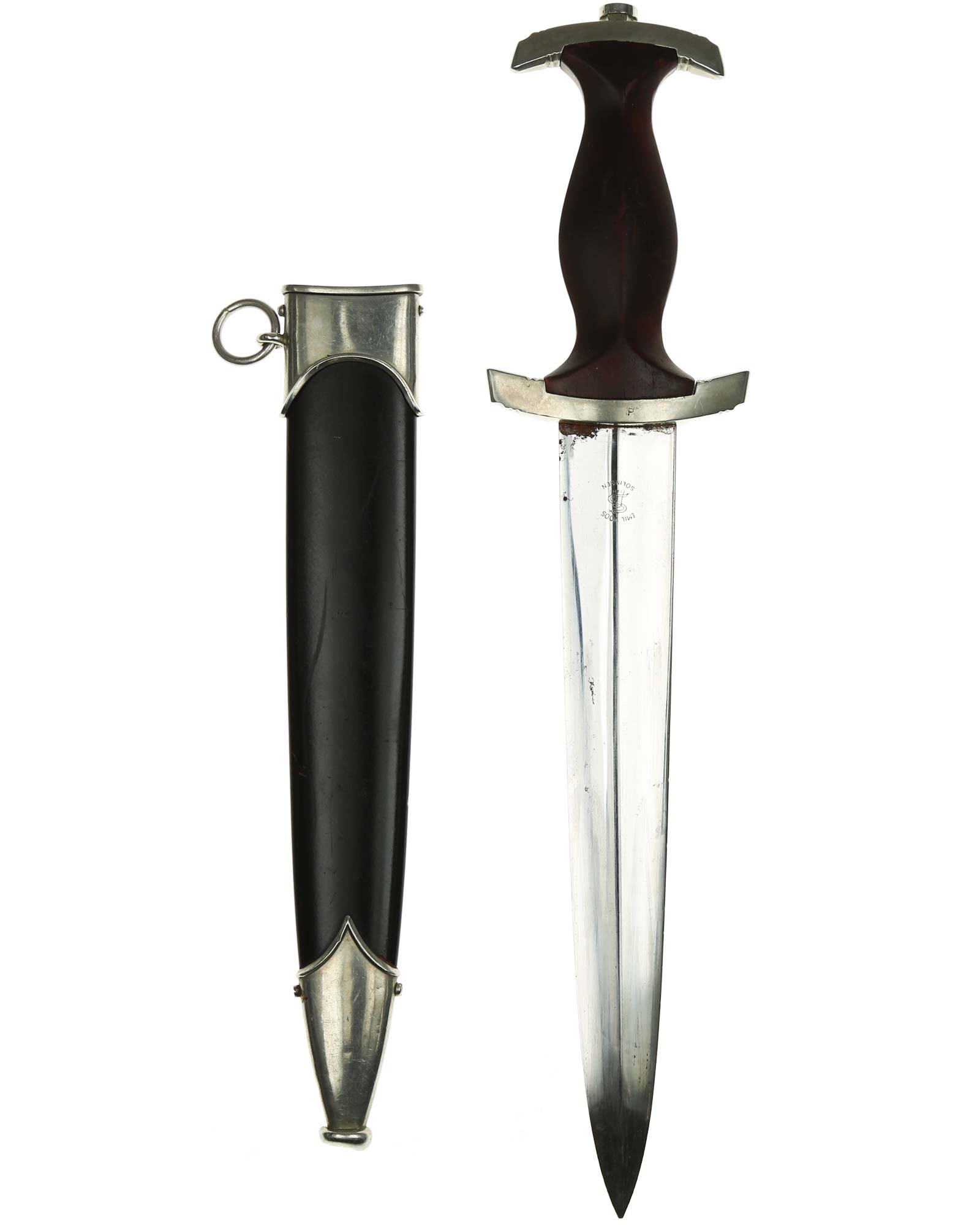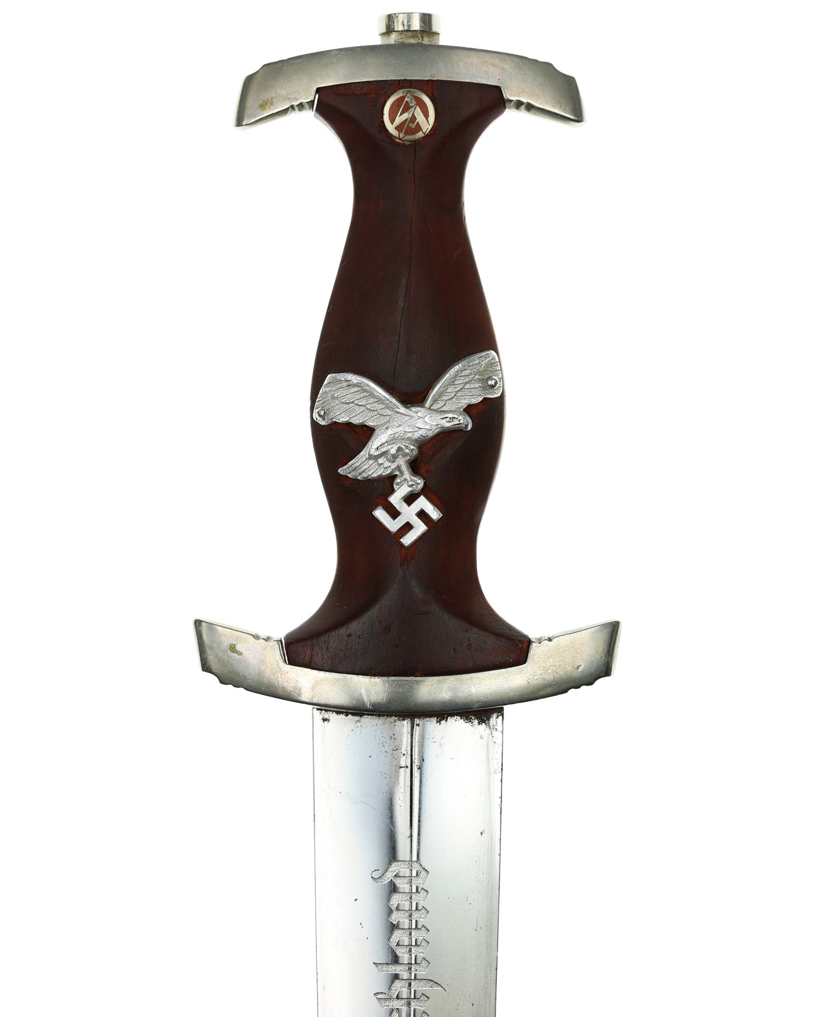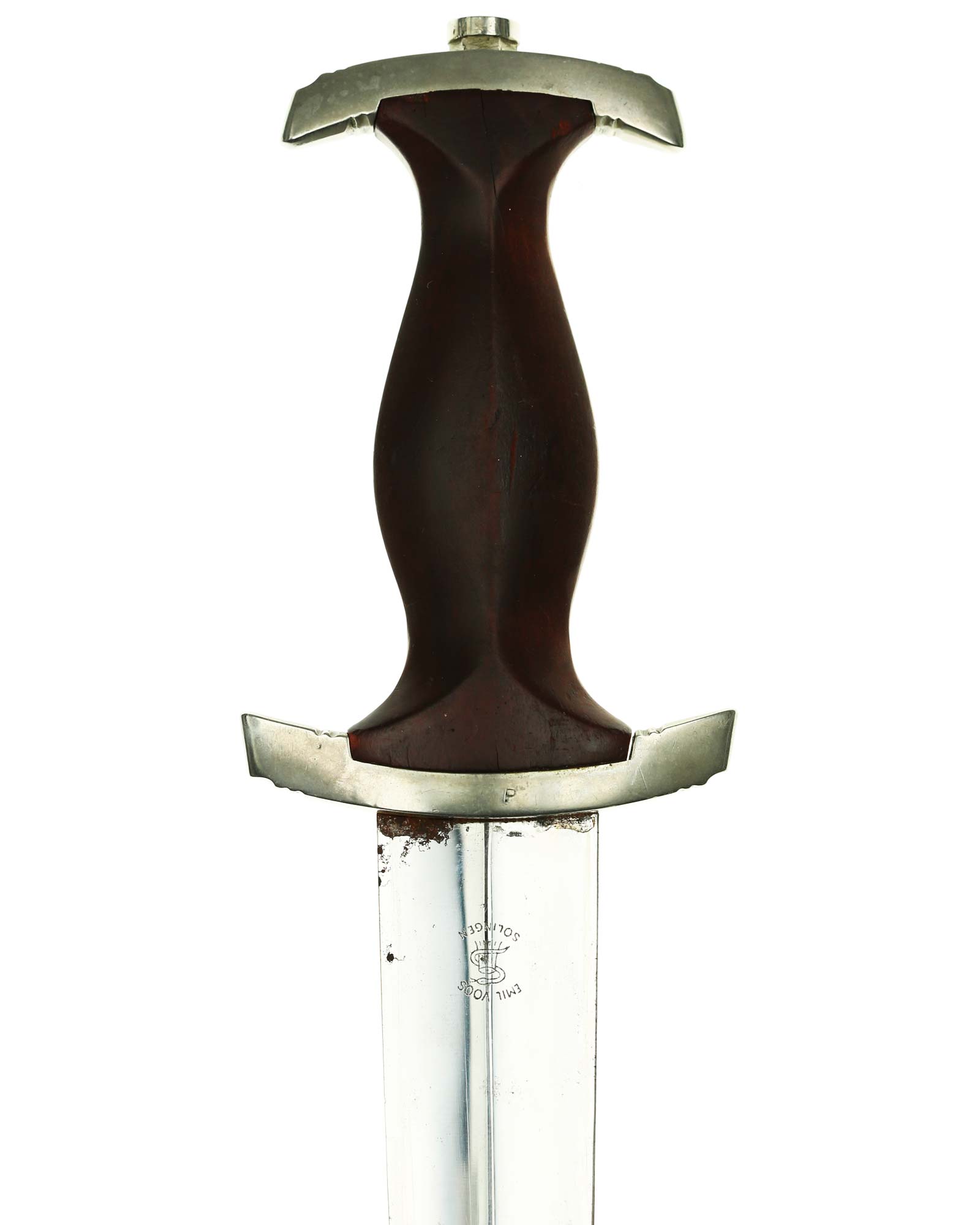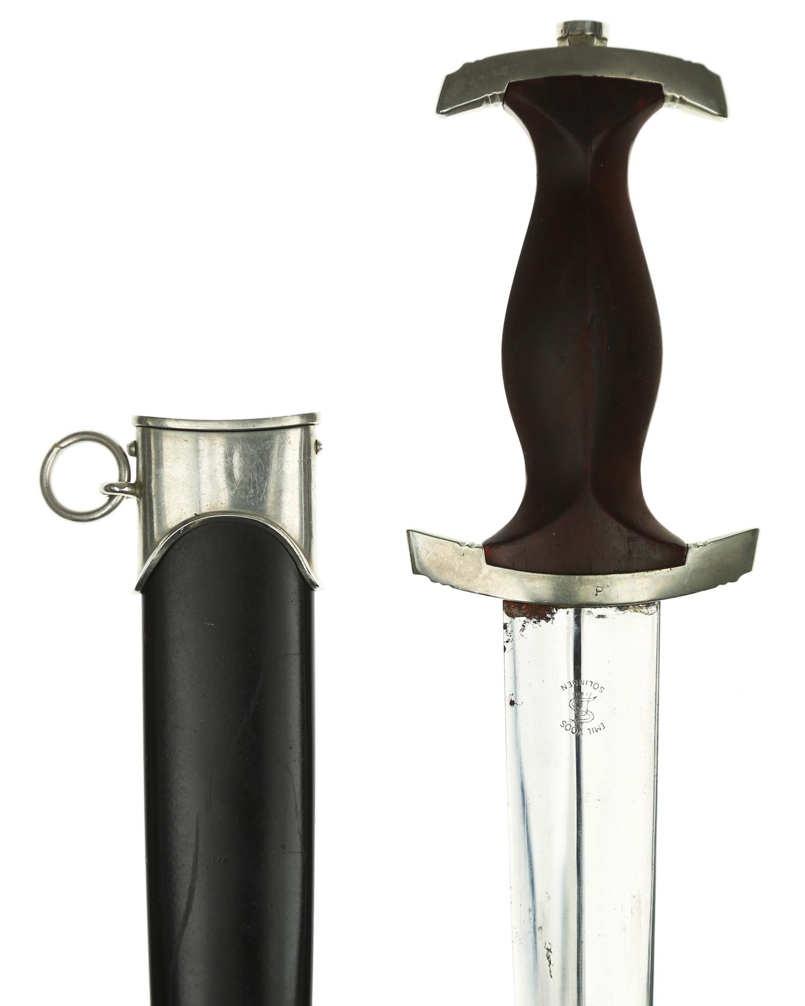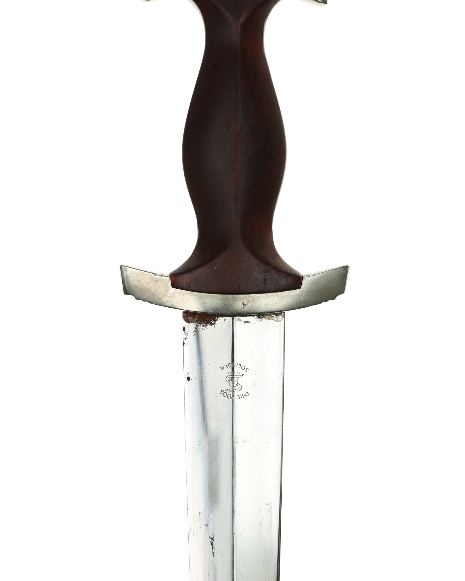 Klinge: Auf der Vorderseite der Klinge befindet sich die SA Devise, mit der Inschrift: Alles für Deutschland. Auf der Rückseite befindet sich das Herstellerlogo Emil Voos Solingen.