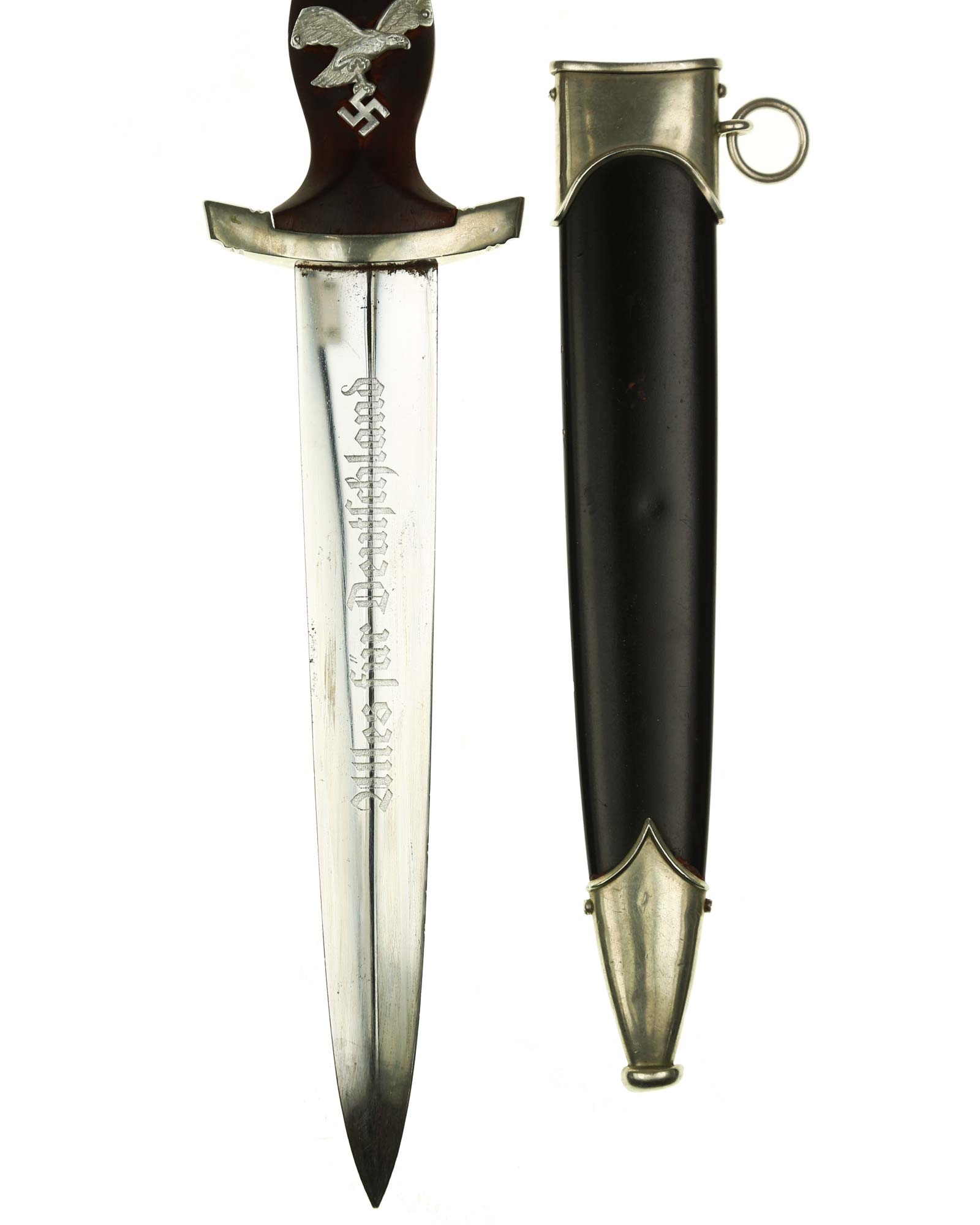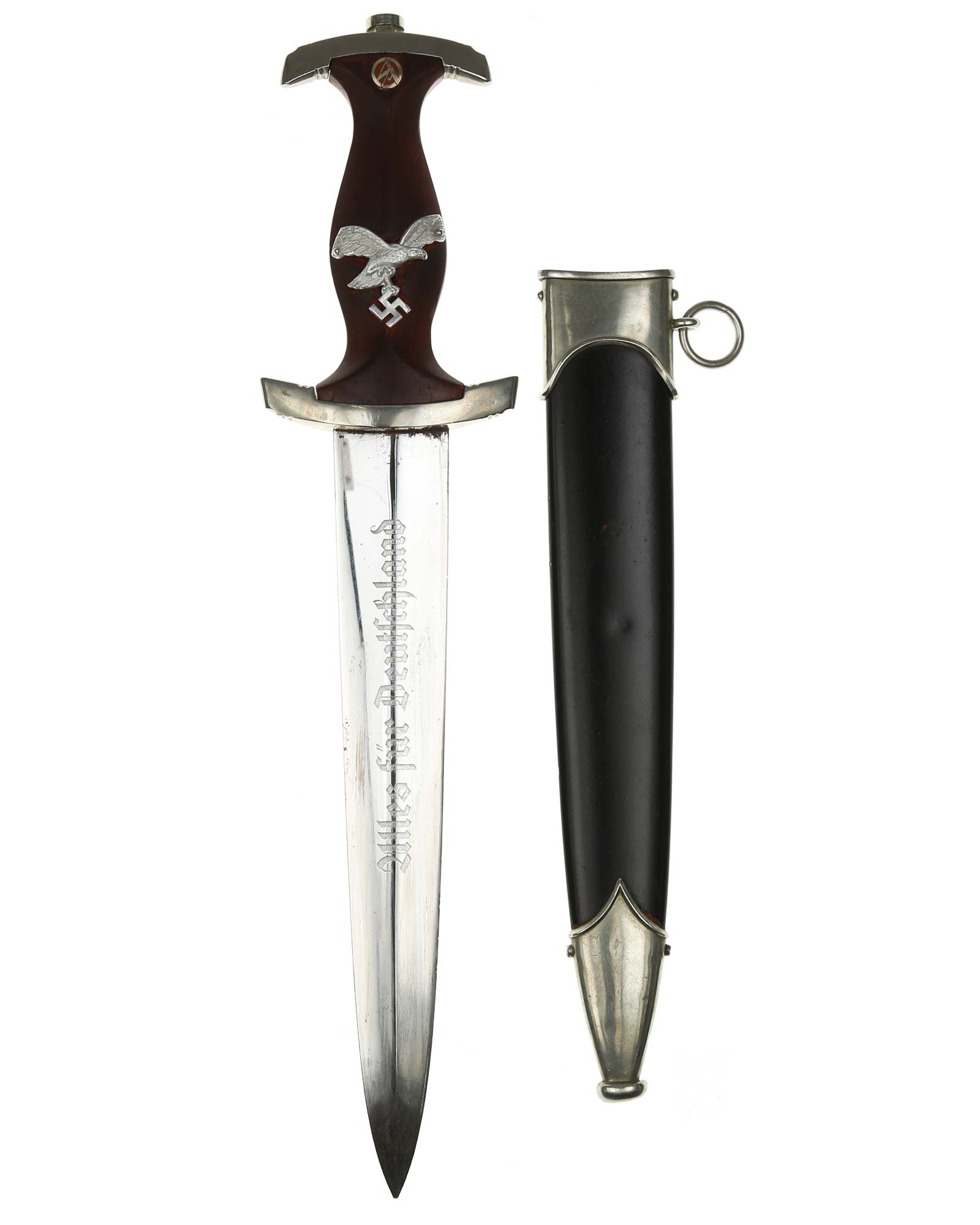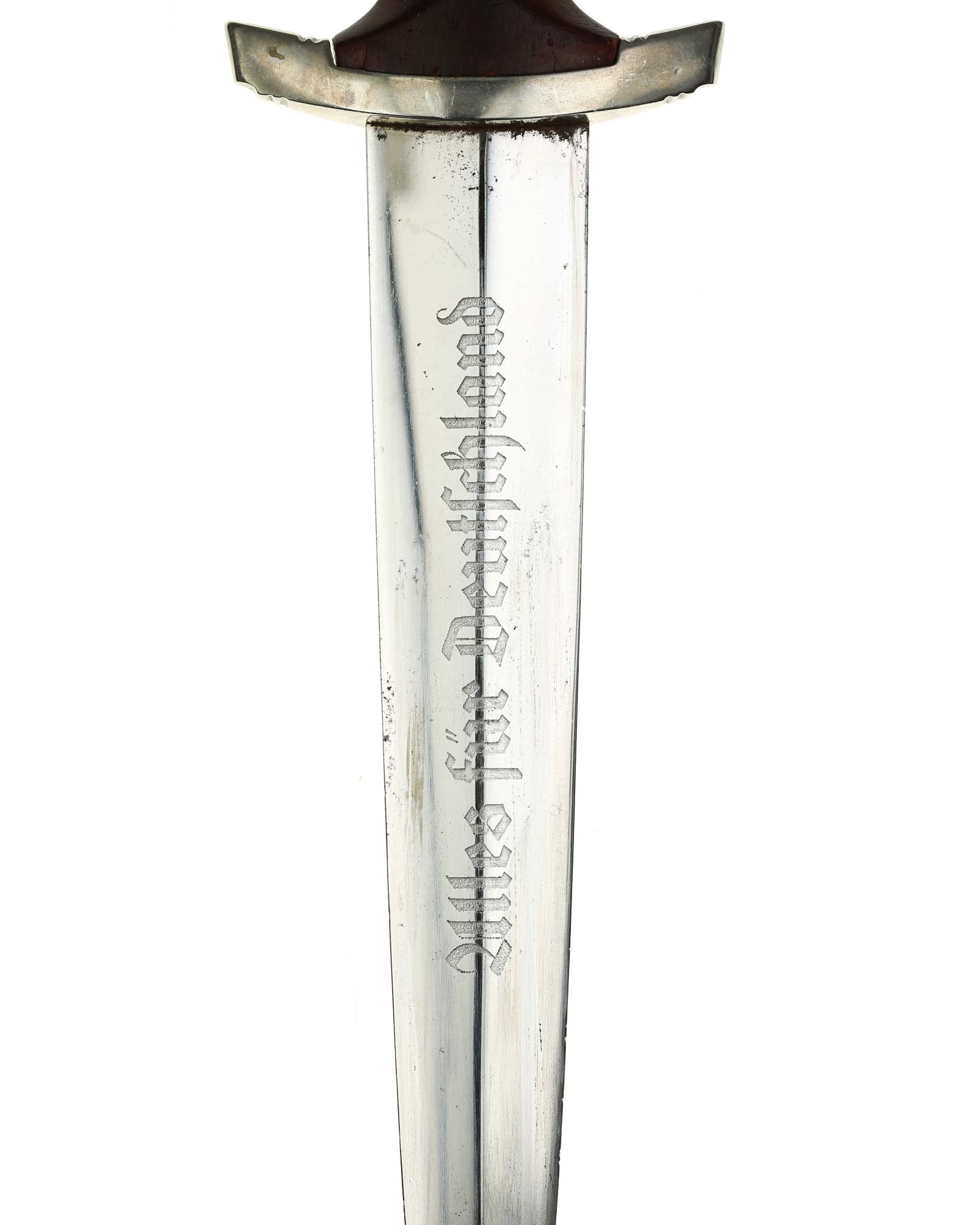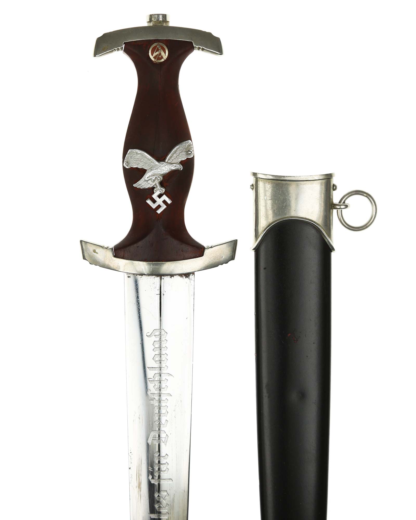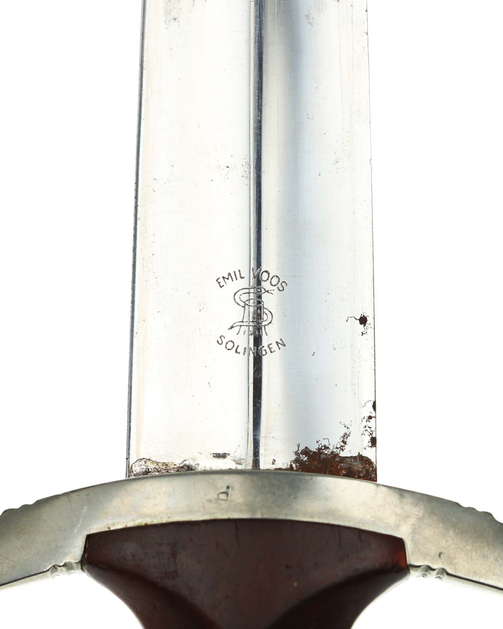 Klinge: Auf der Vorderseite der Klinge befindet sich die SA Devise, mit der Inschrift: Alles für Deutschland. Auf der Rückseite befindet sich das Herstellerlogo Emil Voos Solingen.