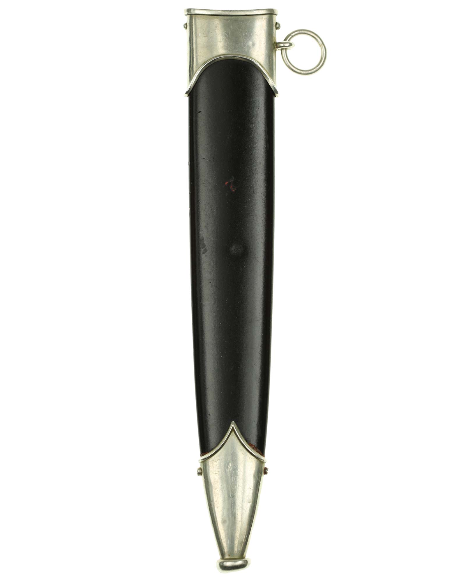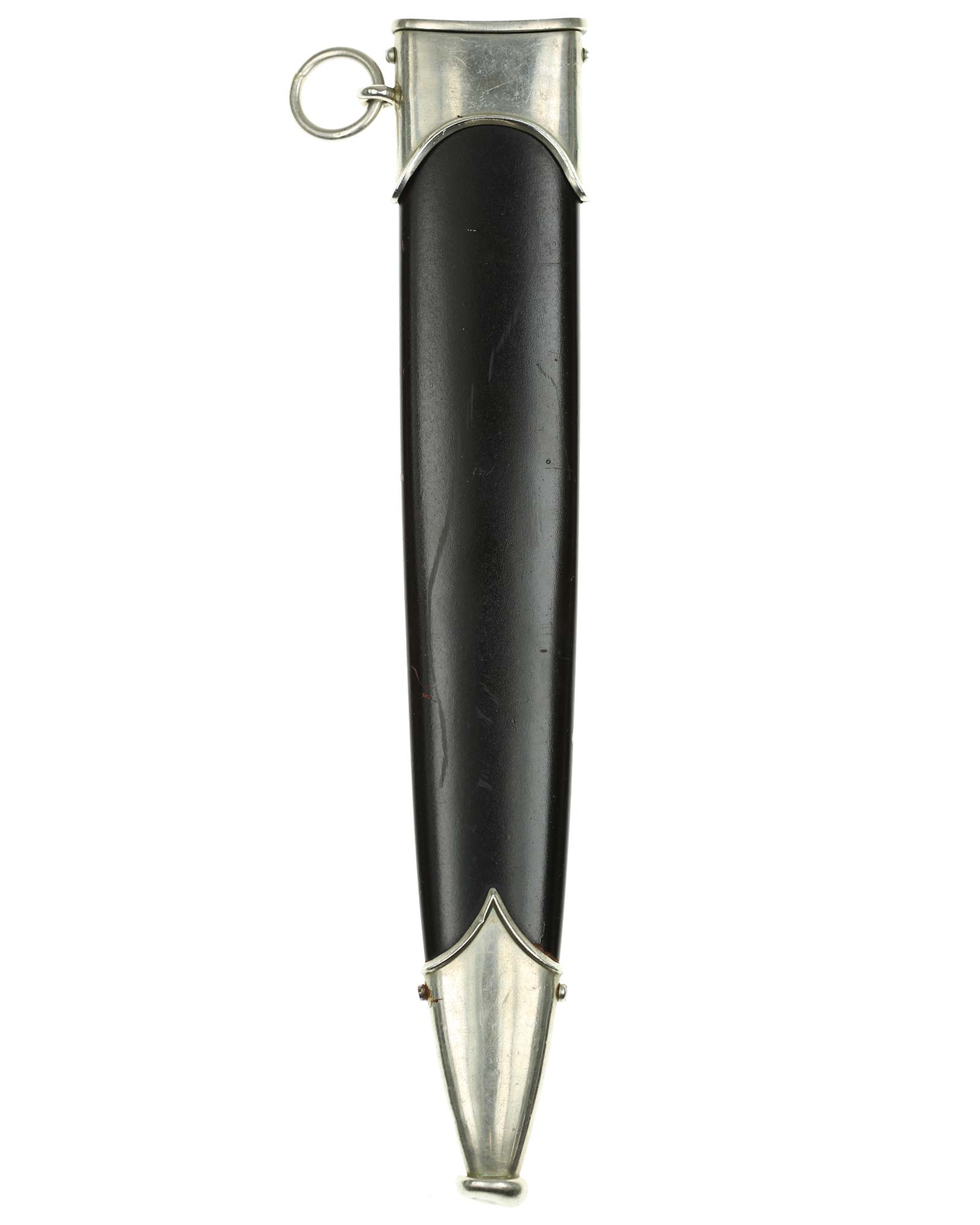 Scheide: Die Scheide ist aus Eisen und mit schwarzer Lackierung. Die Beschläge werden mit jeweils zwei Schräubchen seitlich gehalten. Am oberen Beschlag befindet sich der Ring für das Tragegehänge.