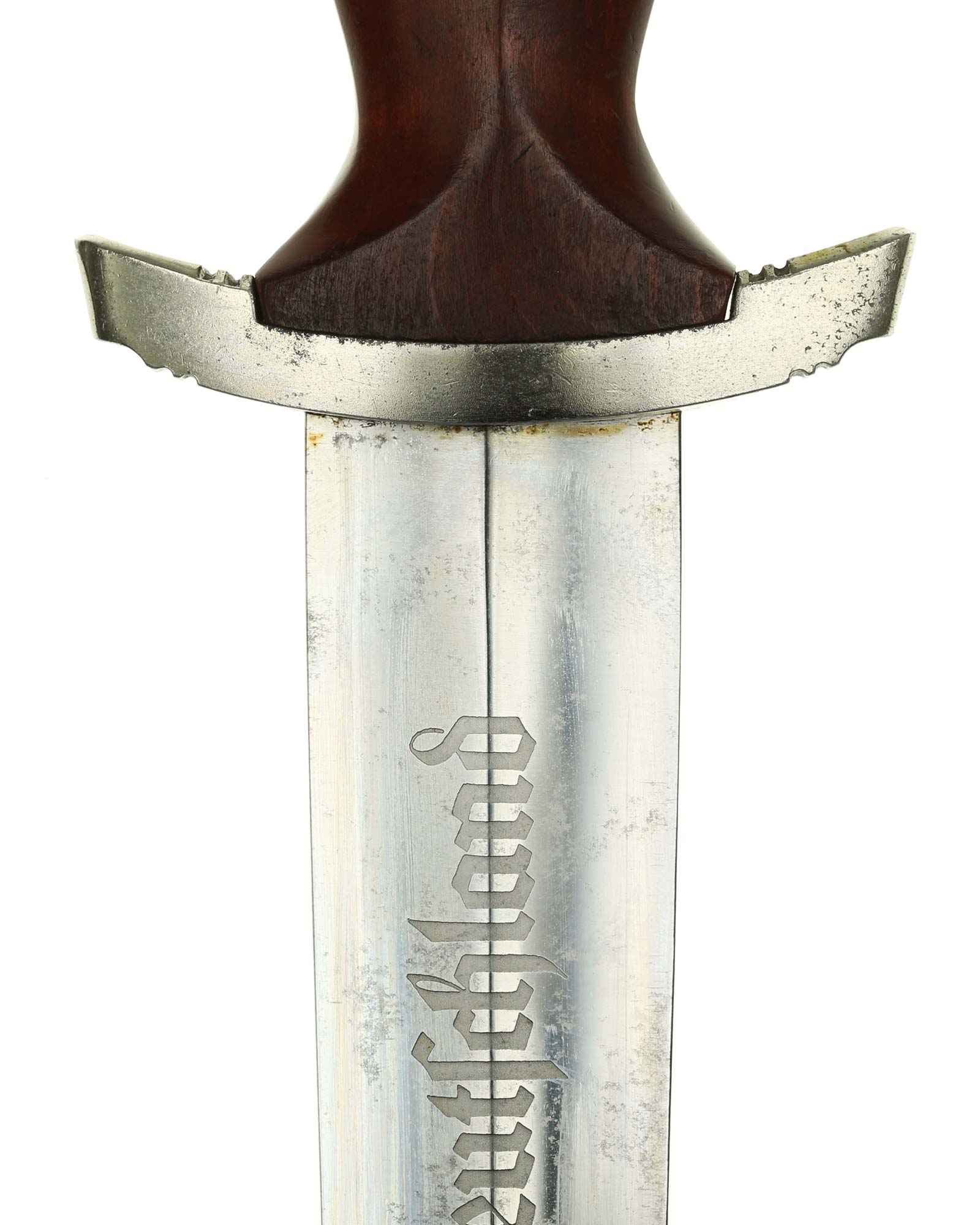 Klinge: Die Klinge ist blank. Die SA Devise «Alles für Deutschland» ist tief und zackig. Auf der Rückseite befindet sich das RZM Herstellerlogo: RZM M7/12 - Weyersberg Max Waffenfabrik (WMW), Solingen. Die Schultern der Klinge passen perfekt zu der oberen Parierstange, ohne Zwischenraum dazwischen.