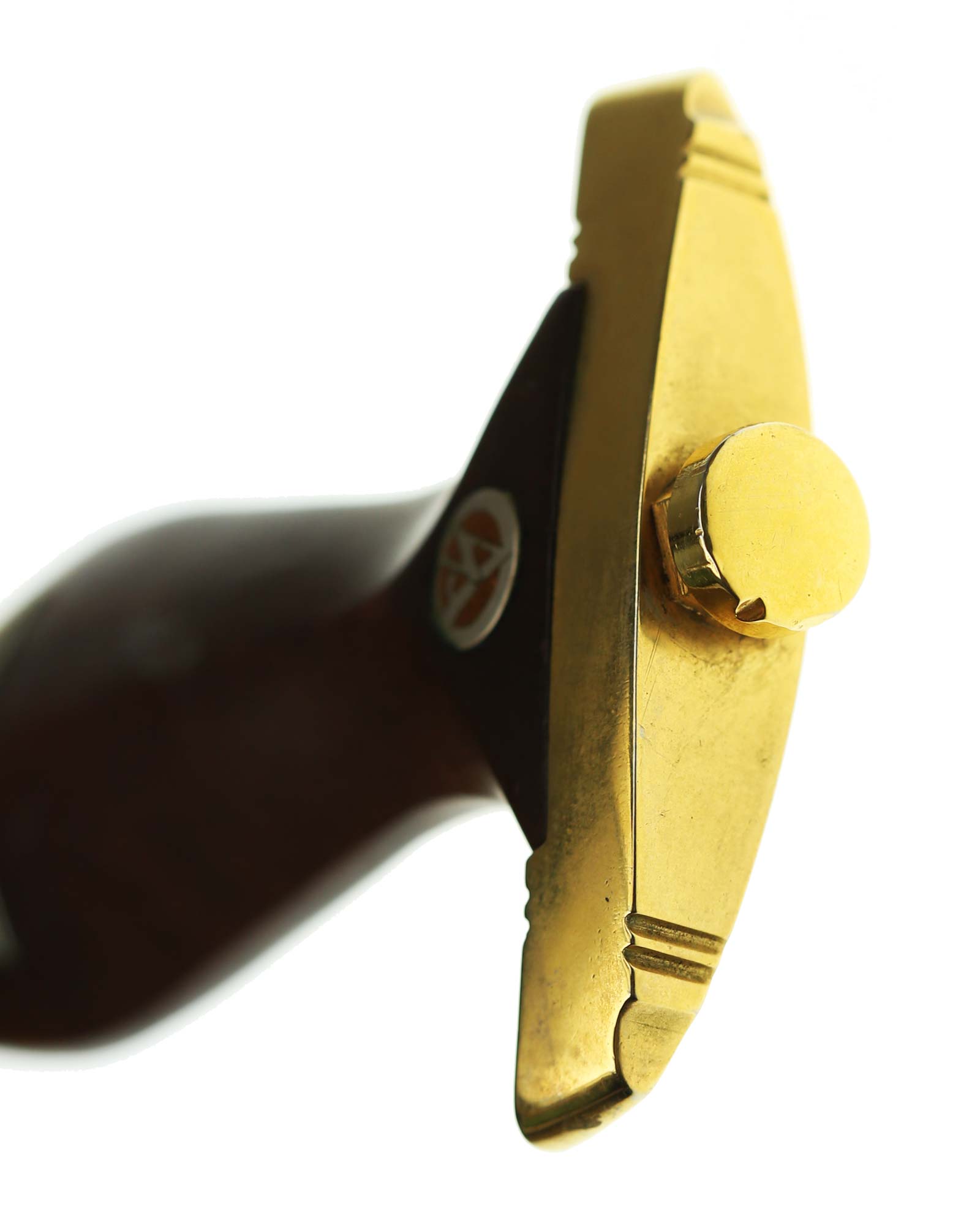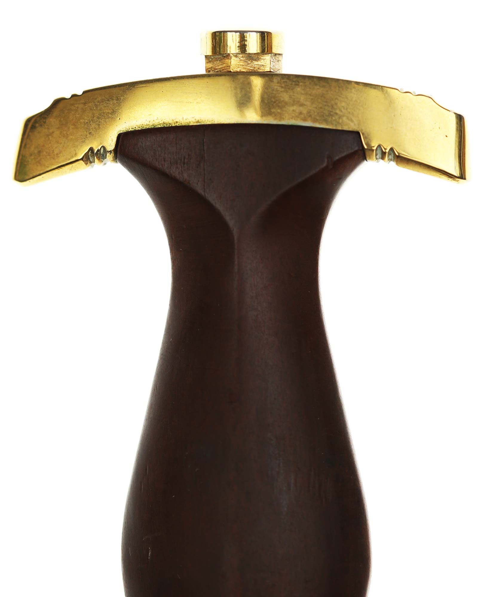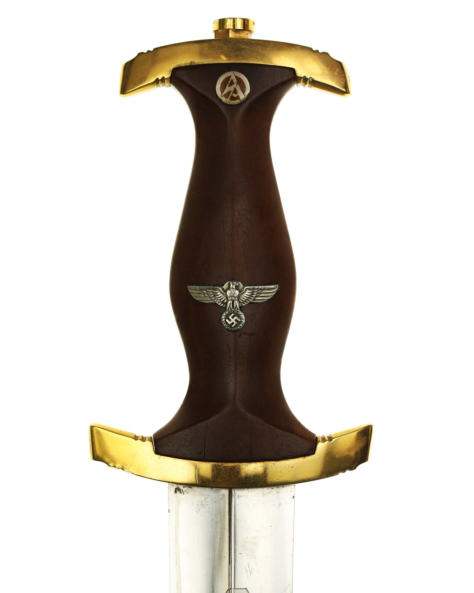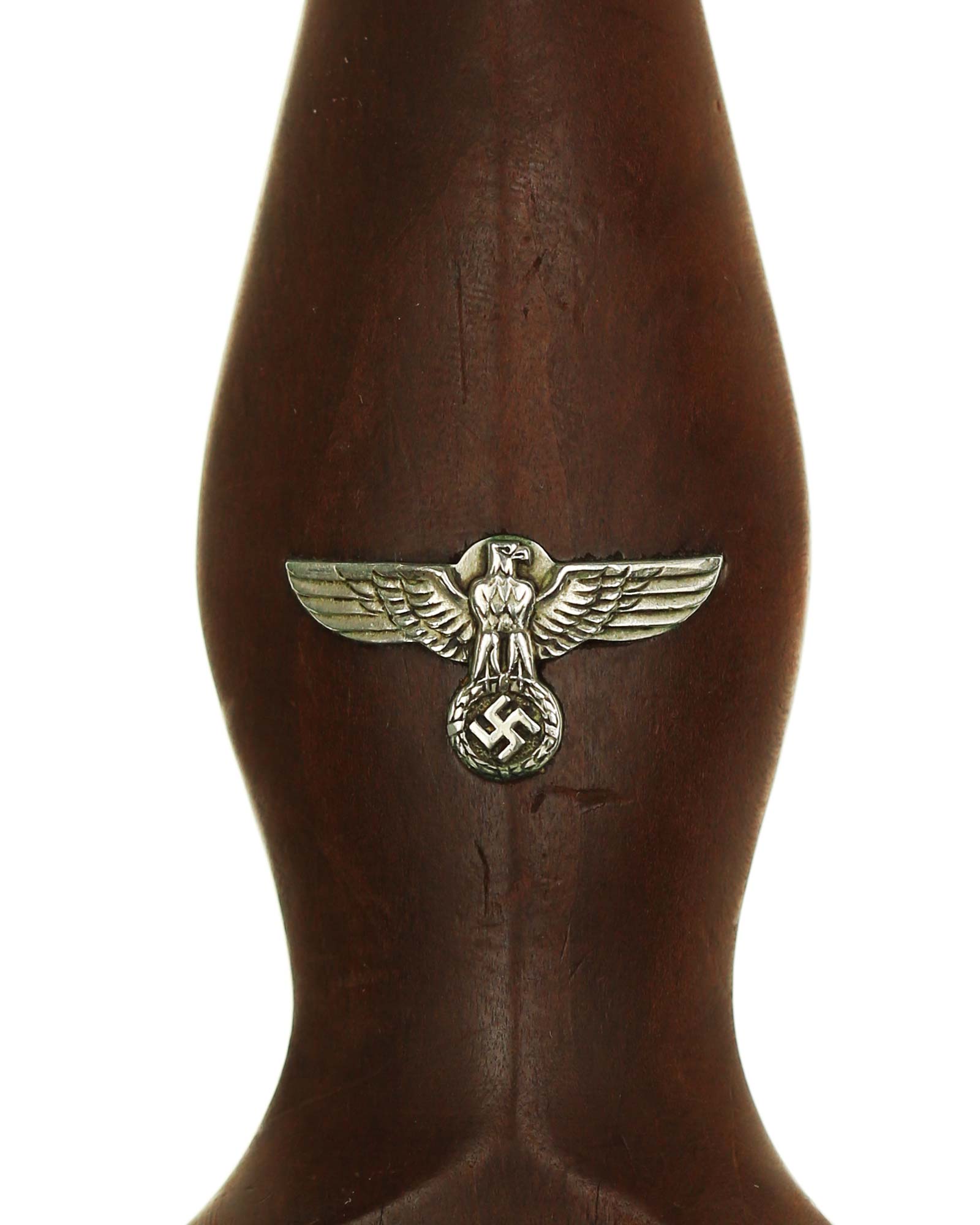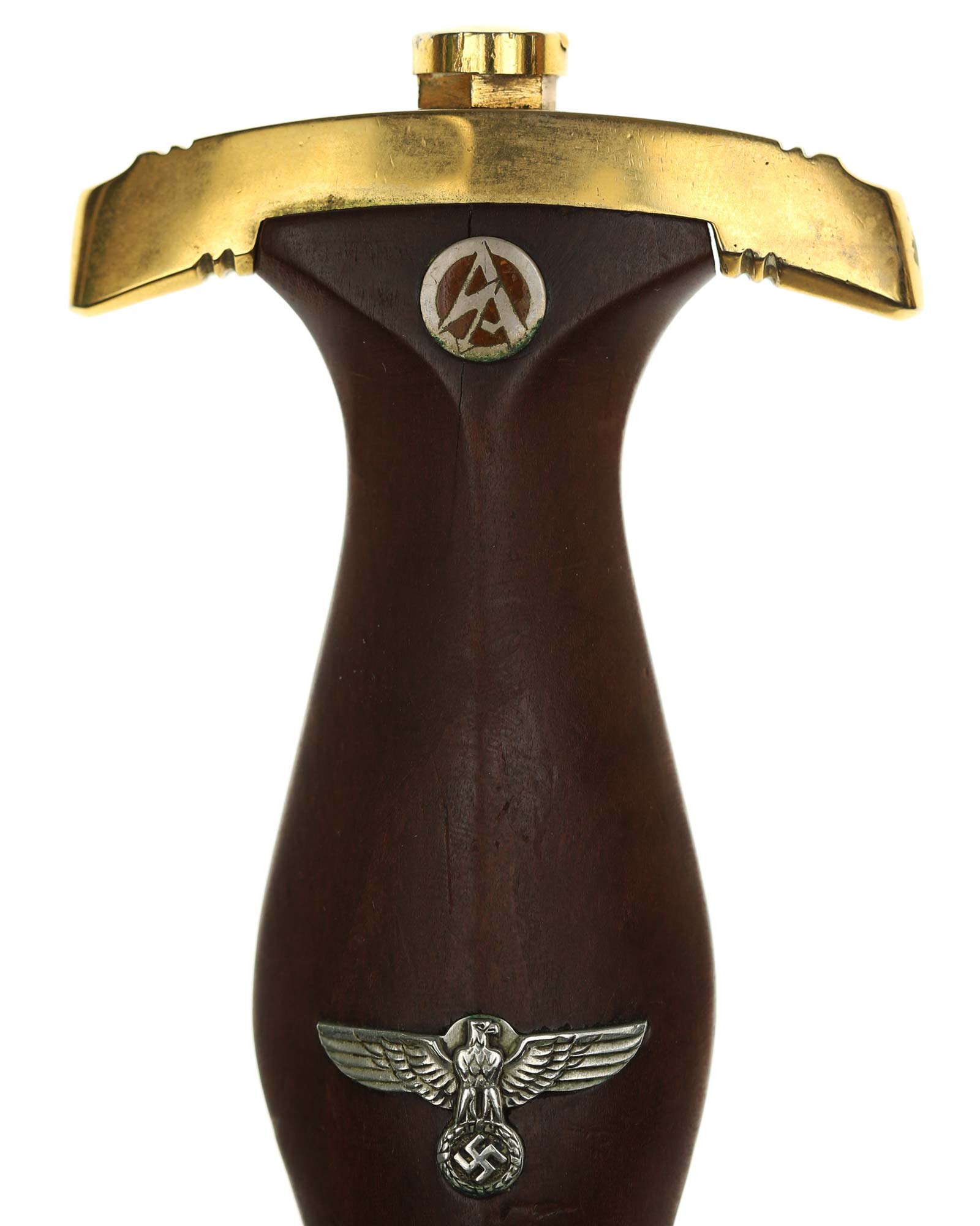 Griff: Brauner Holzgriff, mit Hoheitsadler im Griff, darüber befindet sich das emaillierte SA-Emblem, diese sind innen geklammert.