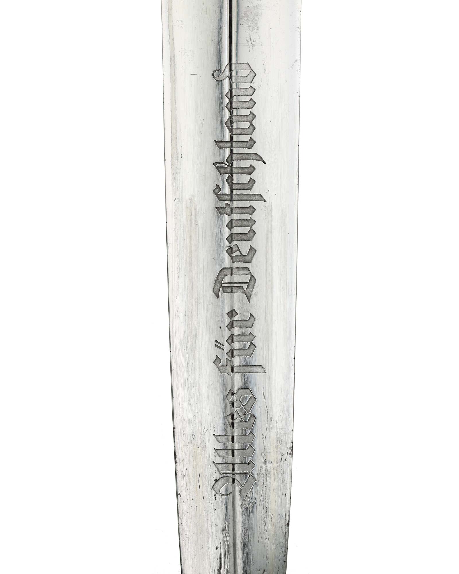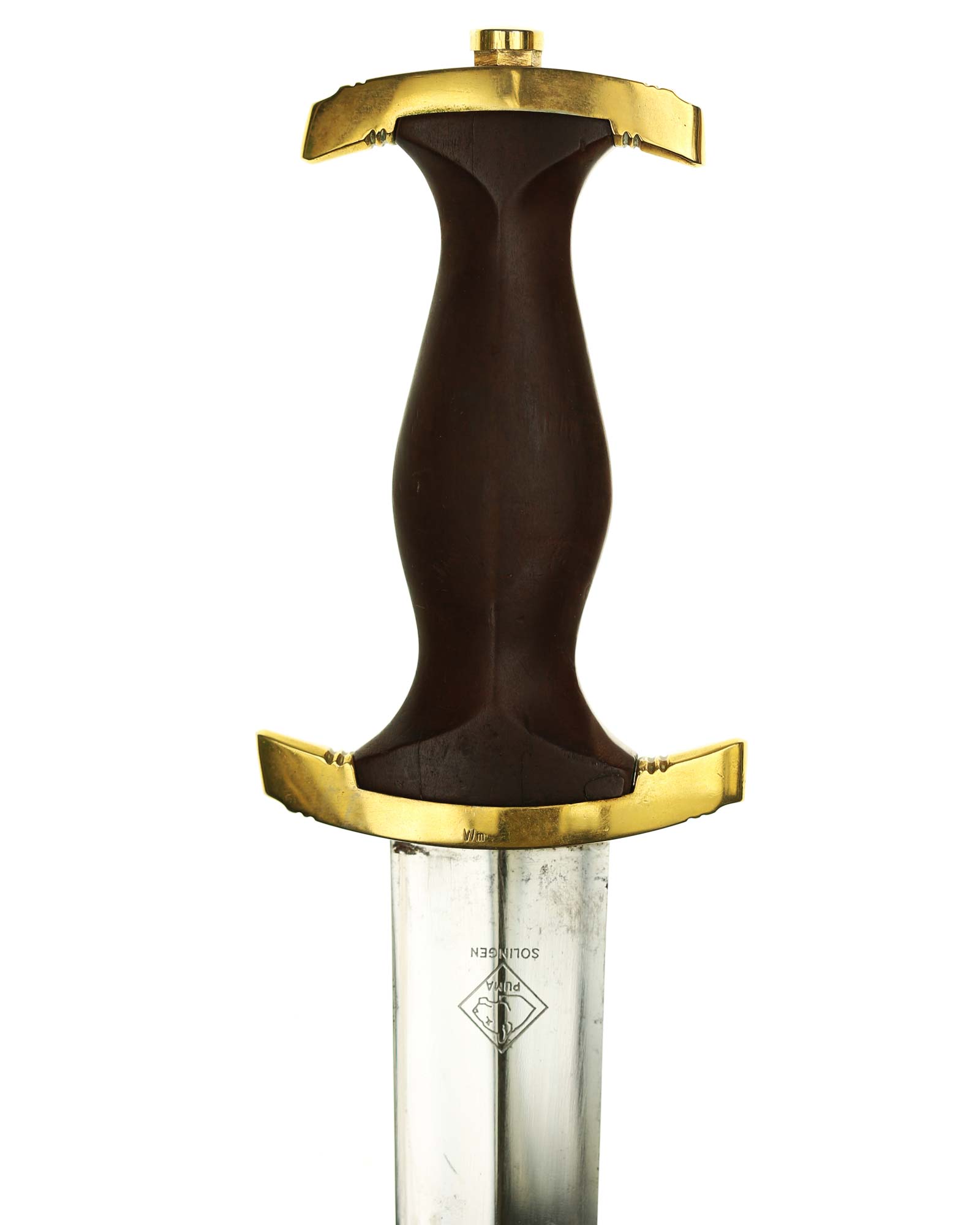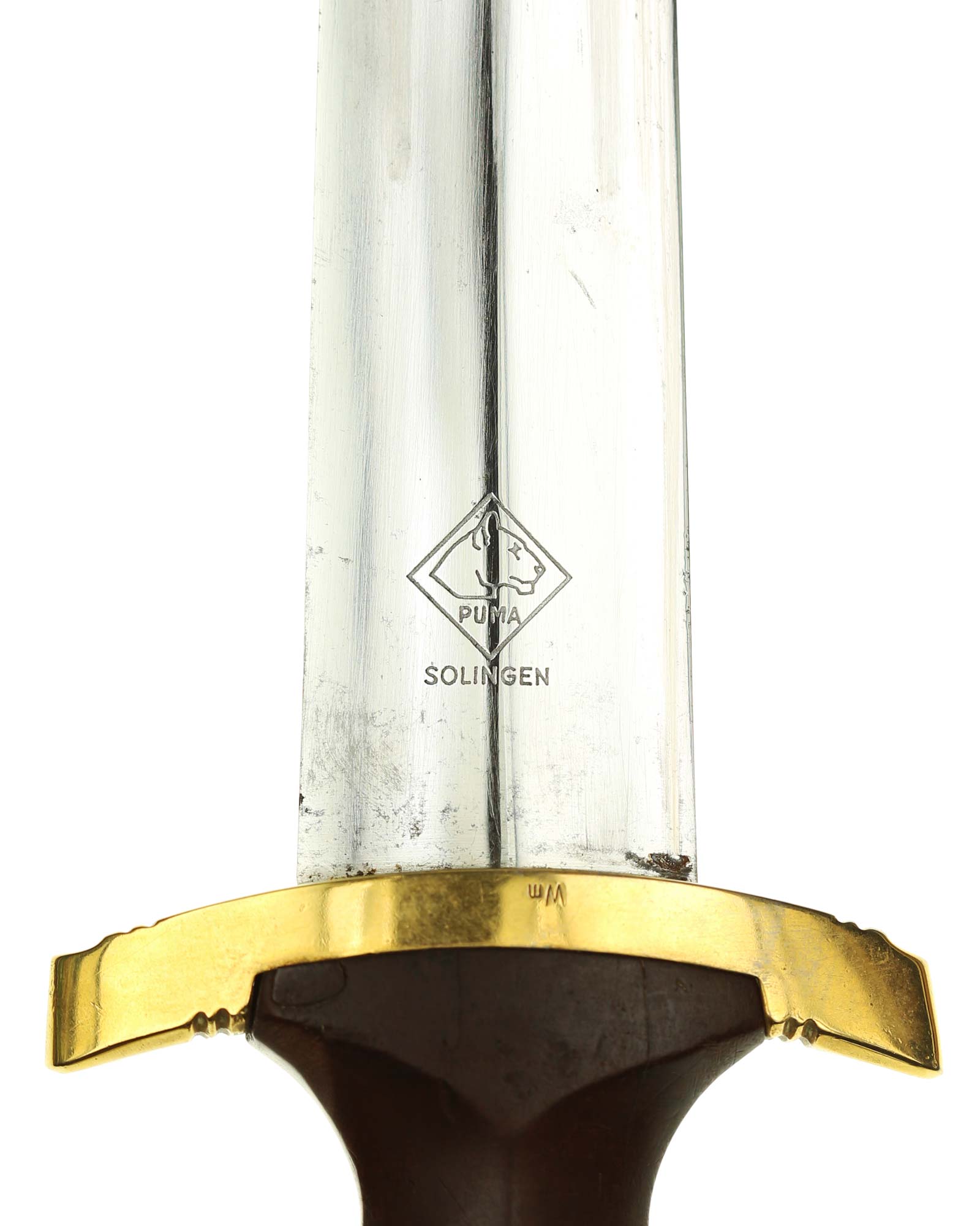 Klinge: Die Klinge ist in einem sehr guten Zustand bzw. blank. Auf der Vorderseite der Klinge befindet sich die SA Devise mit der Inschrift: Alles für Deutschland, Rückseite mit Hersteller: Puma Solingen. Klingenschultern perfekt auf die untere Parierstange angepasst.