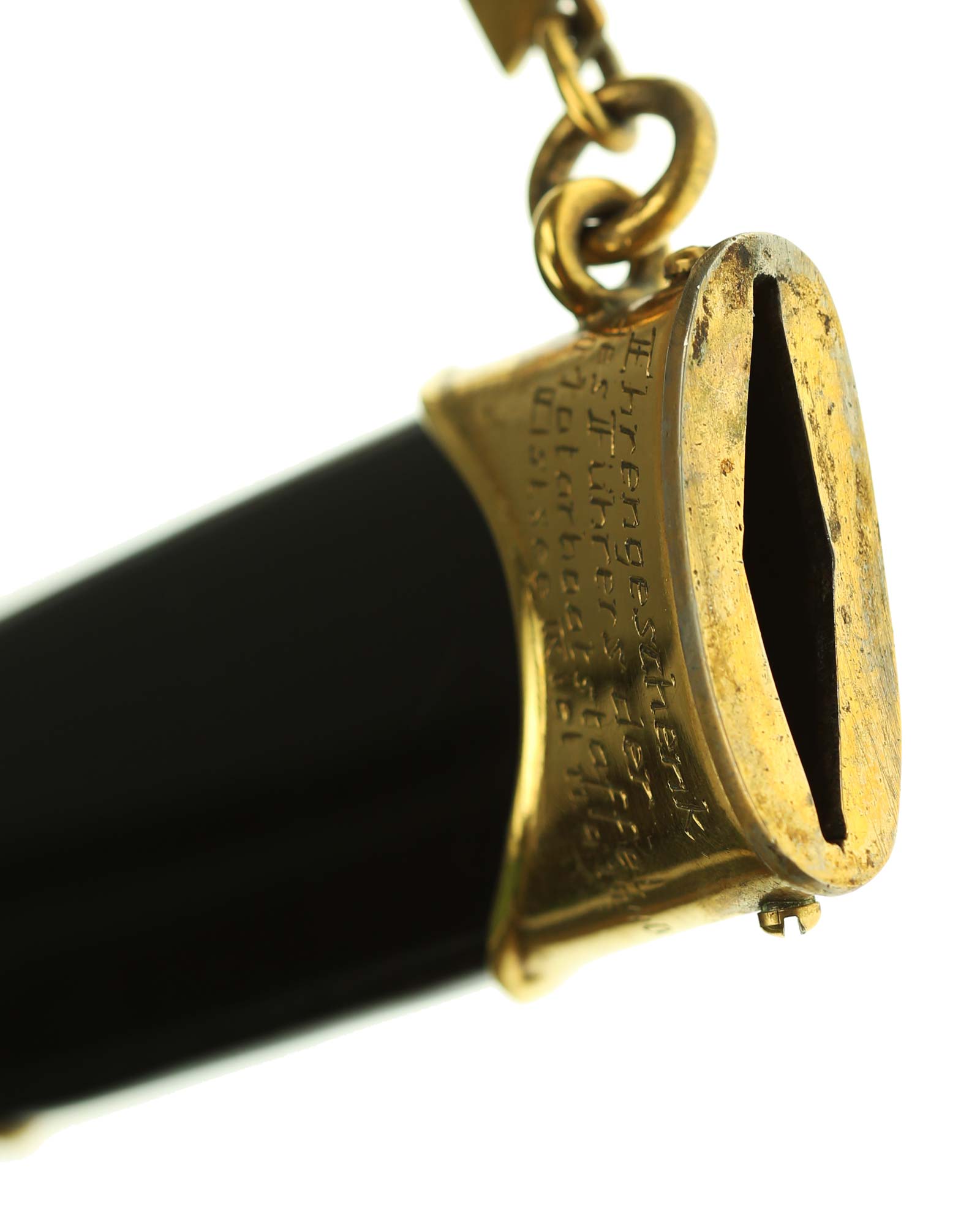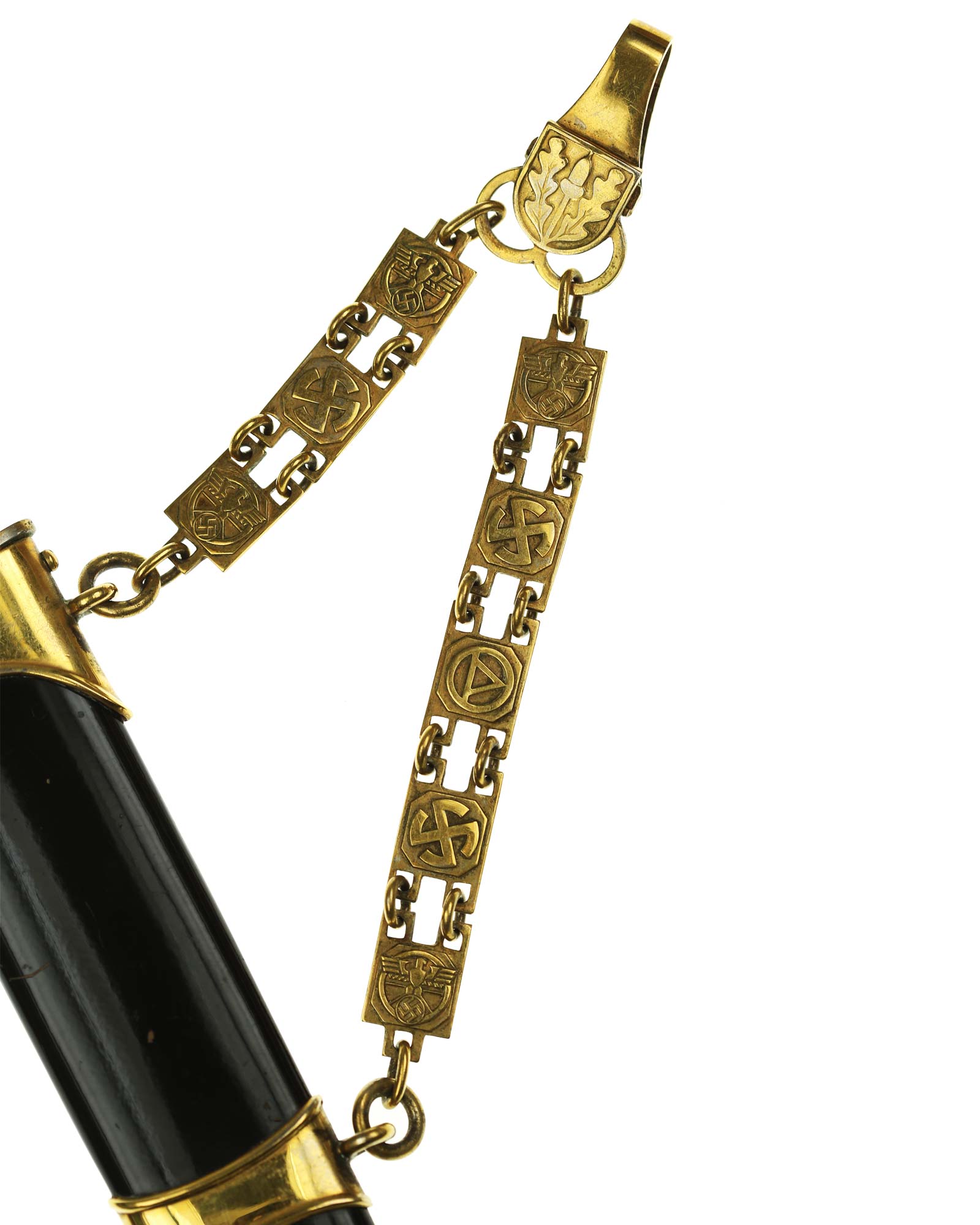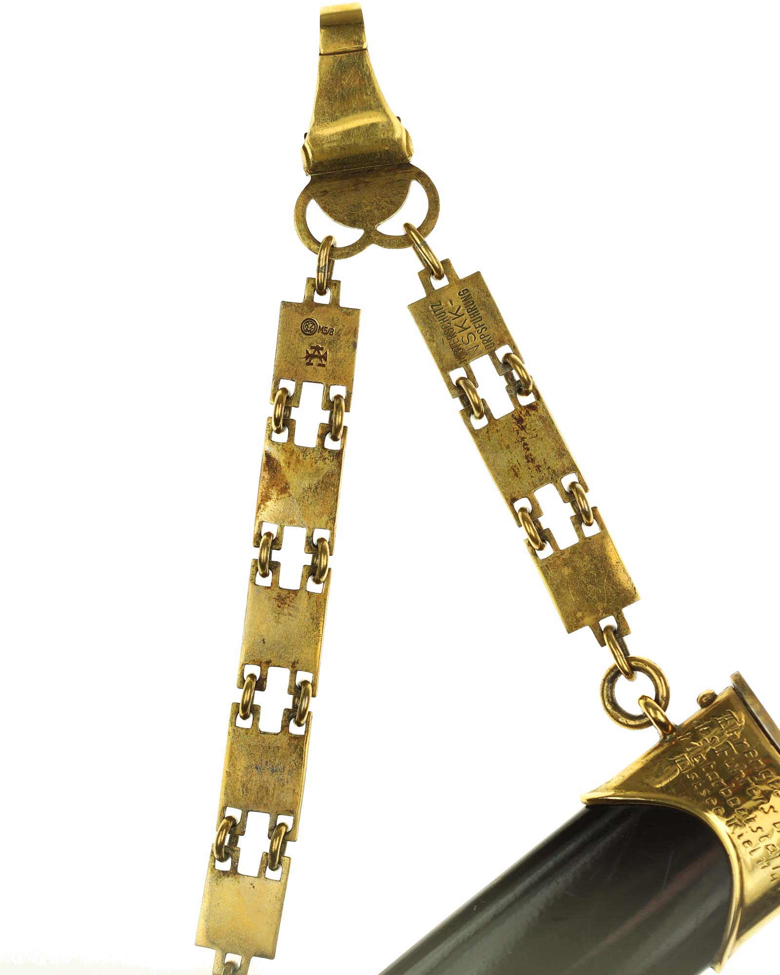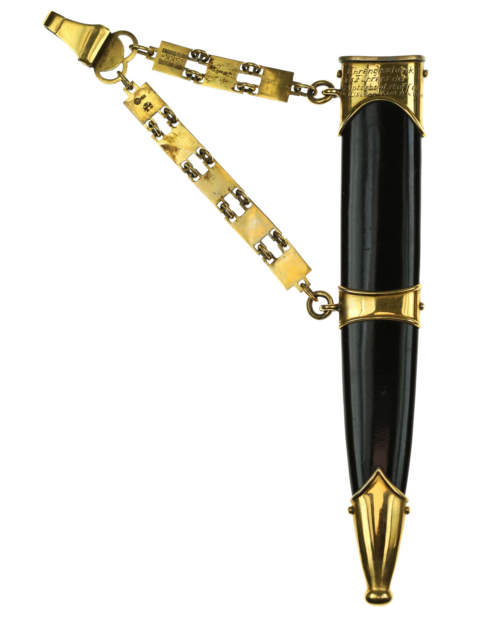 Scheide: Die Scheide ist aus Eisen und mit schwarzer Lackierung. Die Kette ist magnetisch. Die Beschläge werden mit Schräubchen seitlich gehalten. Kettengehänge mit 4+5 Kettenglieder. Oberer Beschlag mit Ehrenwidmung.