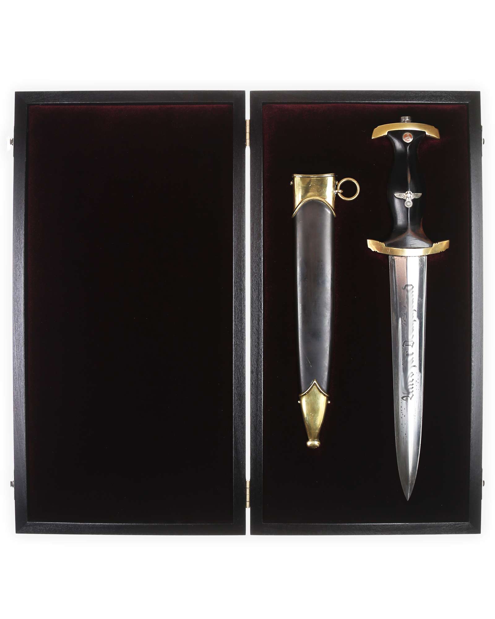Klinge: Auf der Vorderseite der Klinge befindet sich die SA Devise, mit der Inschrift: Alles für Deutschland. Auf der Rückseite befindet sich das Herstellerlogo Gebrüder Heller Schmalkalden.