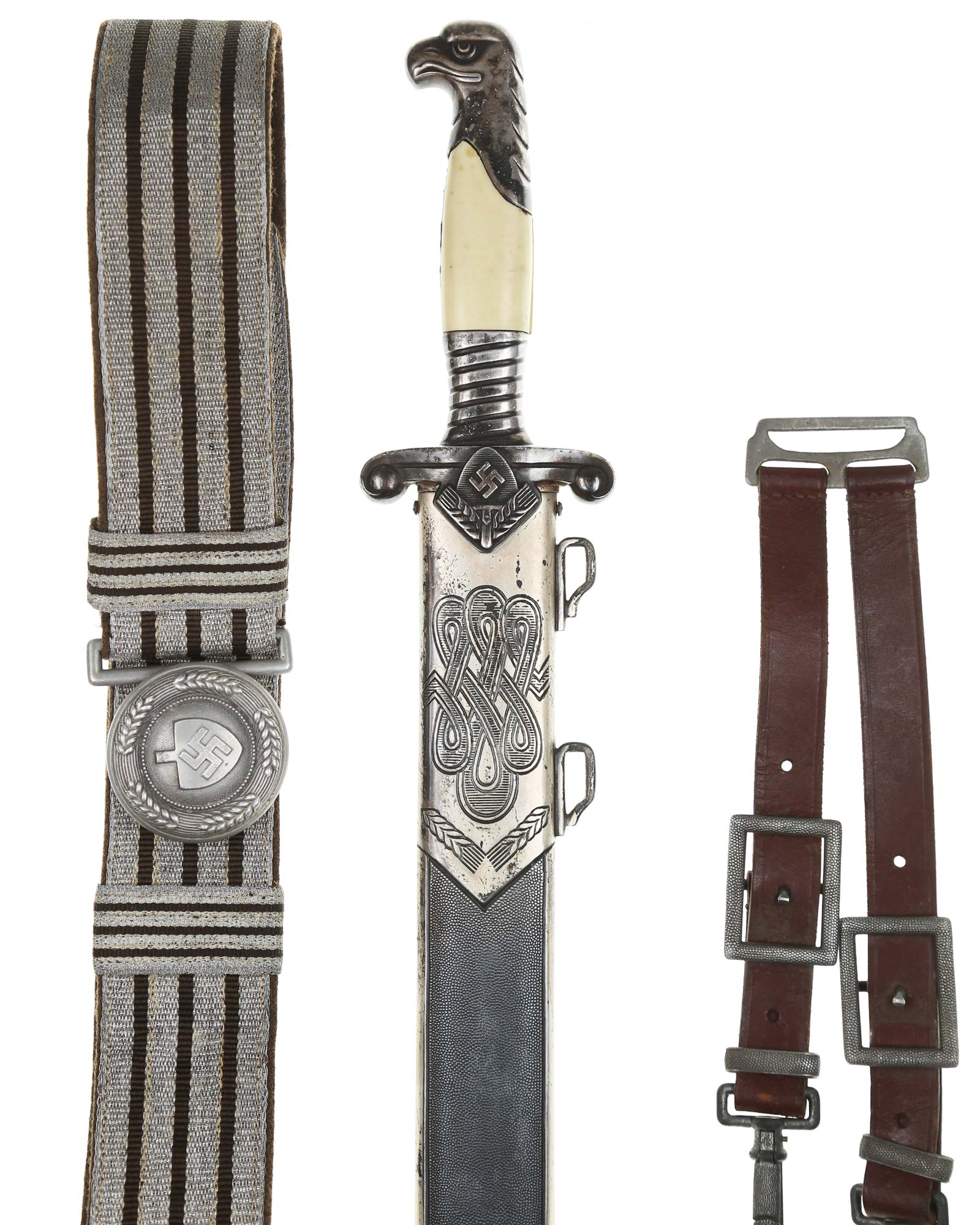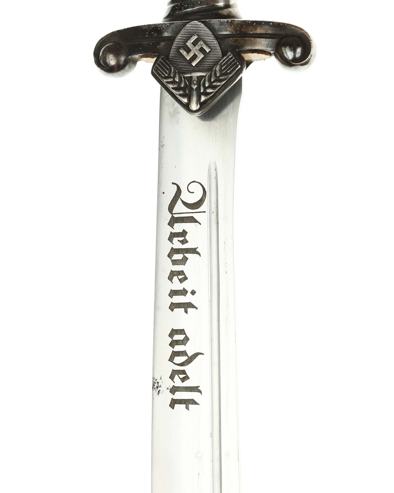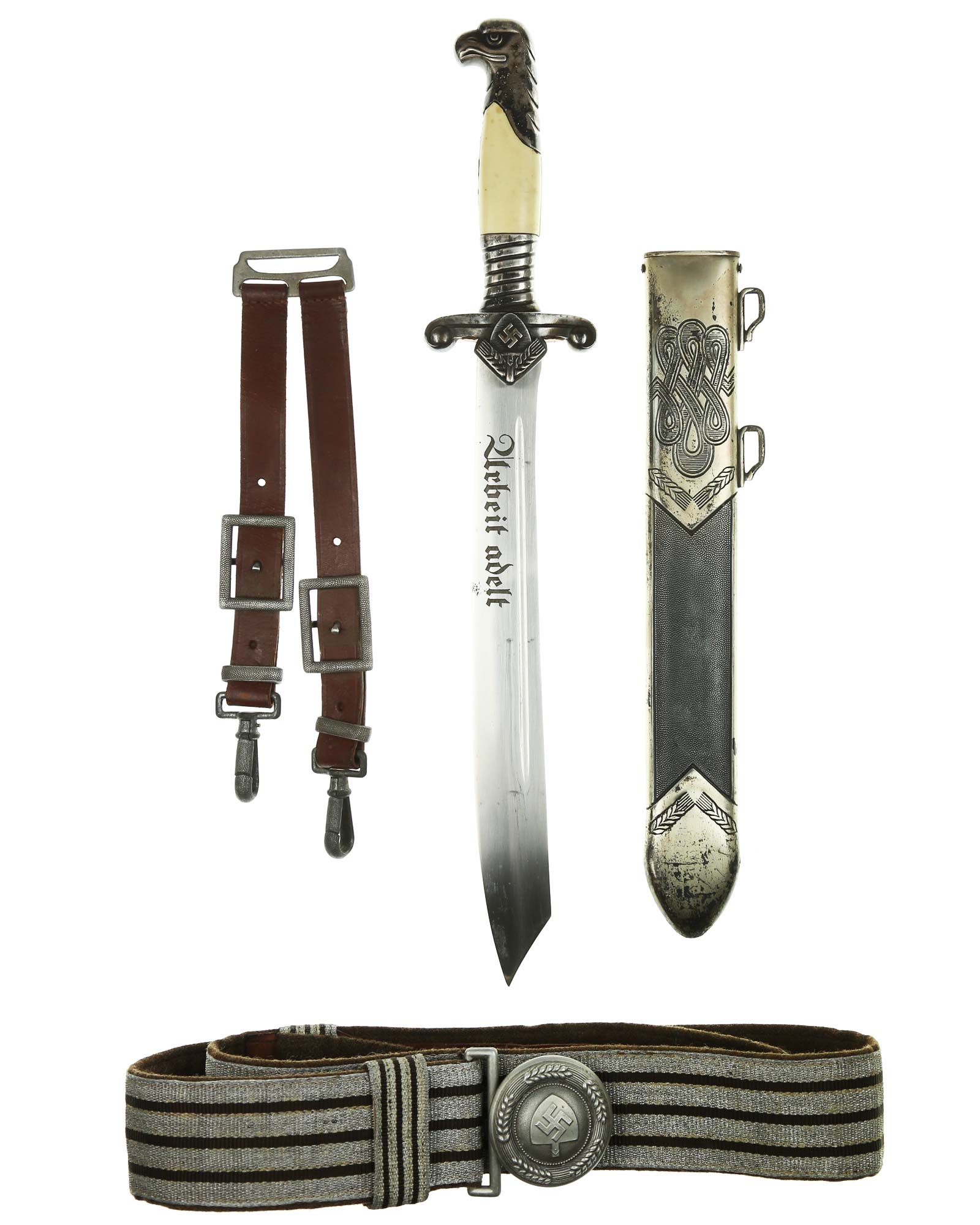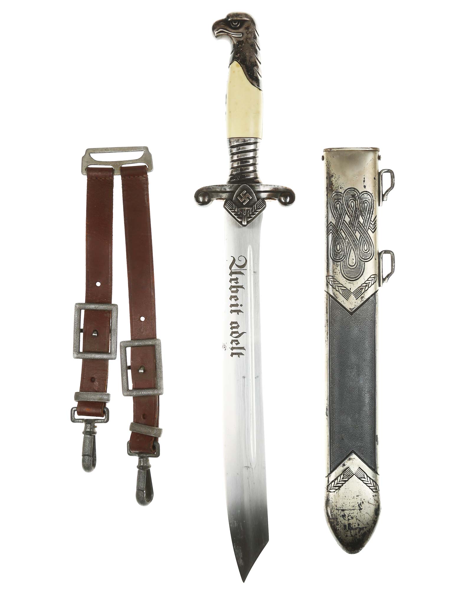 RAD [Reichsarbeitsdienst] Dolch für Führer mit Gehänge - Modell 1937. Die Gesamtlänge beträgt 40,0 cm. Der RAD Führerhauer hat das Herstellerlogo: Carl Julius Krebs Solingen, auf der Klinge. RAD Hauer ist zusammen mit dazugehöriger Reichsarbeitsdienst Paradefeldbinde.