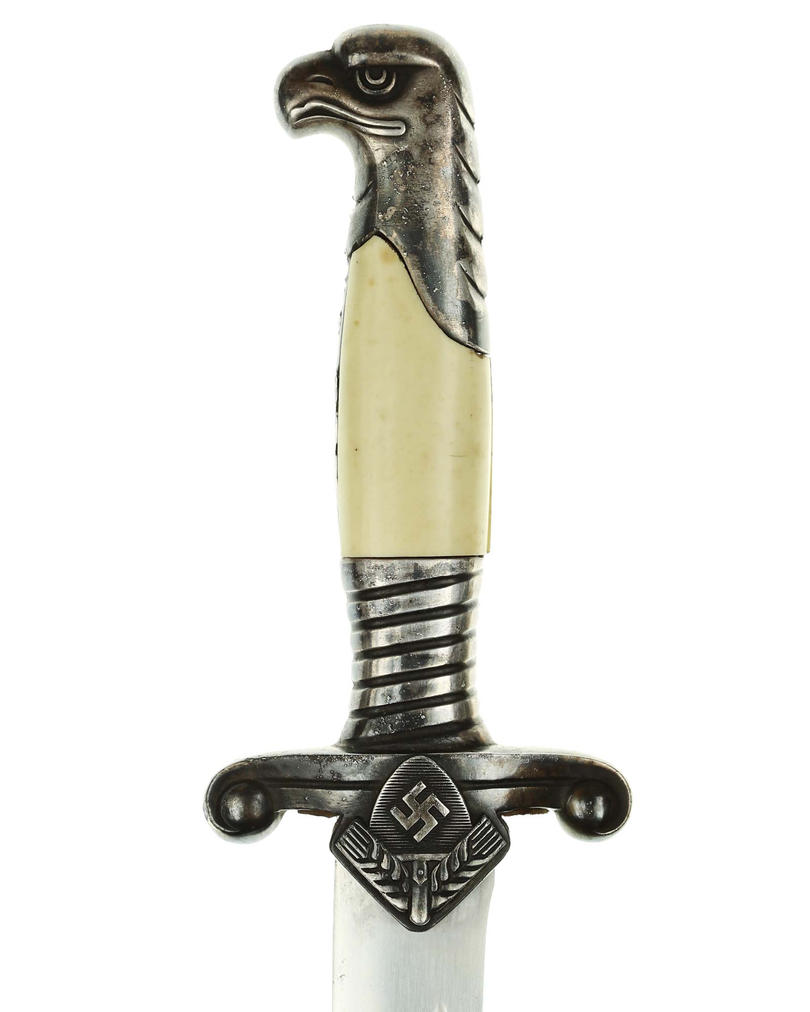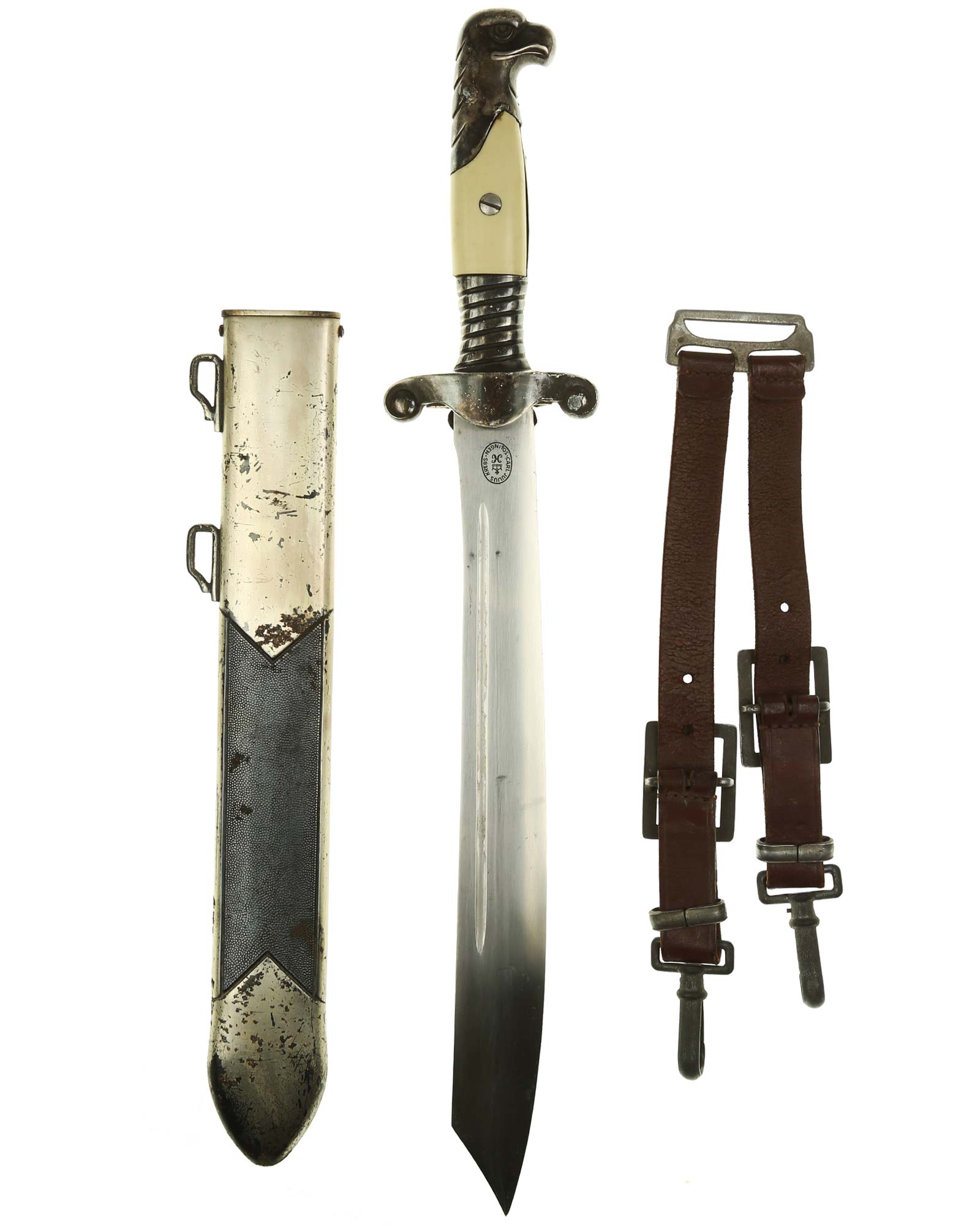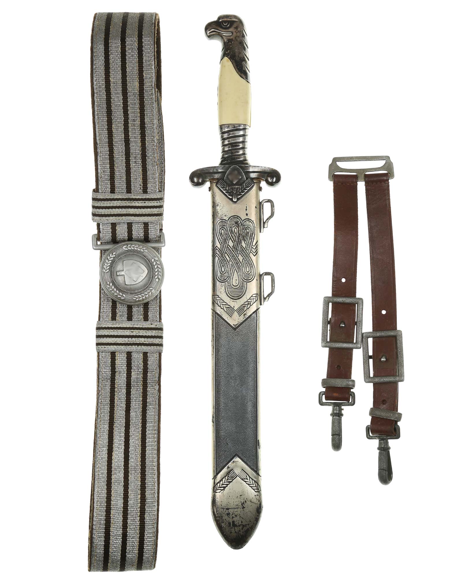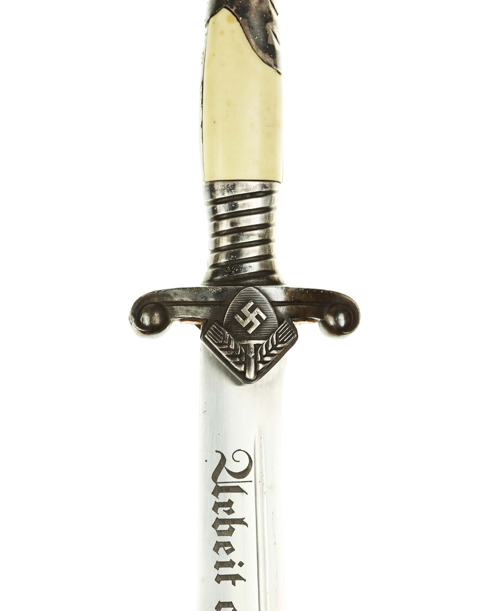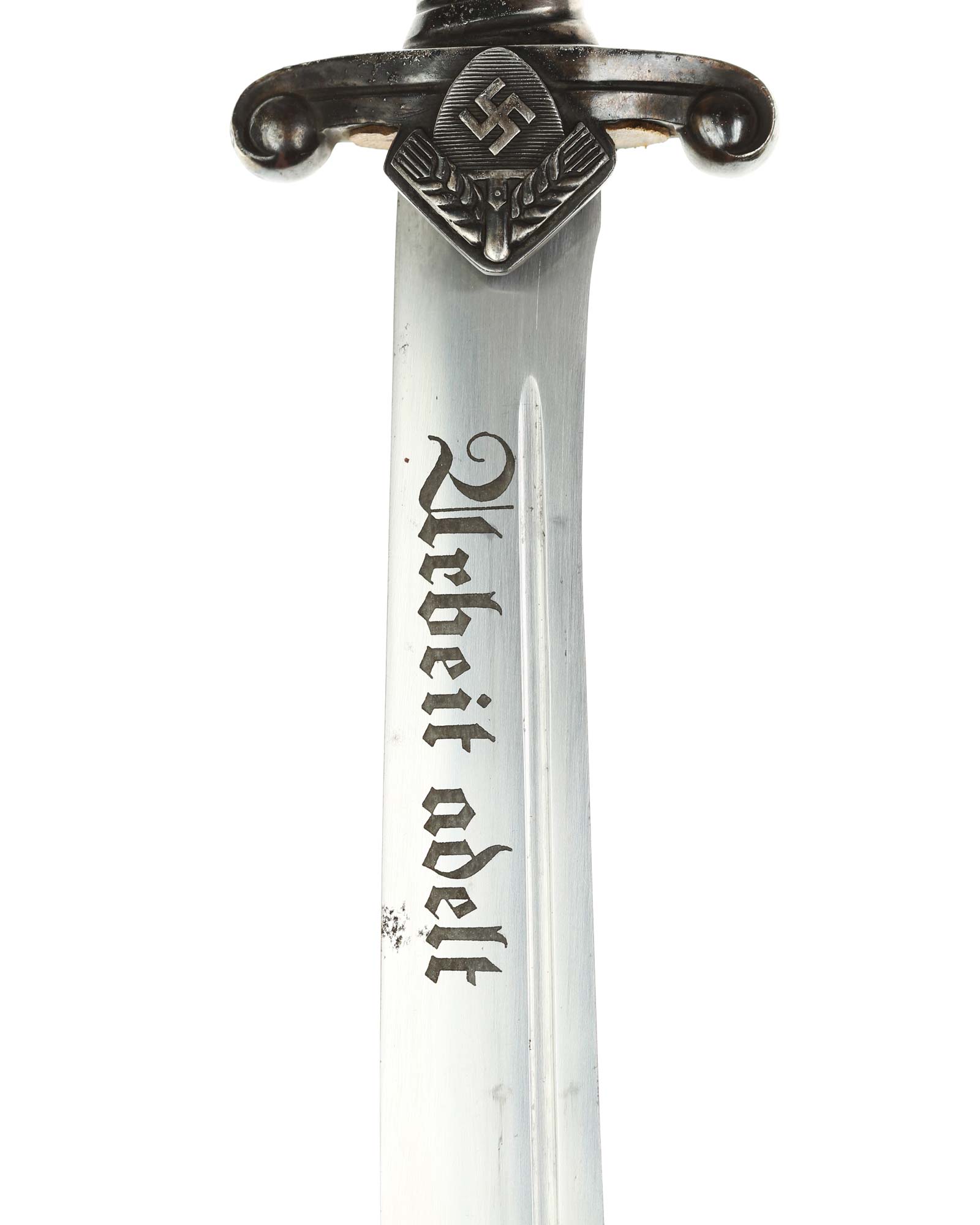 RAD [Reichsarbeitsdienst] Dolch für Führer mit Gehänge - Modell 1937. Die Gesamtlänge beträgt 40,0 cm. Der RAD Führerhauer hat das Herstellerlogo: Carl Julius Krebs Solingen, auf der Klinge. RAD Hauer ist zusammen mit dazugehöriger Reichsarbeitsdienst Paradefeldbinde.