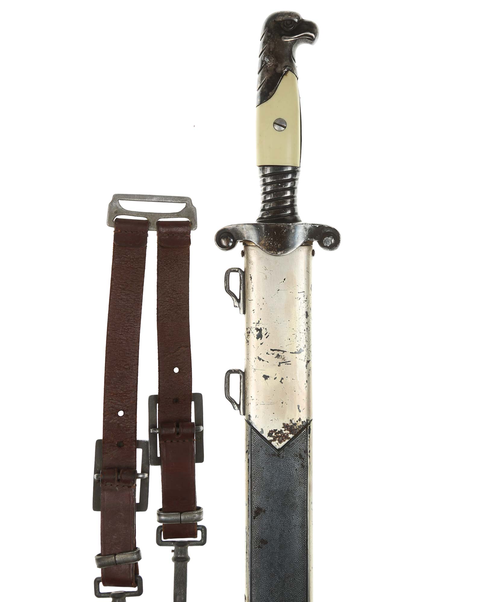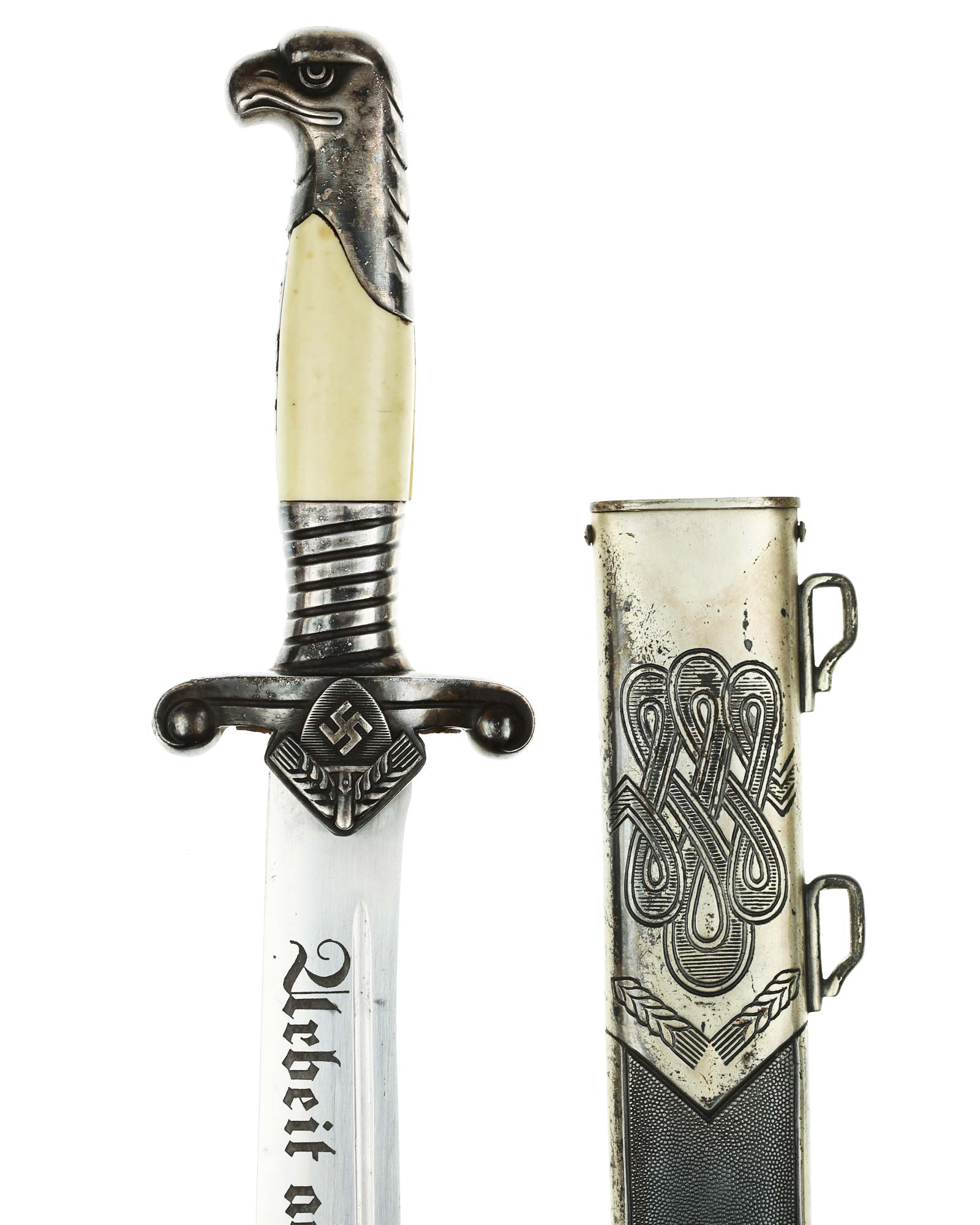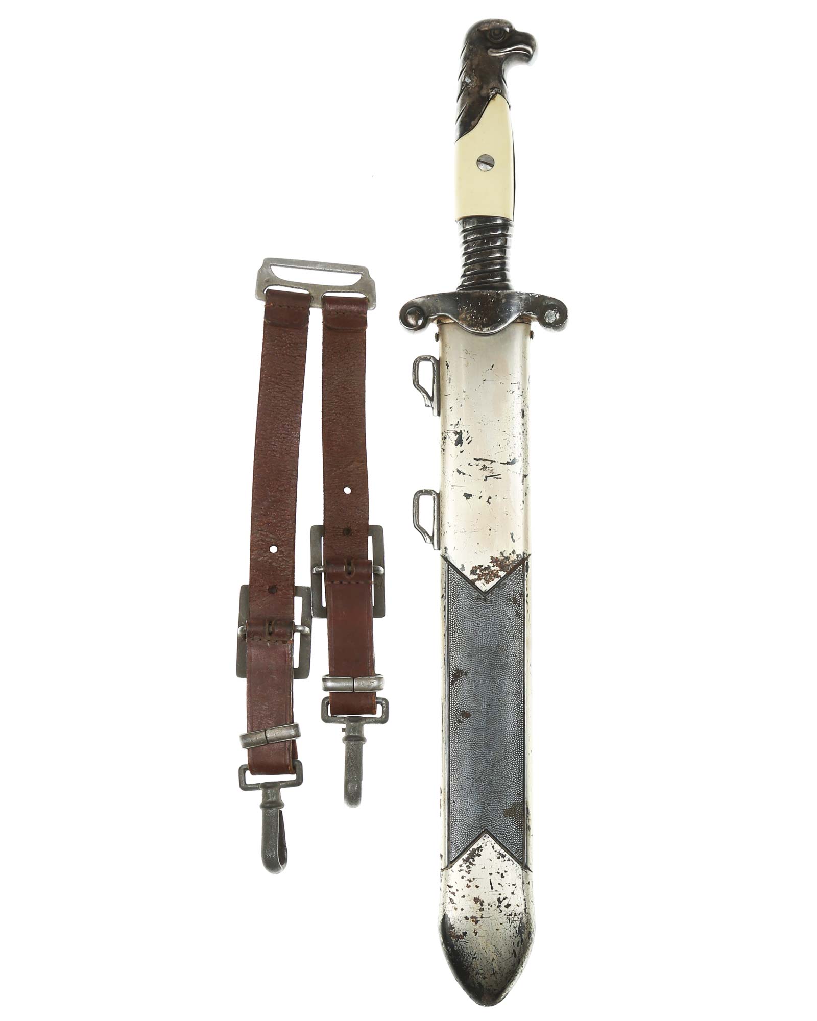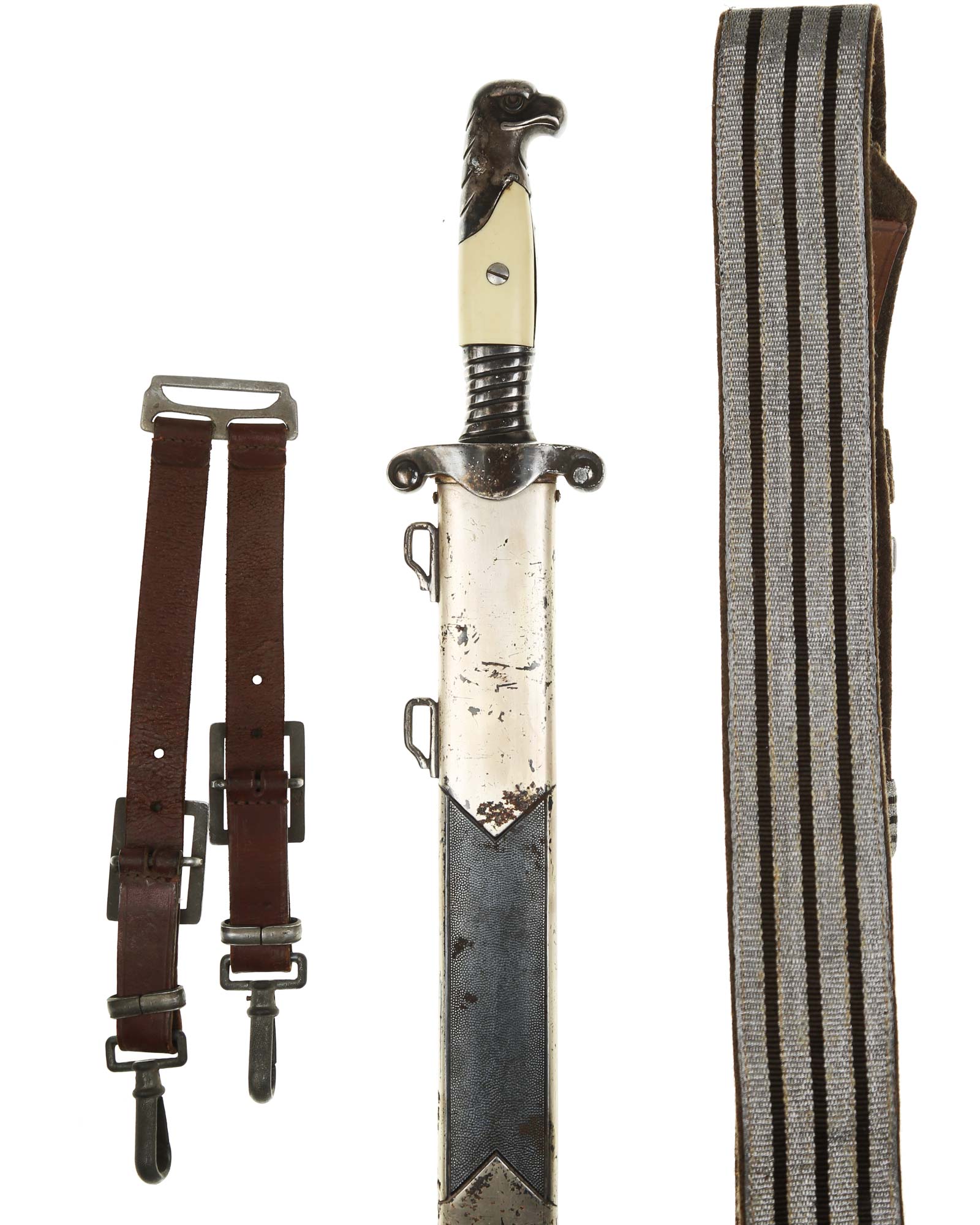 RAD [Reichsarbeitsdienst] Dolch für Führer mit Gehänge - Modell 1937. Die Gesamtlänge beträgt 40,0 cm. Der RAD Führerhauer hat das Herstellerlogo: Carl Julius Krebs Solingen, auf der Klinge. RAD Hauer ist zusammen mit dazugehöriger Reichsarbeitsdienst Paradefeldbinde.