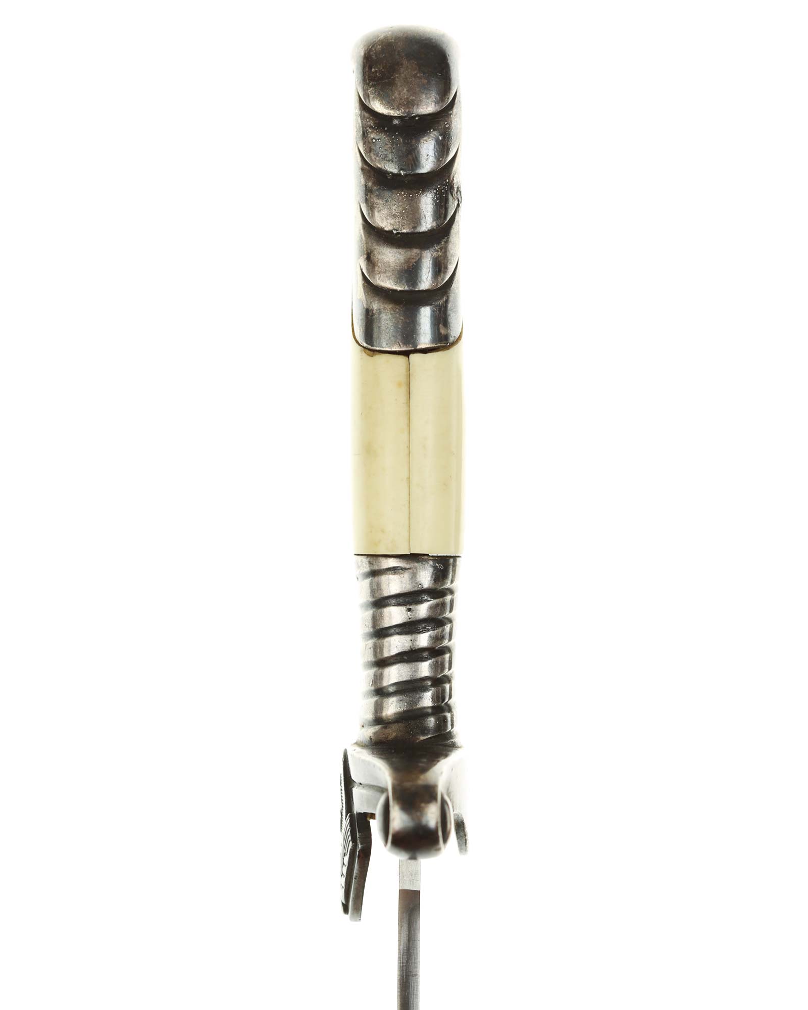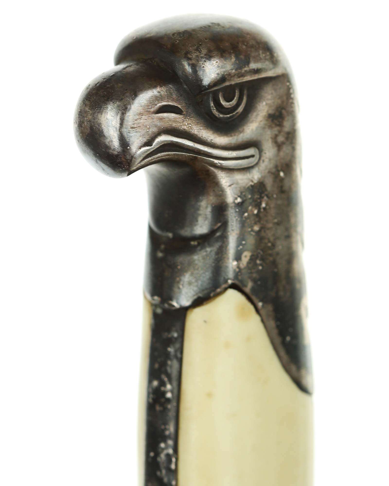Griff: Der Griff ist aus Aluminium mit zwei weißen Kunststoff-Griffschalen, diese werden durch eine Schraube auf der Rückseite befestigt. Der Griff hat die Form eines Adlers, der Schnabel ist in Richtung der Klingenseite gerichtet. Der untere Bereich vom Griff ist in Form von Kanneluren, diese sind konvex und nach außen gewölbt. Die Parierstange ist flach und mit einer Längsrille. In der Mitte befindet sich das RAD Symbol. Zu den beiden Enden hin verläuft die Parierstange nach unten.