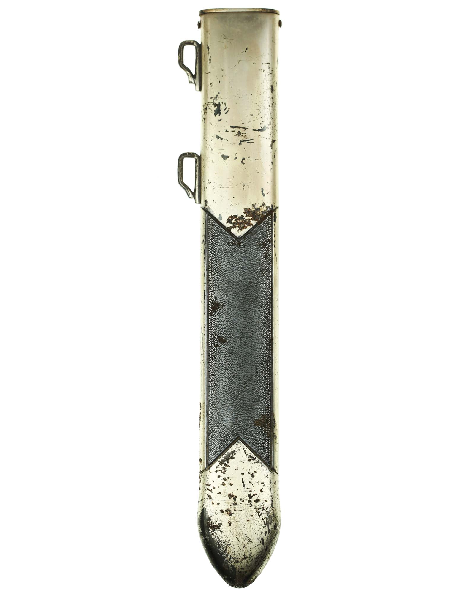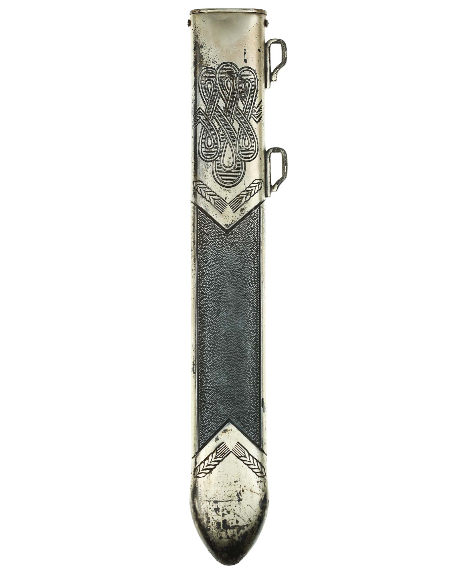 Scheide: Die Scheide ist gerade mit einem gekörntem Hintergrund, der Hintergrund ist noch fabrikdunkel. Ober- und Unterhalb befinden sich die RAD Weizenkornmuster. Das Mundblech wird von zwei seitlichen Schrauben gehalten (eine Schraube fehlt). Beide Trageringe für das Tragegehänge sind an die Scheide angeschweißt.