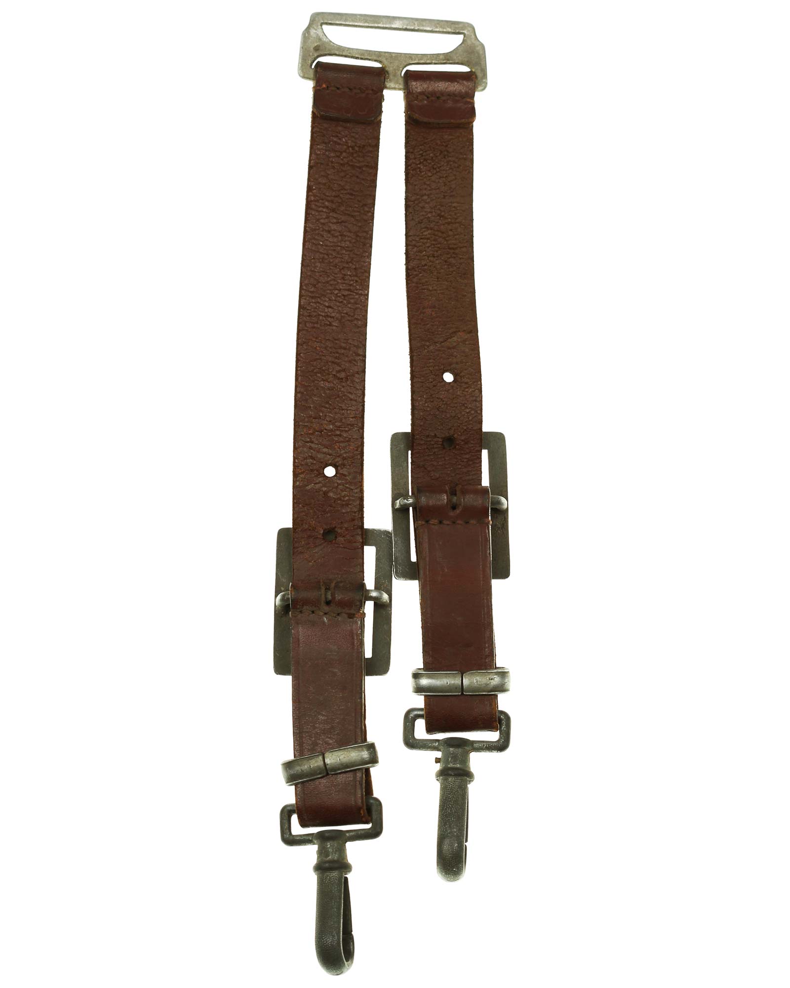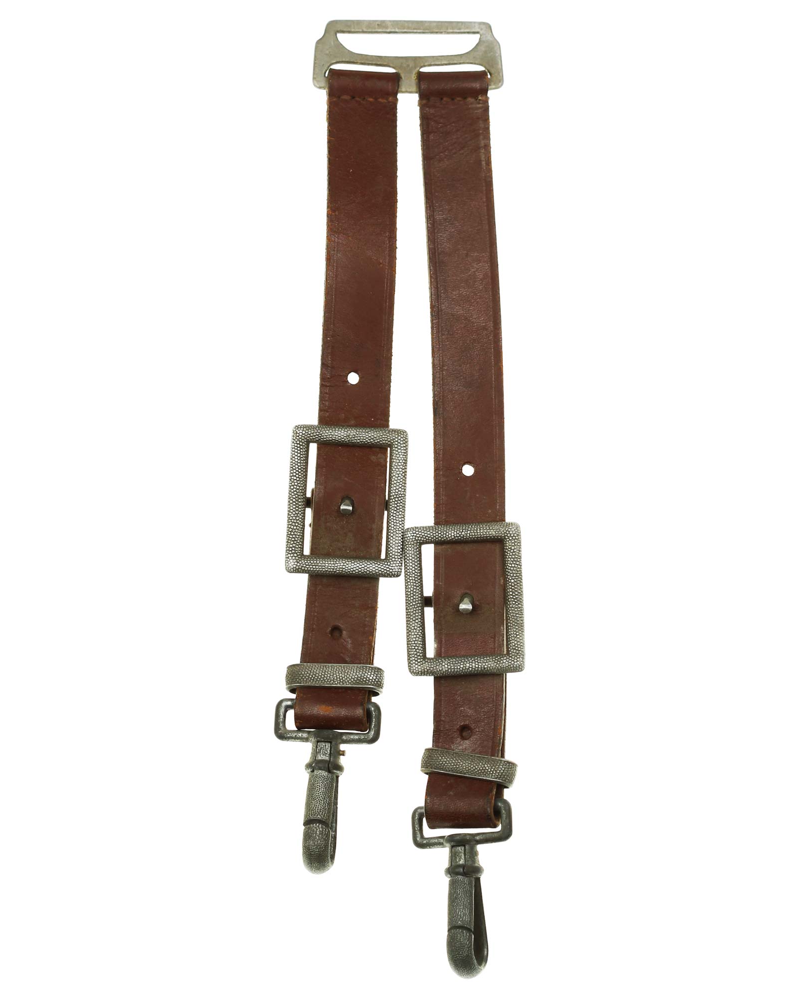Zweiteilig. Braunes Ledergehänge mit gekörnten Schließen und Einhängevorrichtung