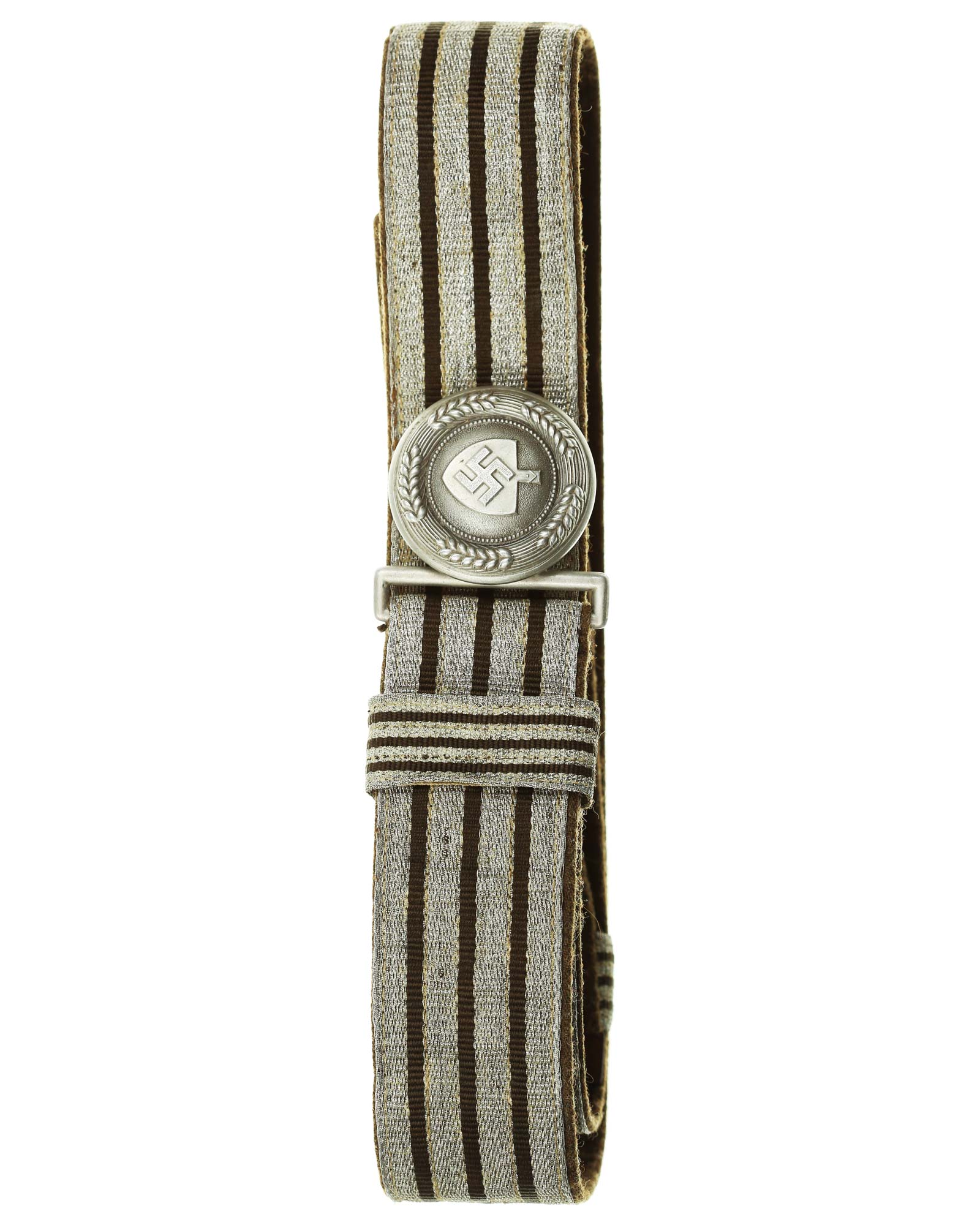 RAD Paradefeldbinde: Schloss aus Aluminium und mit Assmann DRGM 37 markiert, Größe 95. Silbergespinstbinde mit 3 braunen Durchzügen und Leinenfutter, Zustand 2+.