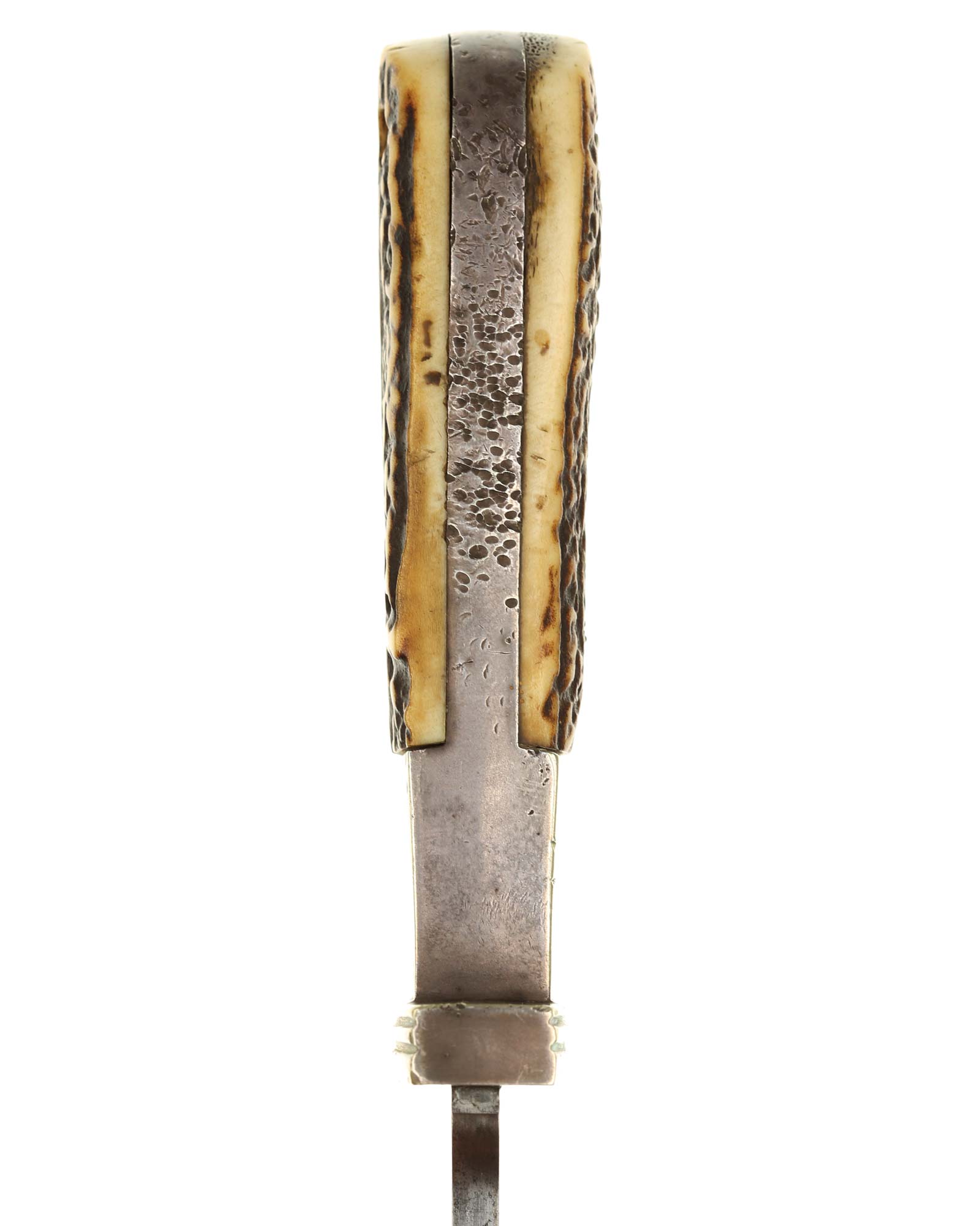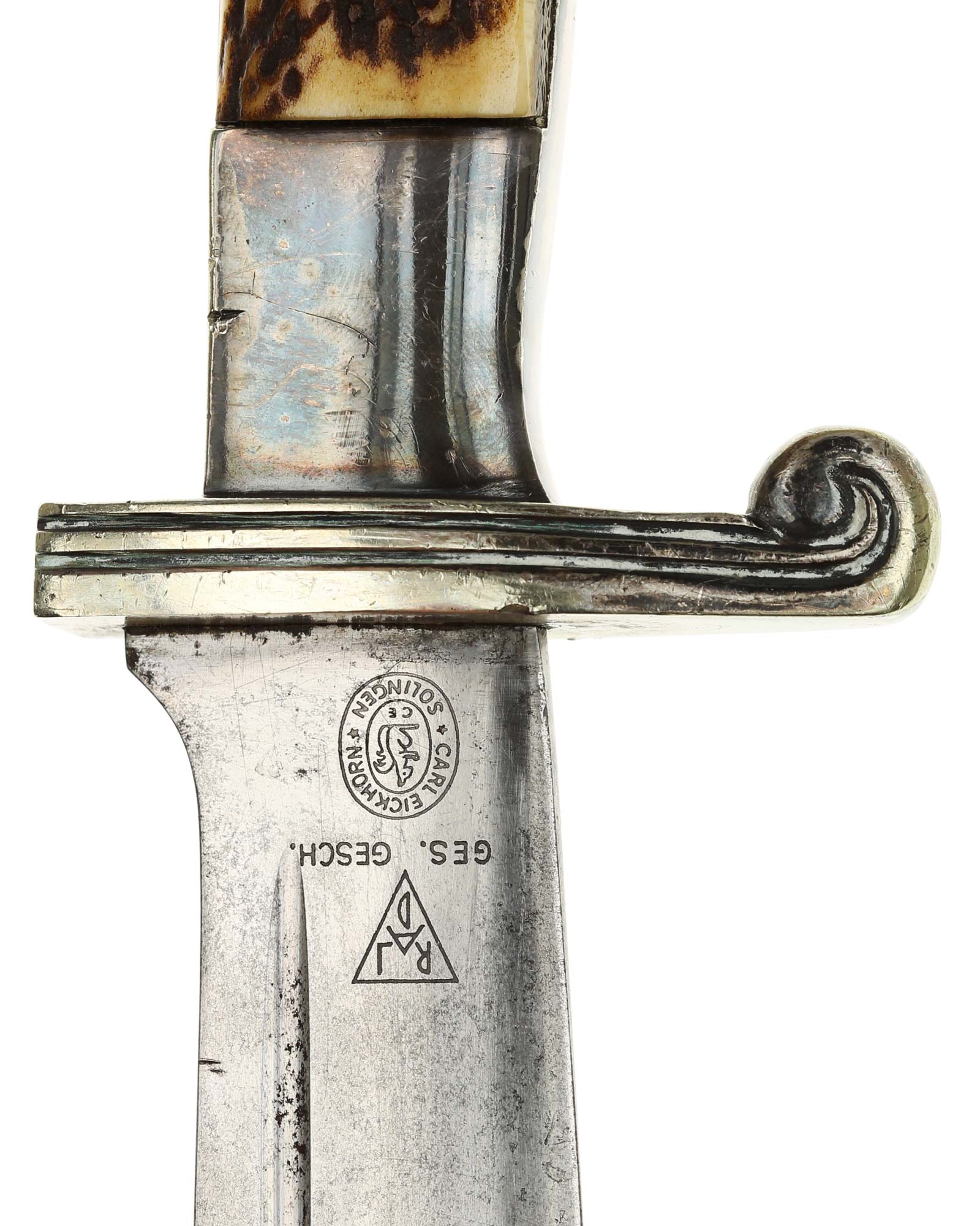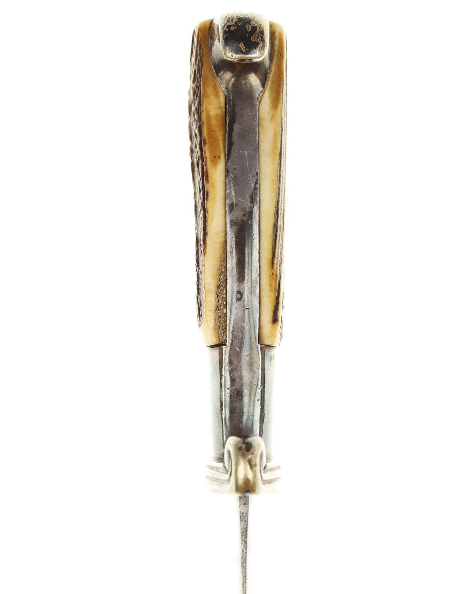 Griff: Der Griff ist mit zwei Hirschhorn-Griffschalen, diese werden durch zwei Schrauben festgehalten. Der Griff hat die Form eines Adlers, der Schnabel ist in Richtung der Klingenseite gerichtet. Die Parierstange ist flach und mit zwei Längsrillen.