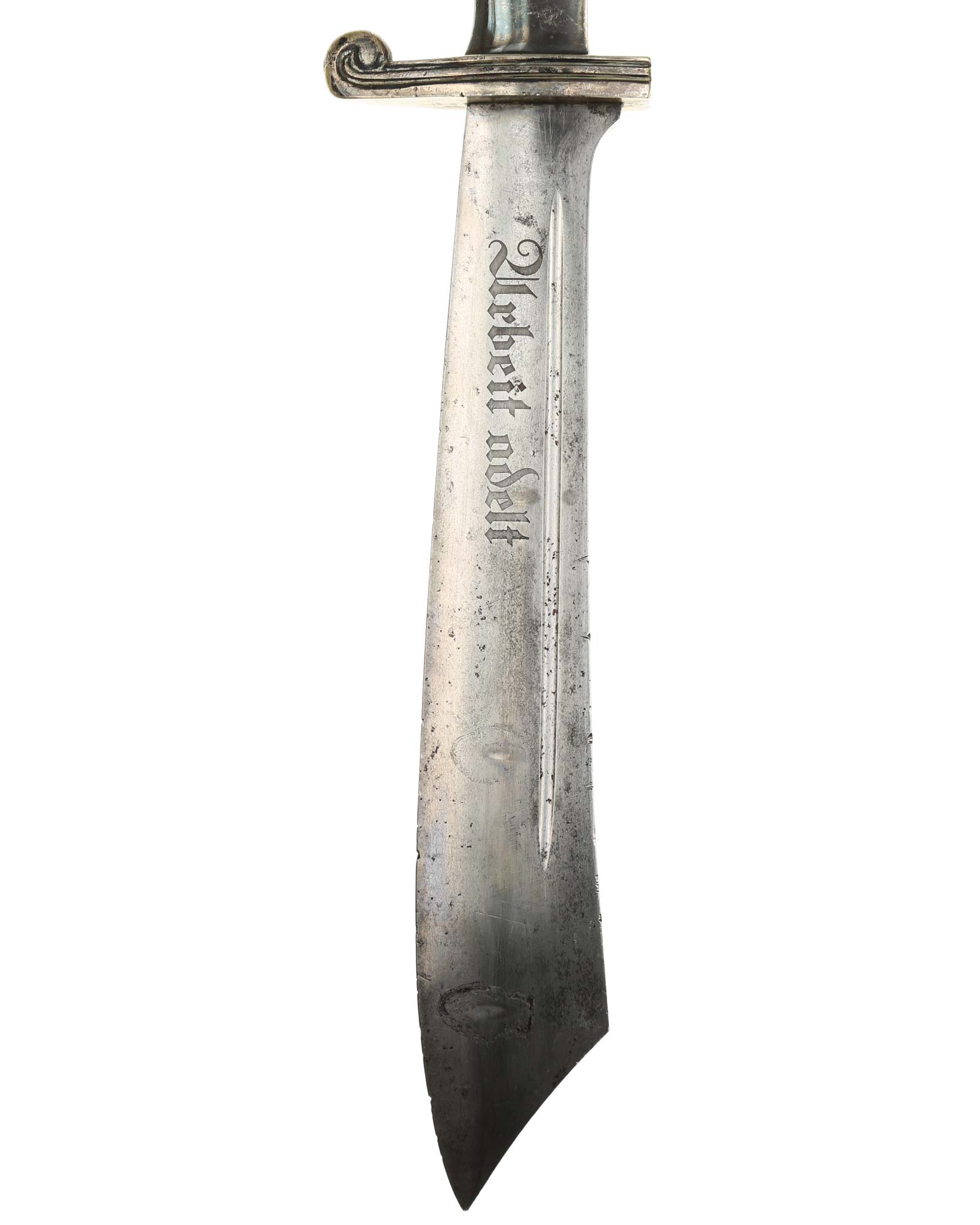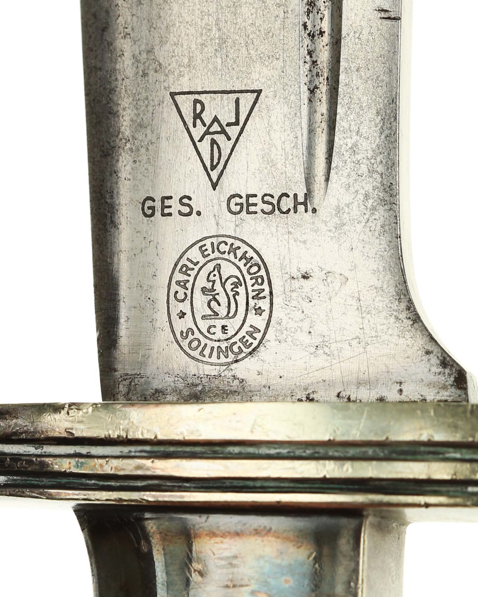 Klinge: Die Klinge ist einschneidig, leicht gebogen und vernickelt. Der Klingenrücken der Klinge ist komplett stumpf. Auf der Vorderseite befindet sich die RAD Devisenätzung in gotischer Schrift: «Arbeit adelt». Auf der Rückseite befindet sich das Logo: Carl Eickhorn Solingen.