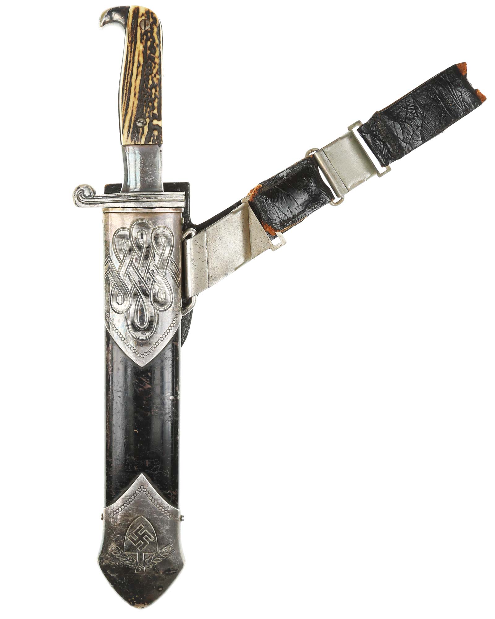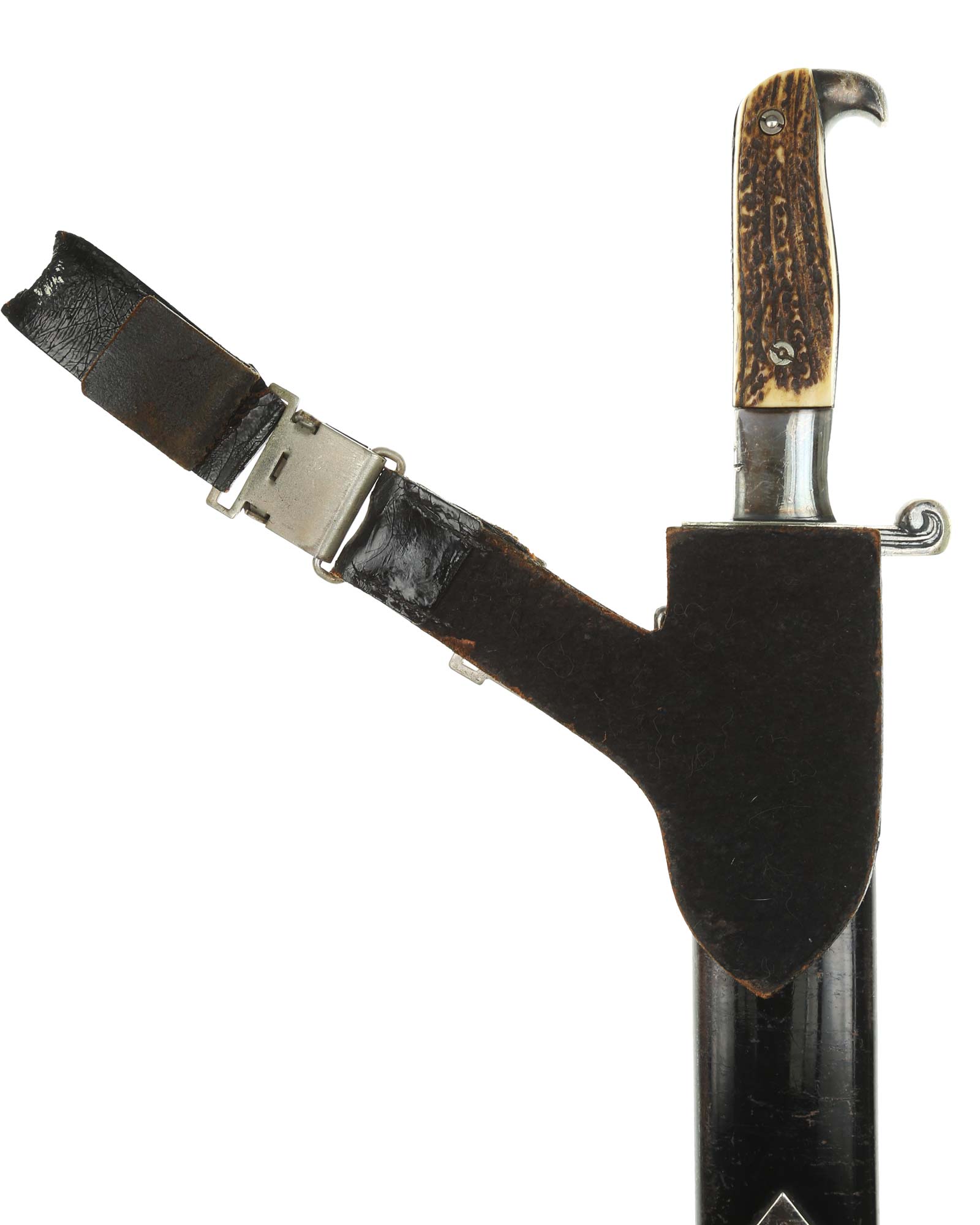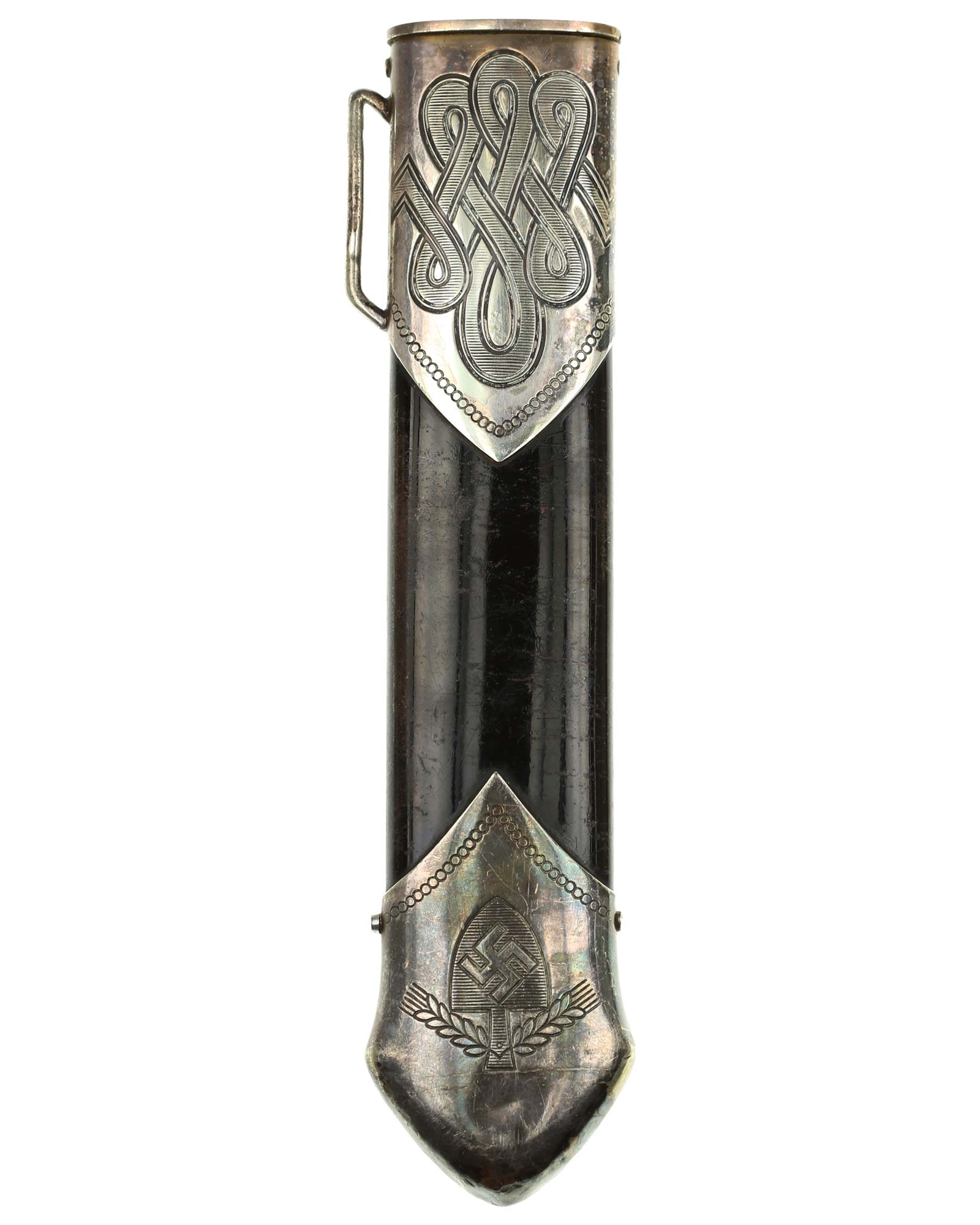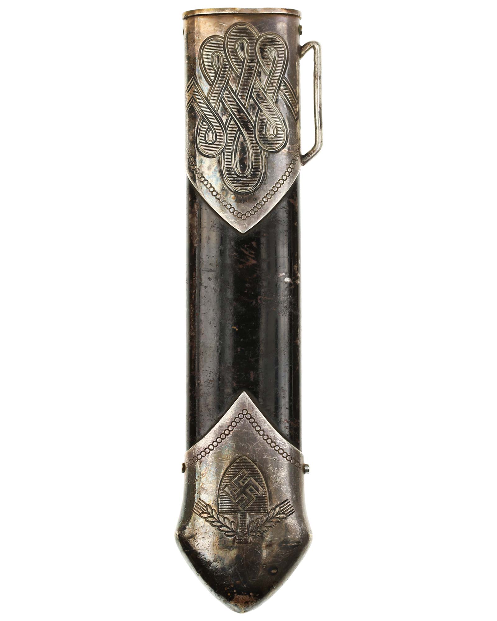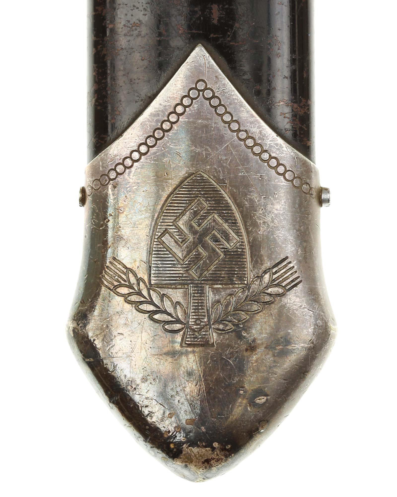 Scheide: Schwarz lackierte Stahlscheide, der untere Beschlag ist mit dem Symbol des Reichsarbeitsdienstes und am oberen Scheidenbeschlag befindet sich der Bügel zum Einhängen des Tragehängers. Der RAD Hauer kommt zusammen mit dazugehörigem Leder-Gehänge.