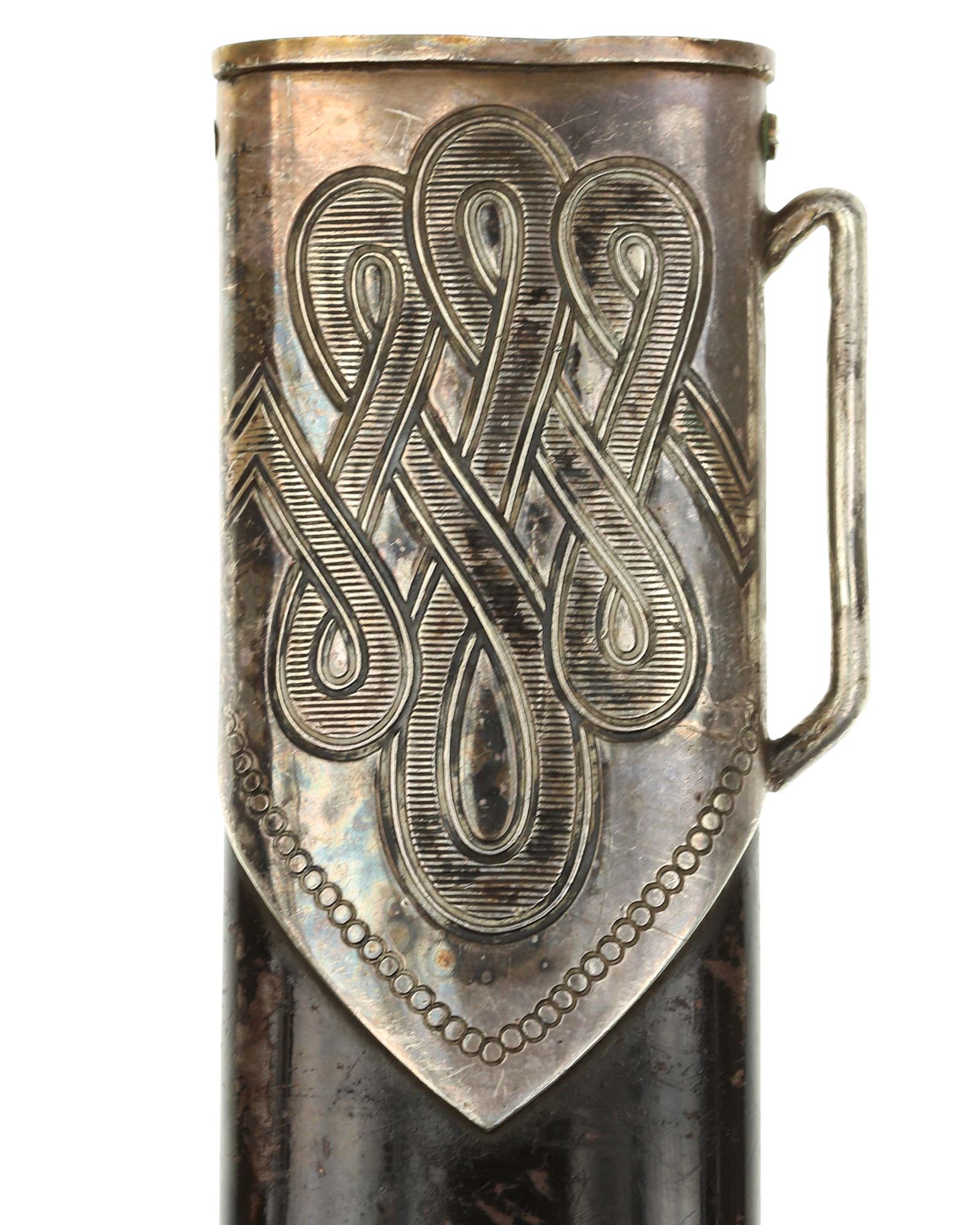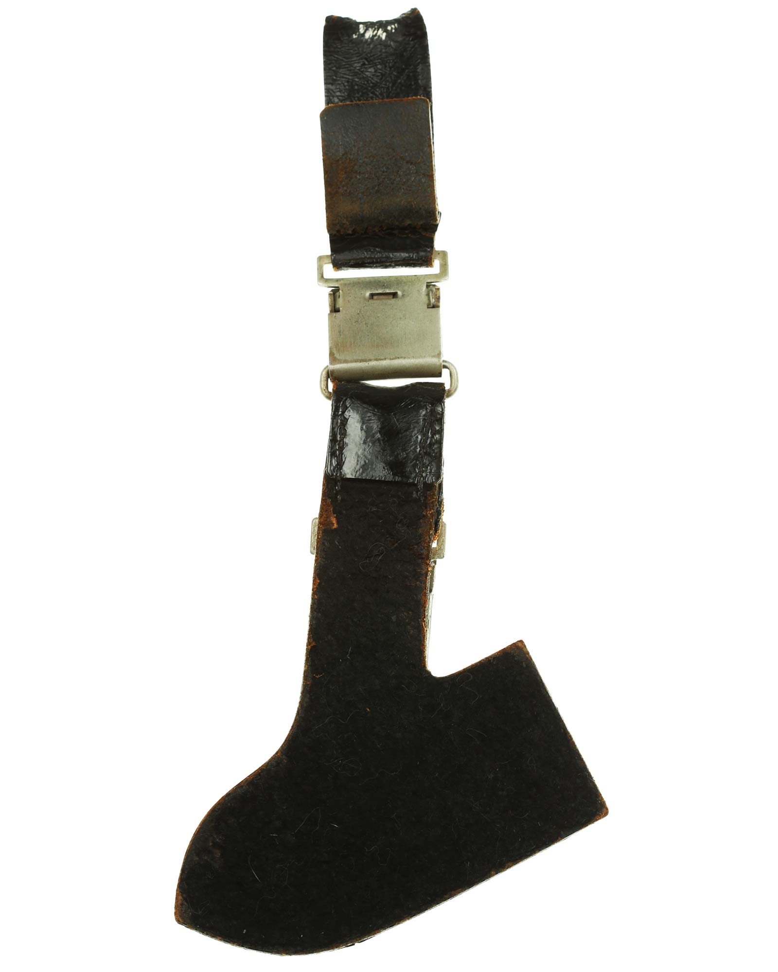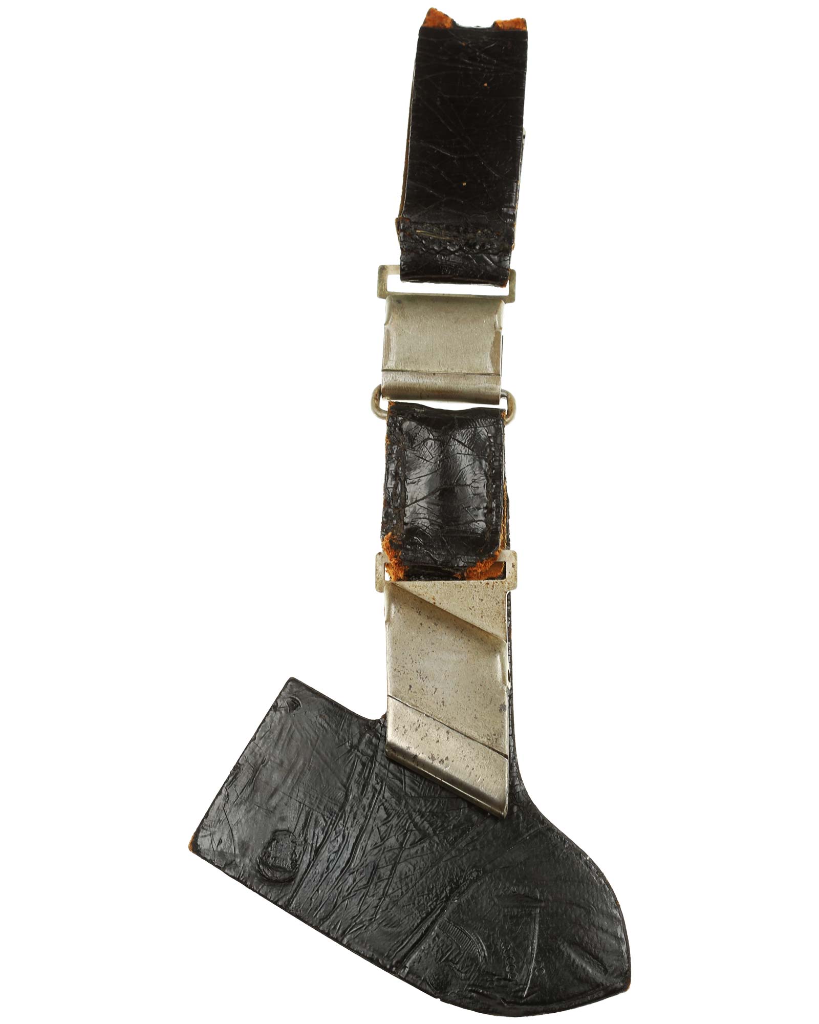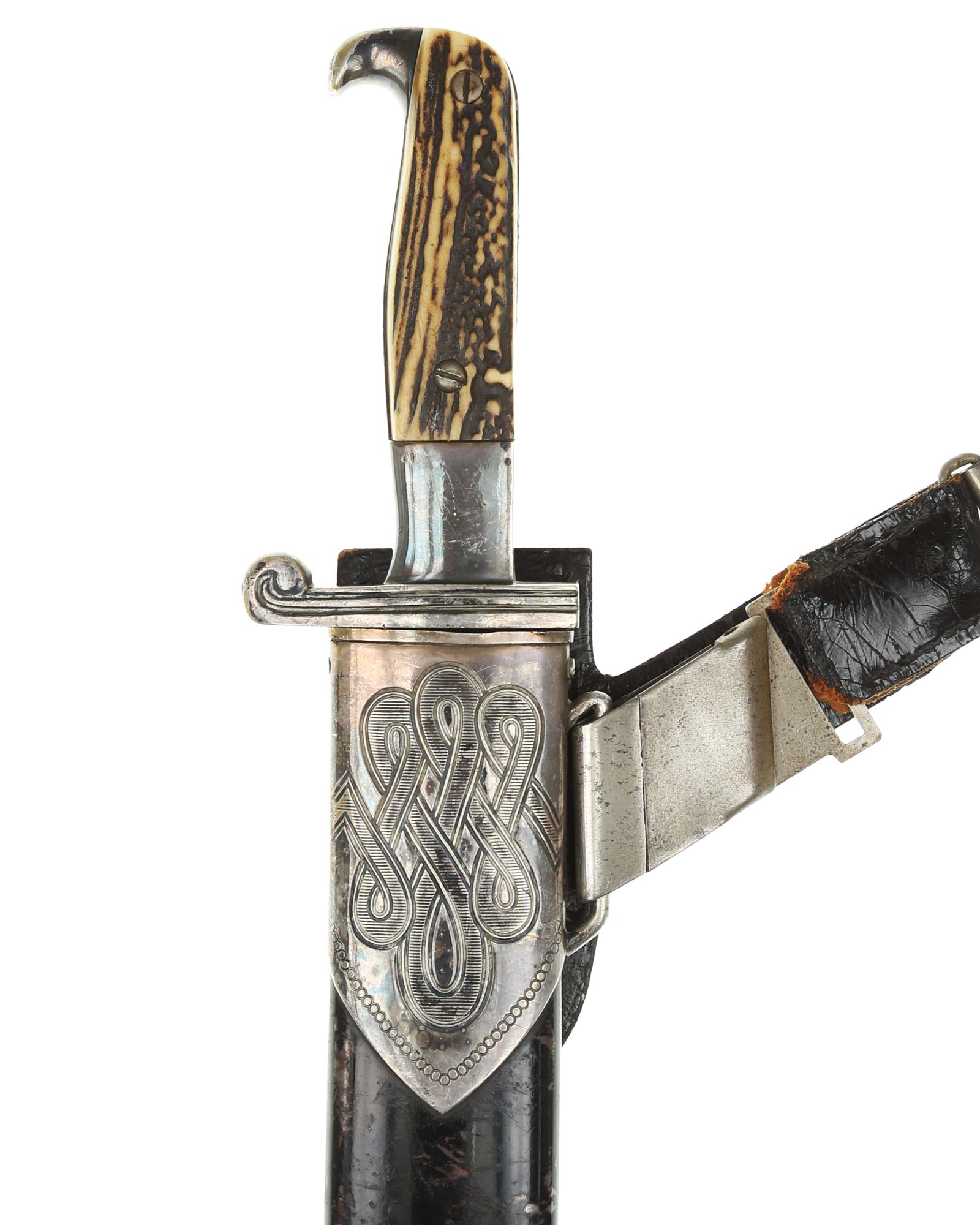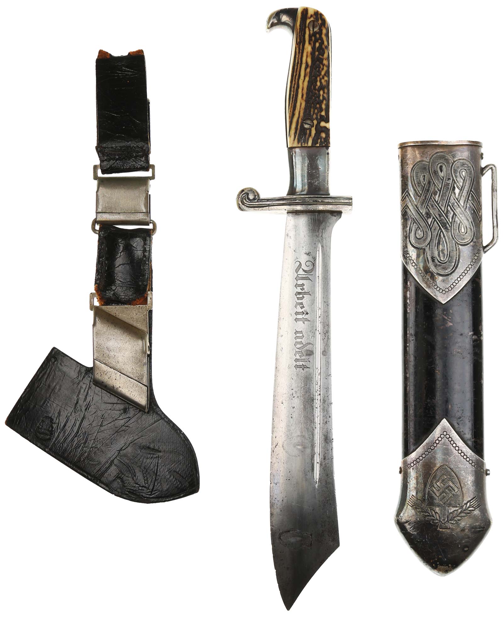Scheide: Schwarz lackierte Stahlscheide, der untere Beschlag ist mit dem Symbol des Reichsarbeitsdienstes und am oberen Scheidenbeschlag befindet sich der Bügel zum Einhängen des Tragehängers. Der RAD Hauer kommt zusammen mit dazugehörigem Leder-Gehänge.