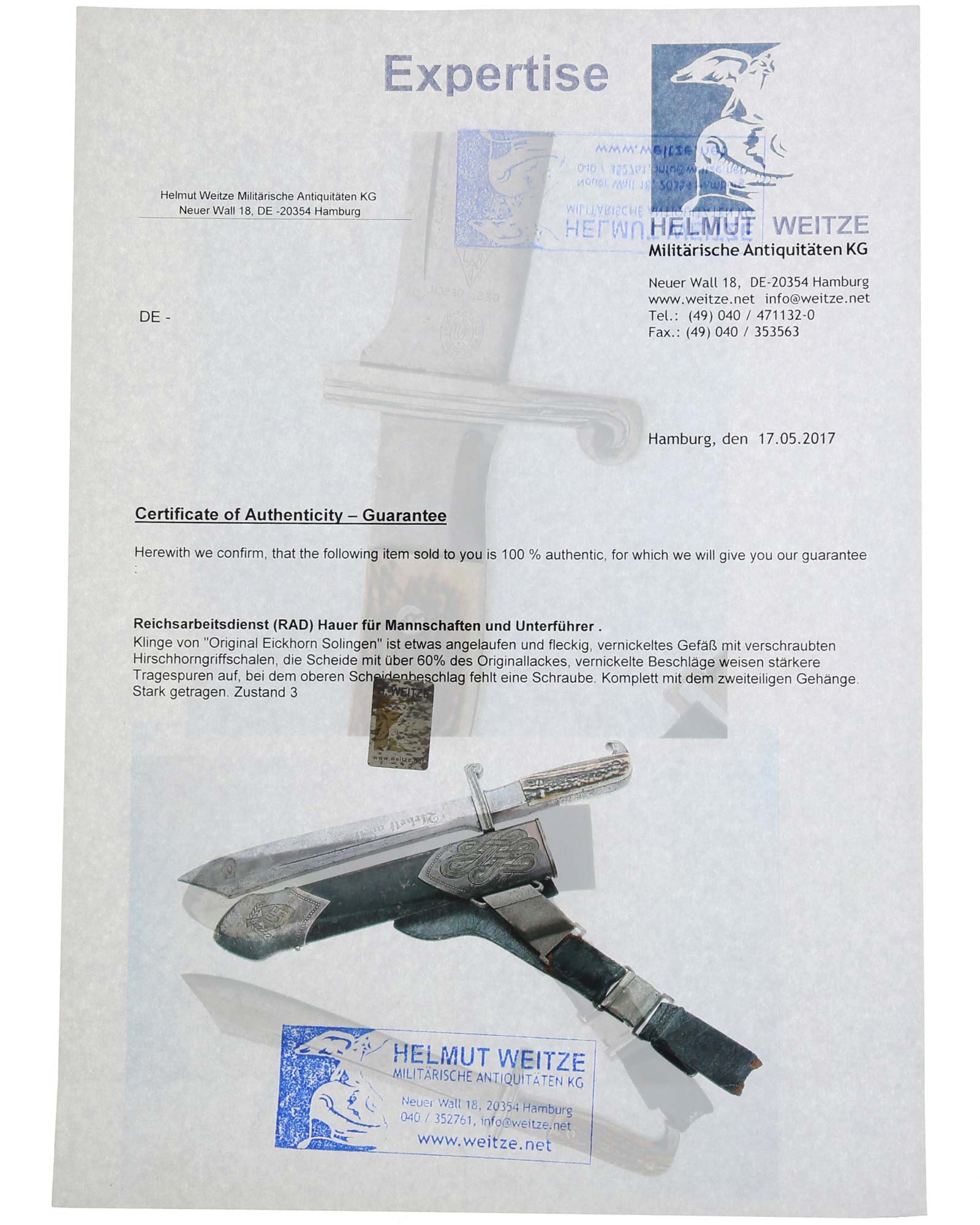 RAD Hauer für Unterführer. Modell 1934. Die Gesamtlänge beträgt 39,7 cm. Der Hauer hat den Hersteller: Carl Eickhorn Solingen auf der Rückseite der Klinge. RAD Hauer zusammen mit RAD Gehänge, Koppelschlaufe und Expertise.