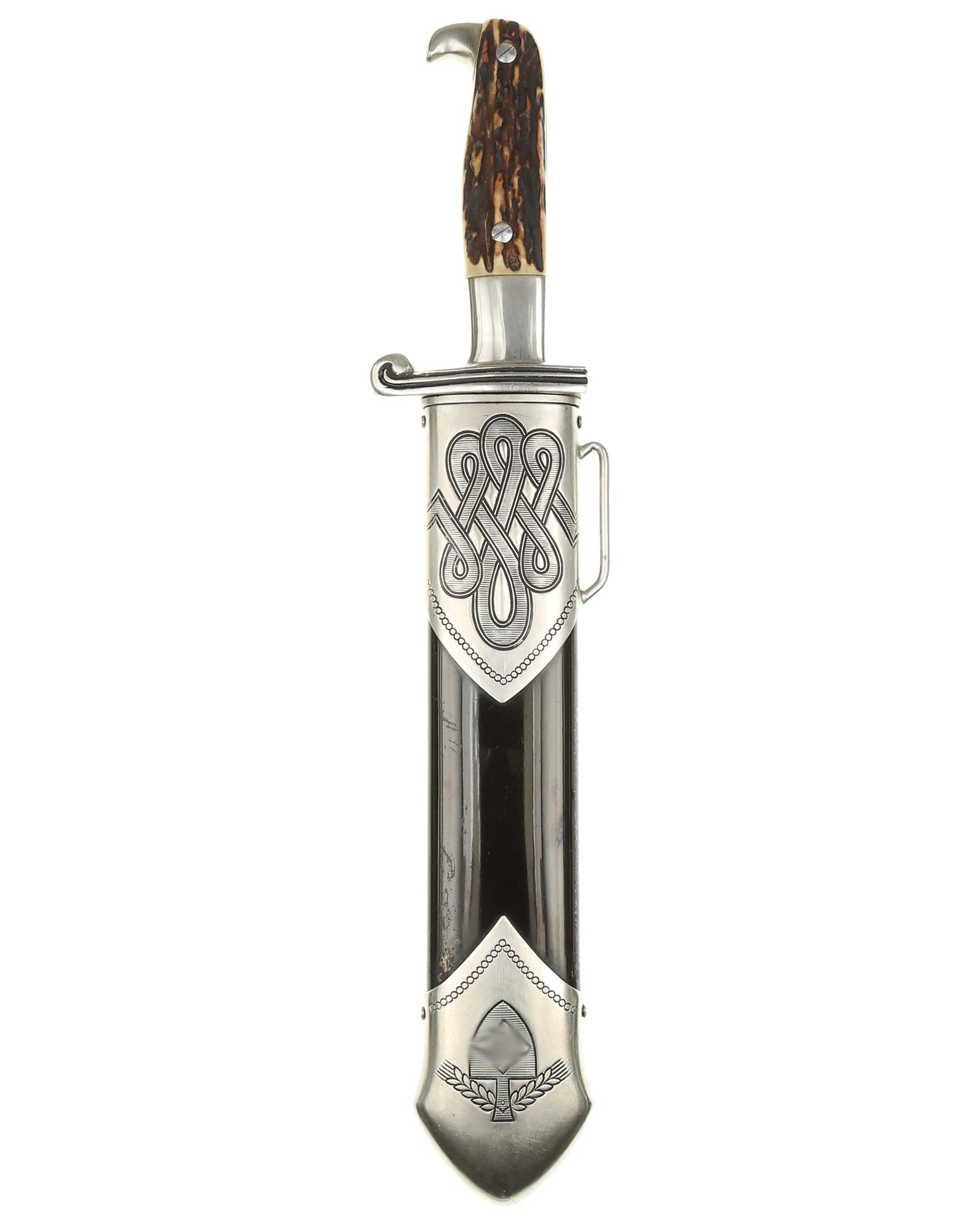 Scheide: Schwarz lackierte Stahlscheide, der untere Beschlag ist mit dem Symbol des Reichsarbeitsdienstes und am oberen Scheidenbeschlag befindet sich der Bügel zum Einhängen des Tragehängers.