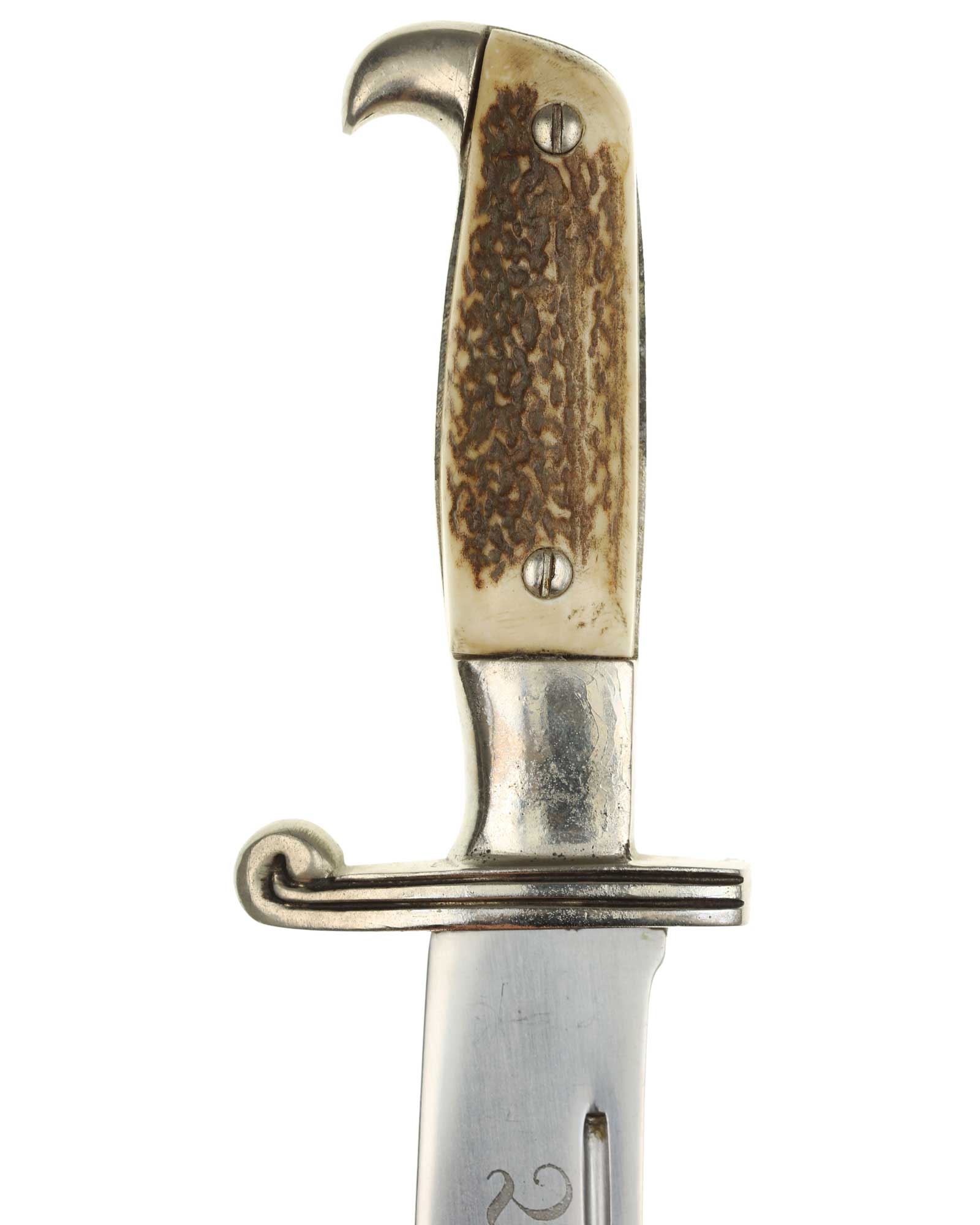 Griff: Der Griff ist mit zwei Hirschhorn-Griffschalen, diese werden durch zwei Schrauben festgehalten. Der Griff hat die Form eines Adlers, der Schnabel ist in Richtung der Klingenseite gerichtet. Die Parierstange ist flach und mit zwei Längsrillen.