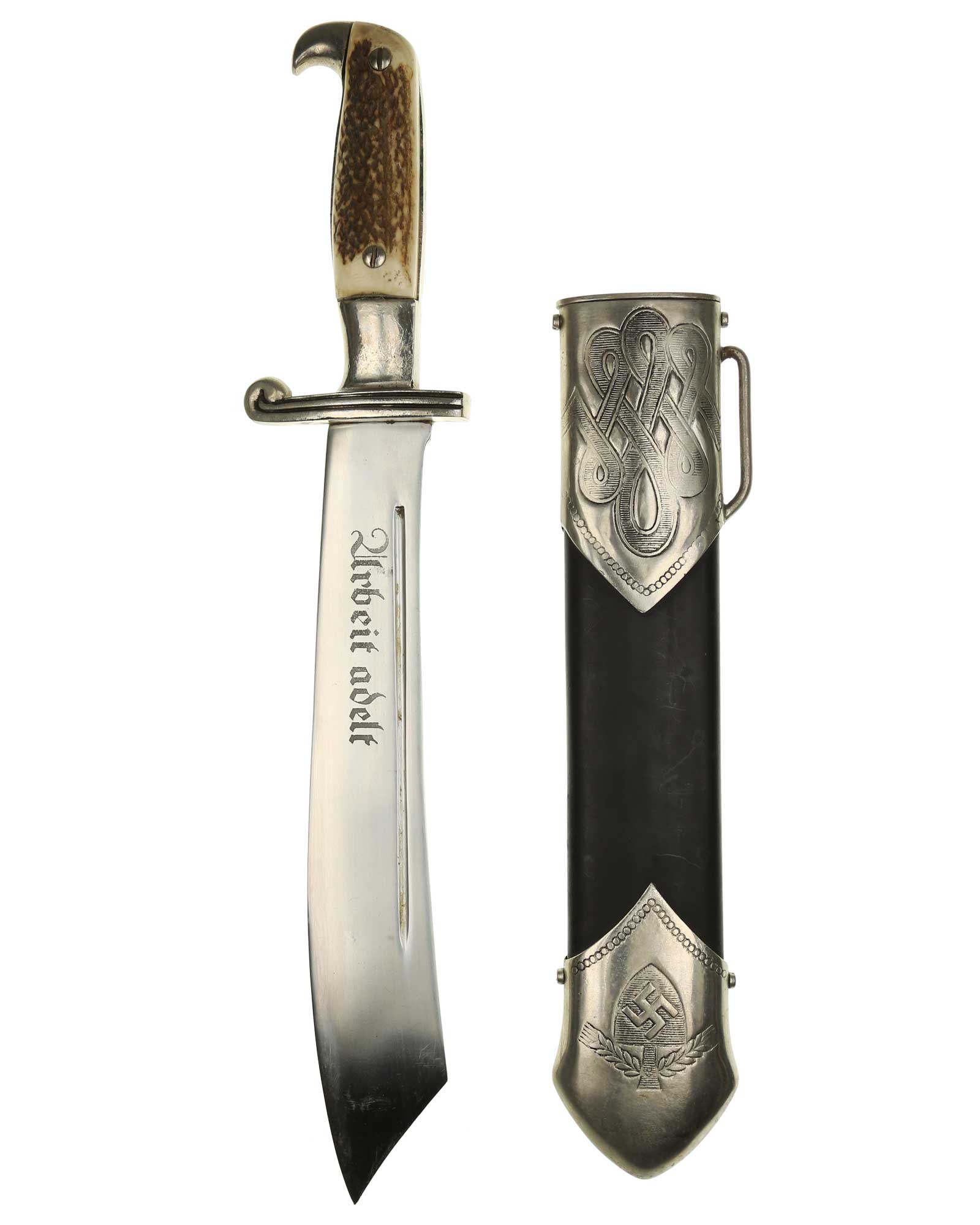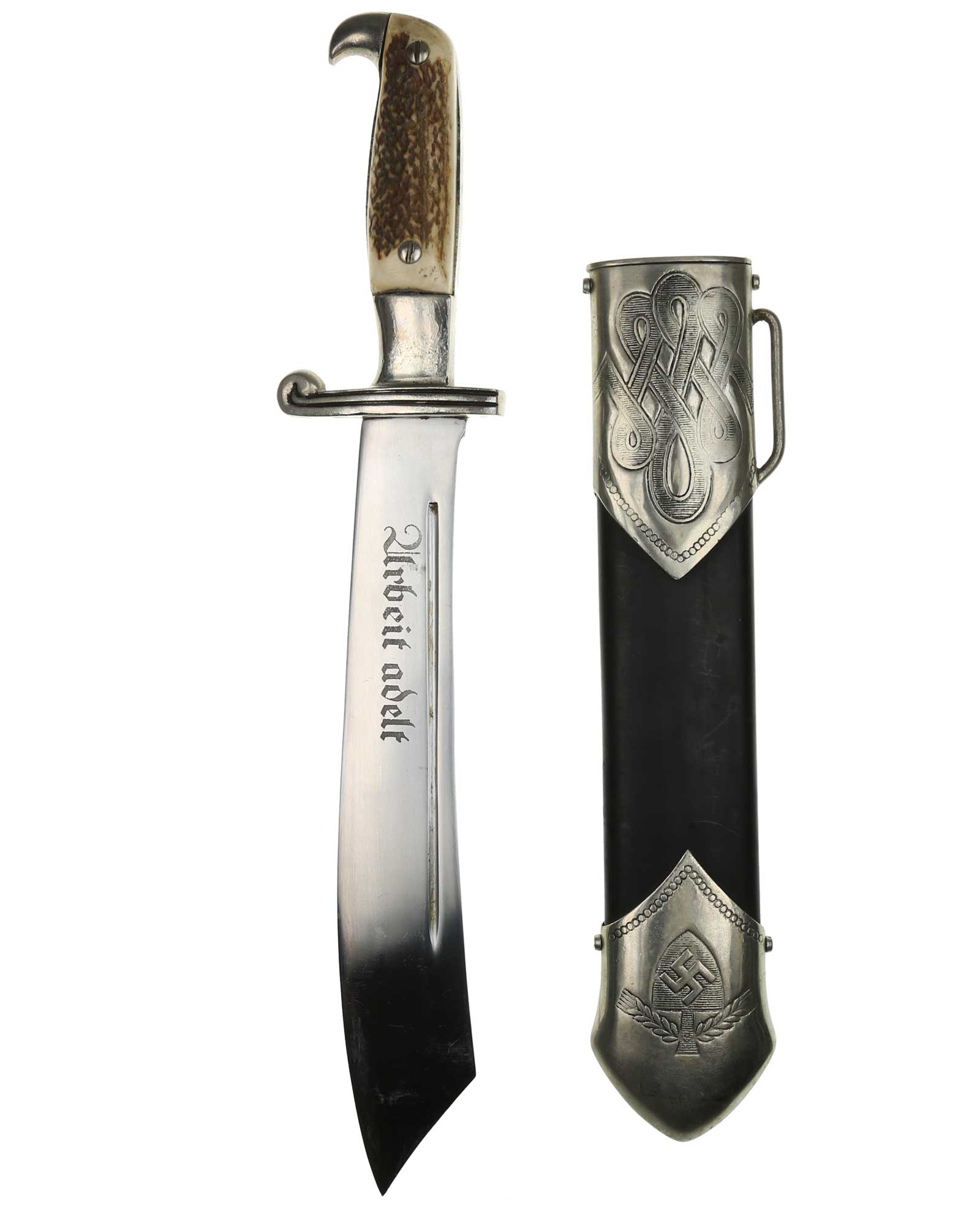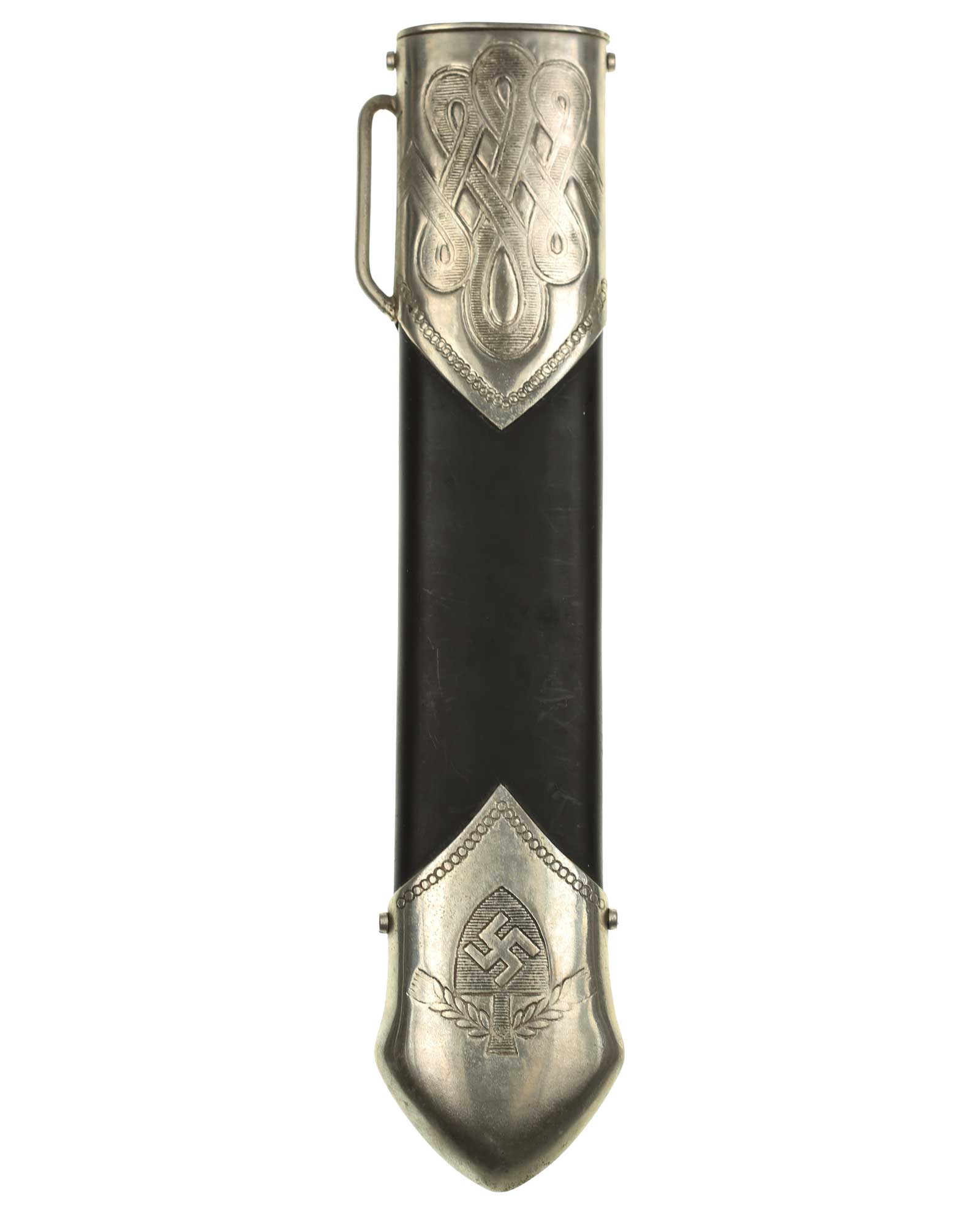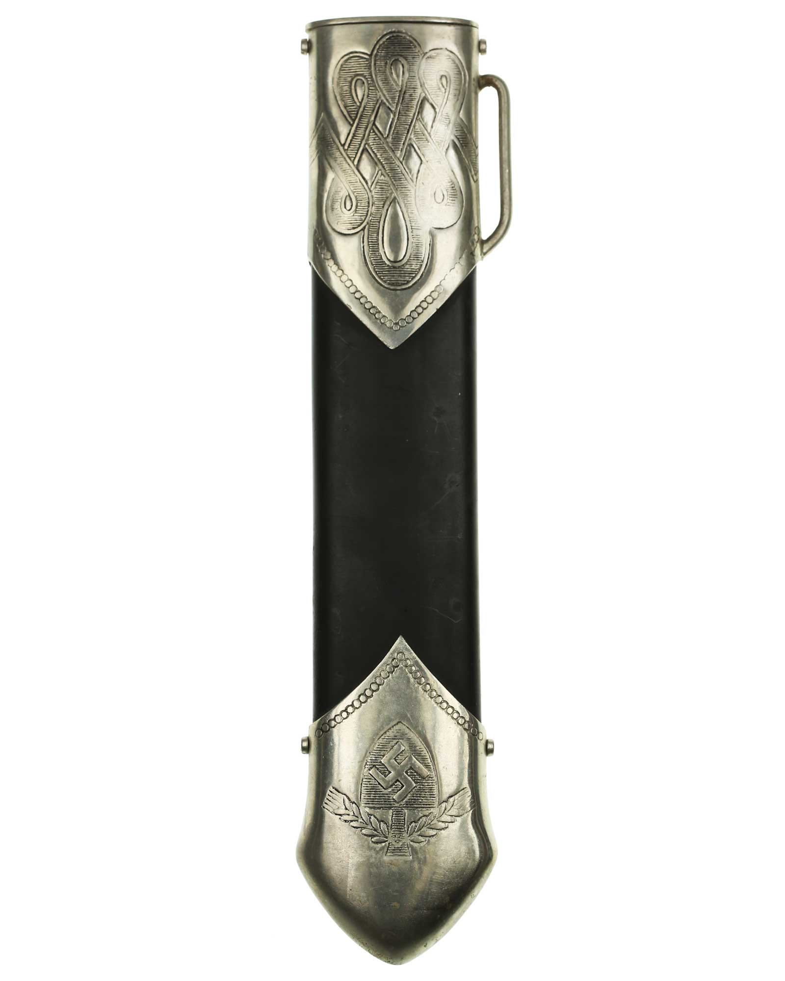 Scheide: Schwarz nachlackierte Stahlscheide, der untere Beschlag ist mit dem Symbol des Reichsarbeitsdienstes und am oberen Scheidenbeschlag befindet sich der Bügel zum Einhängen des Tragehängers.