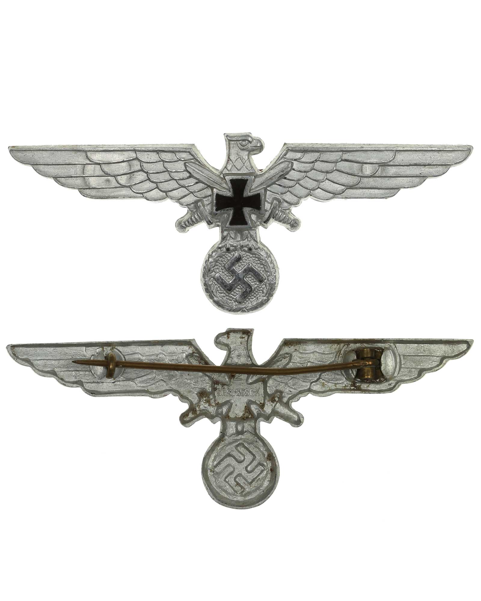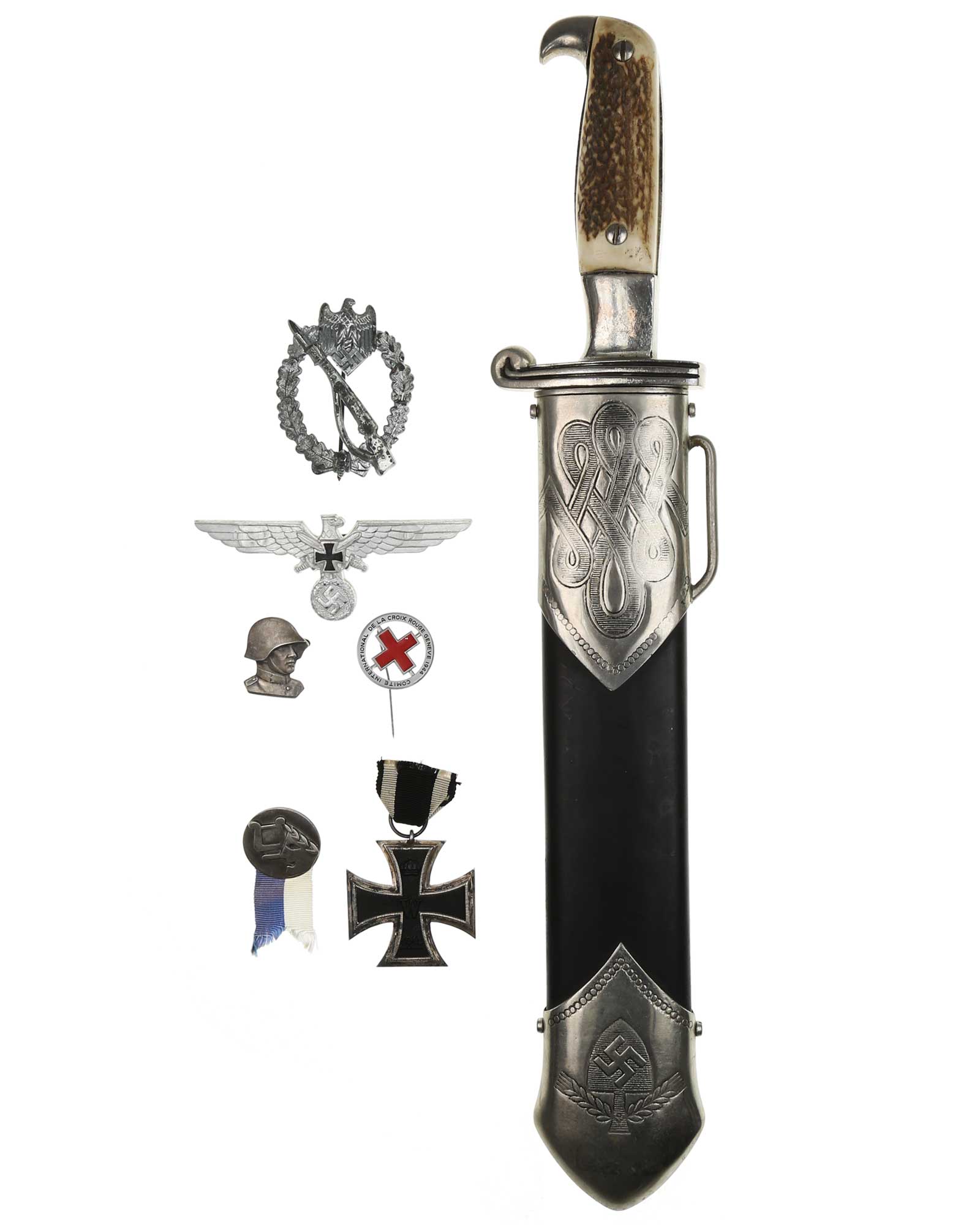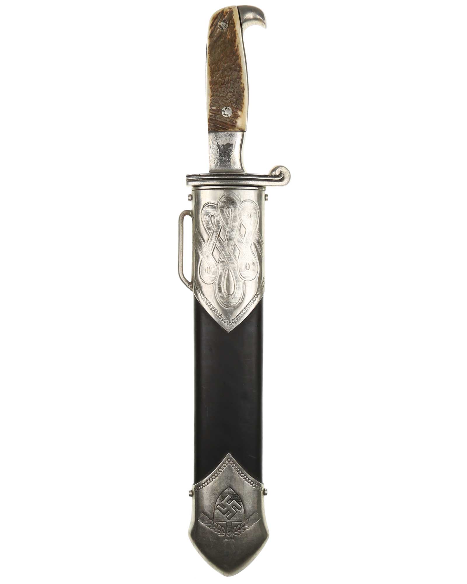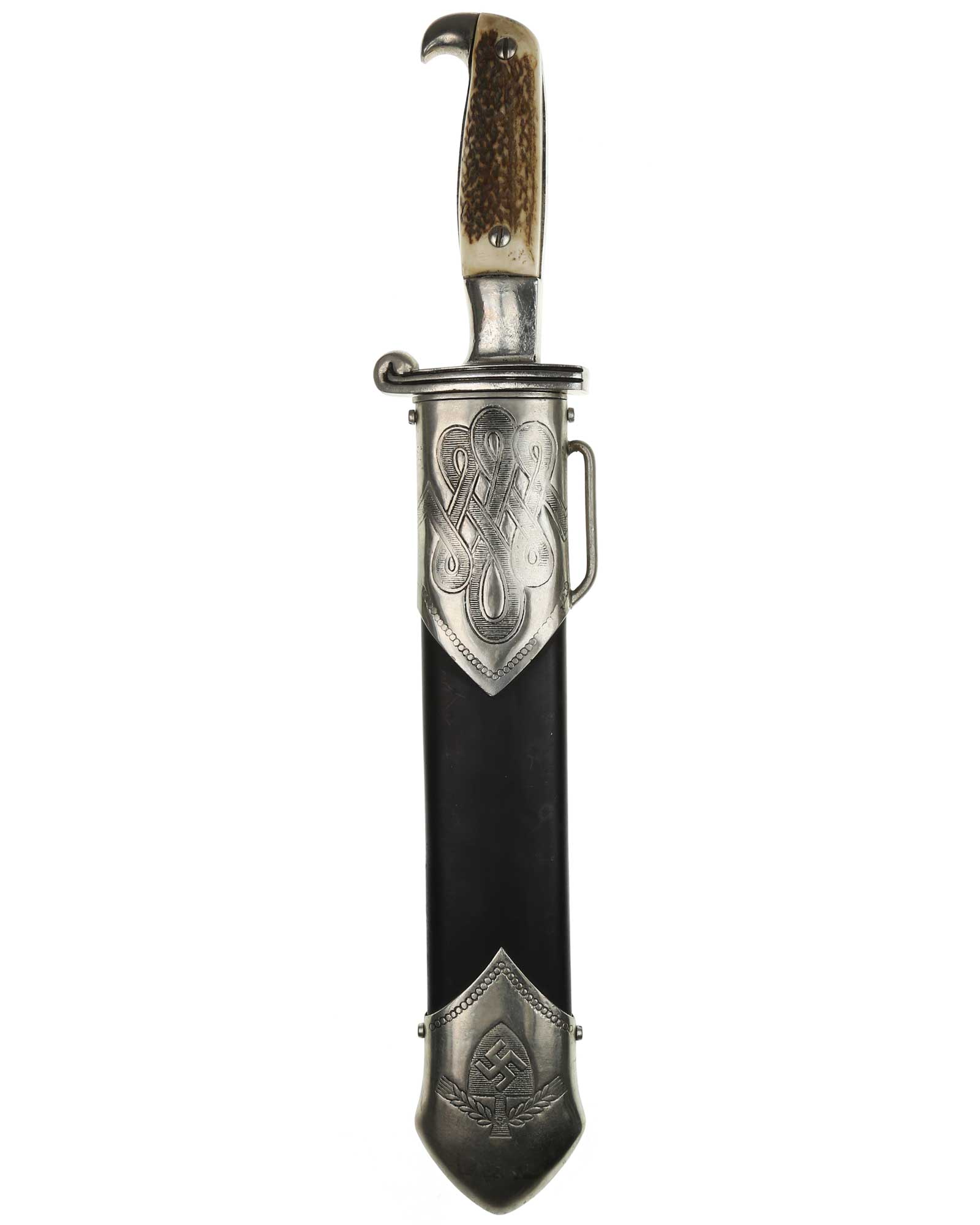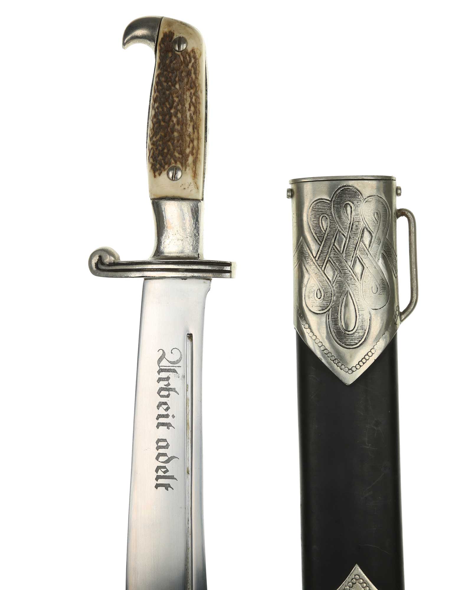 Scheide: Schwarz nachlackierte Stahlscheide, der untere Beschlag ist mit dem Symbol des Reichsarbeitsdienstes und am oberen Scheidenbeschlag befindet sich der Bügel zum Einhängen des Tragehängers.