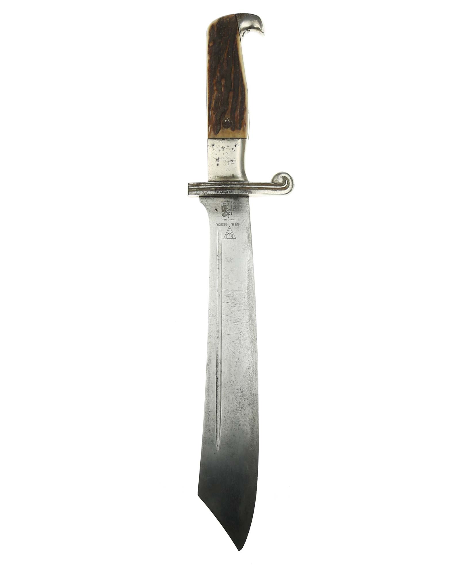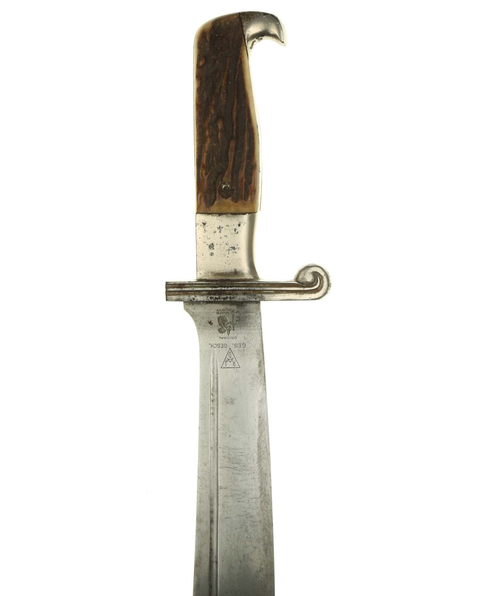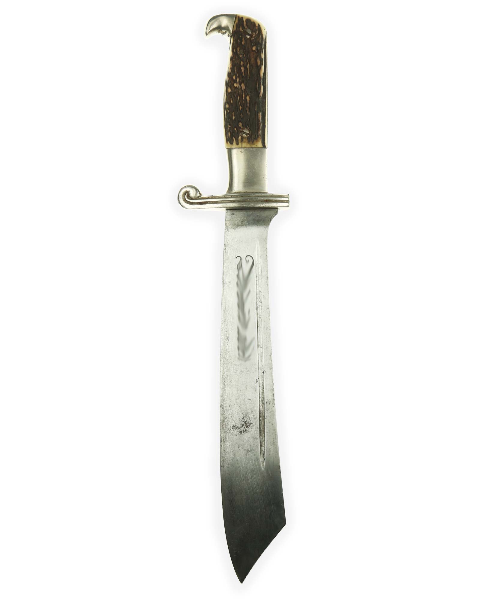Griff: Der Griff ist mit zwei Hirschhorn-Griffschalen, diese werden durch zwei Schrauben festgehalten. Der Griff hat die Form eines Adlers, der Schnabel ist in Richtung der Klingenseite gerichtet. Die Parierstange ist flach und mit zwei Längsrillen.