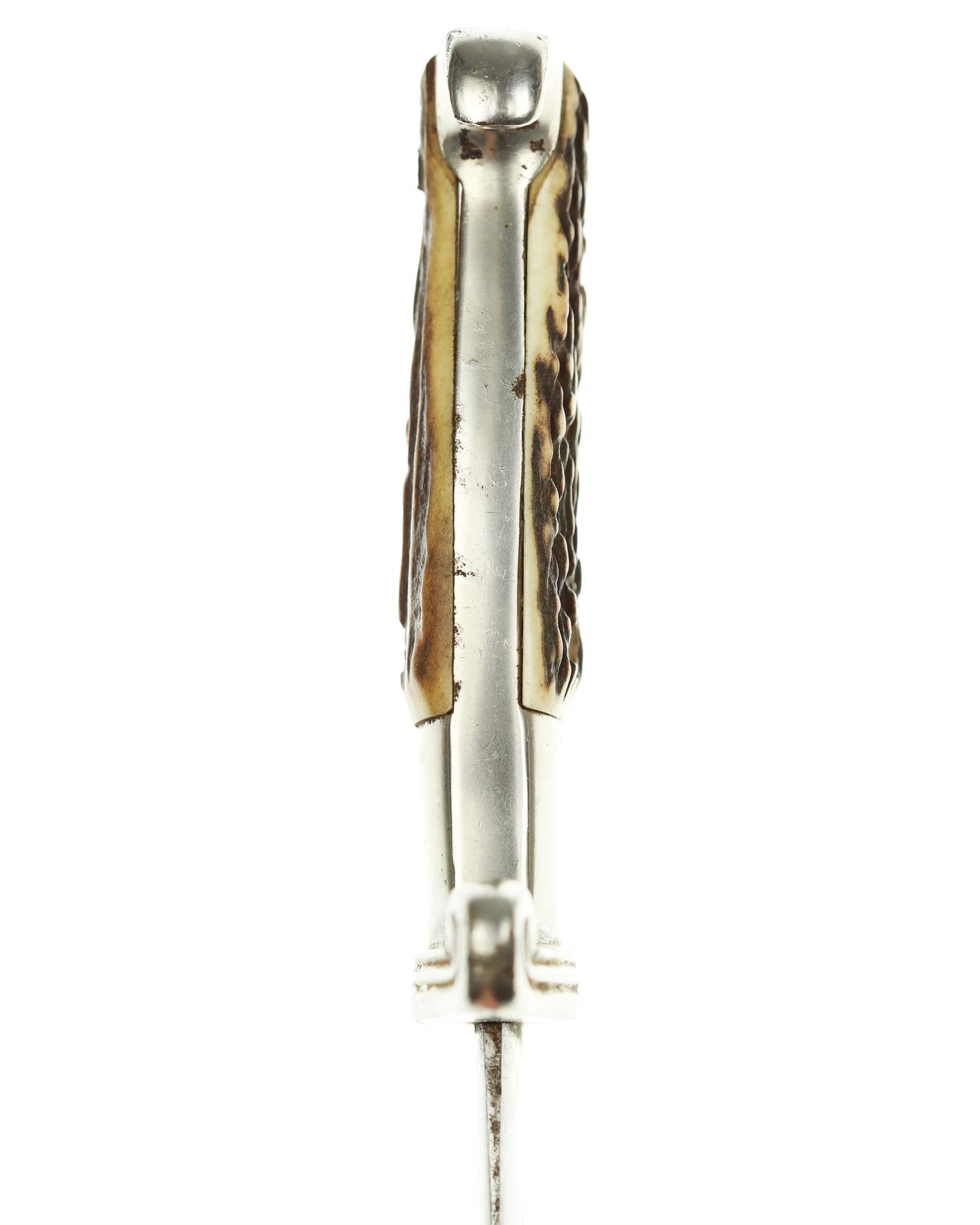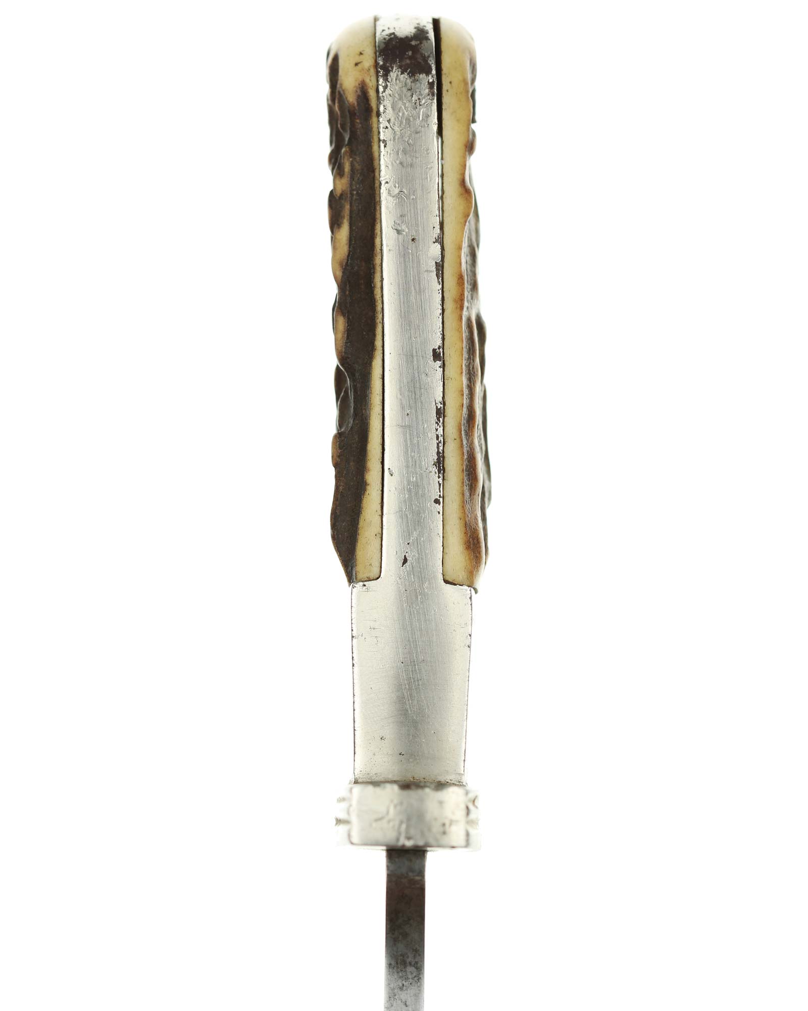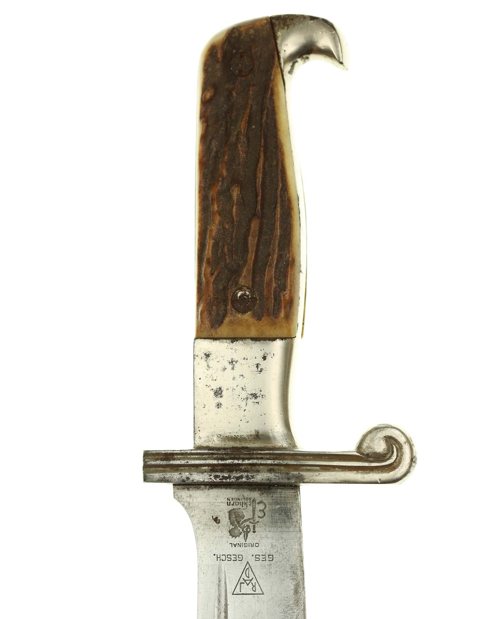 Griff: Der Griff ist mit zwei Hirschhorn-Griffschalen, diese werden durch zwei Schrauben festgehalten. Der Griff hat die Form eines Adlers, der Schnabel ist in Richtung der Klingenseite gerichtet. Die Parierstange ist flach und mit zwei Längsrillen.