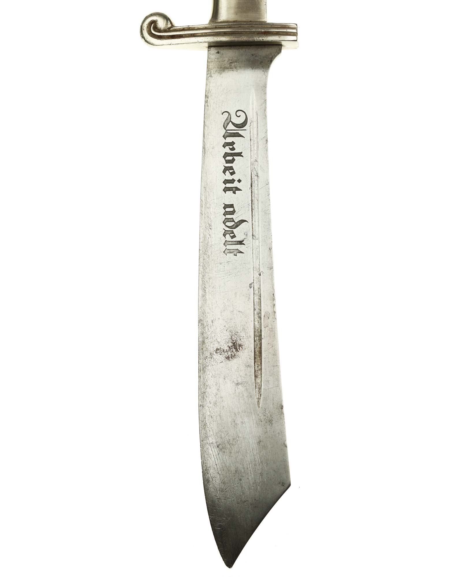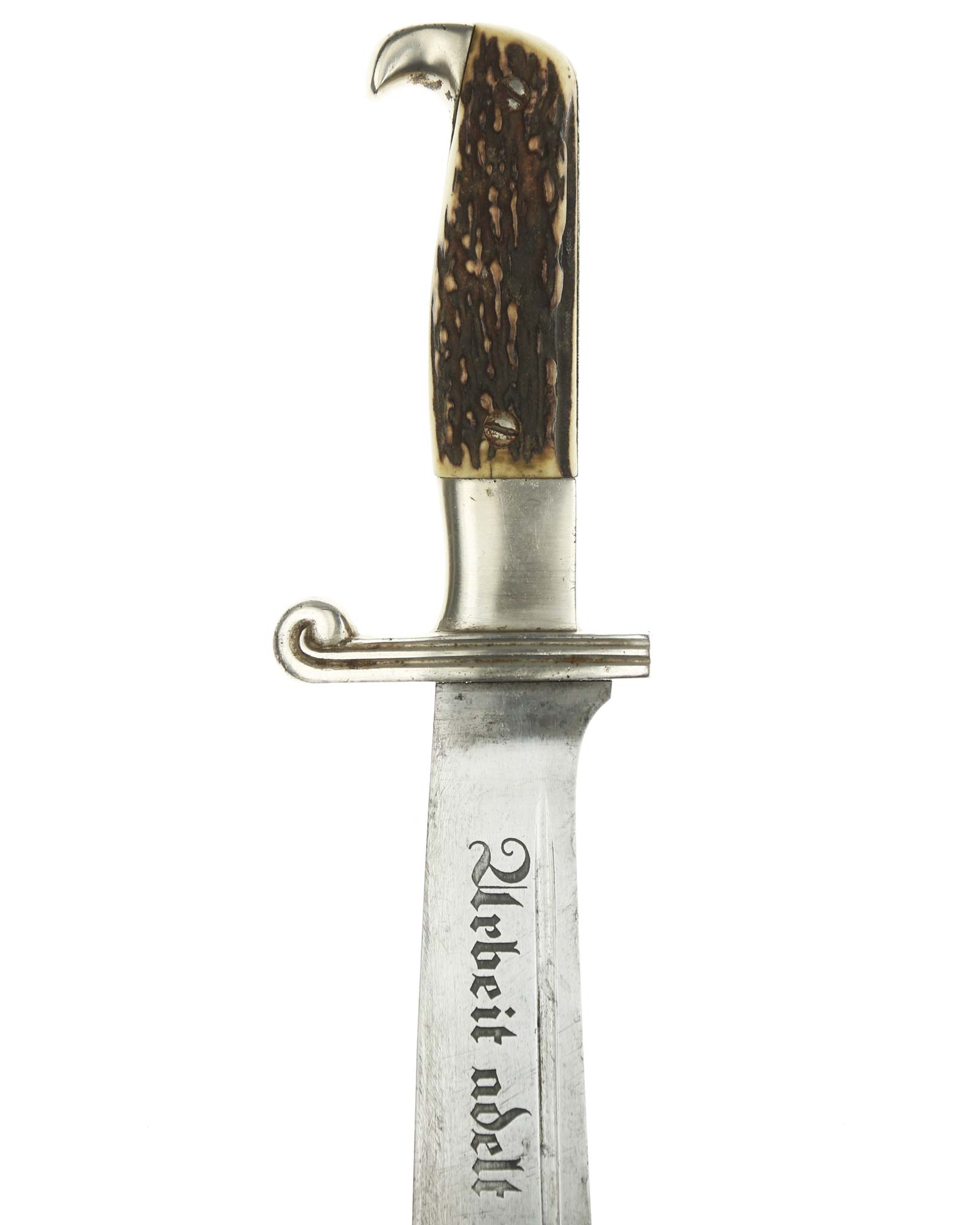 RAD [Reichsarbeitsdienst] Hauer für Unterführer. Modell 1934. Die Gesamtlänge beträgt 37,4 cm. Der Hauer hat das Herstellerlogo: Carl Eickhorn Solingen auf der Klinge.
