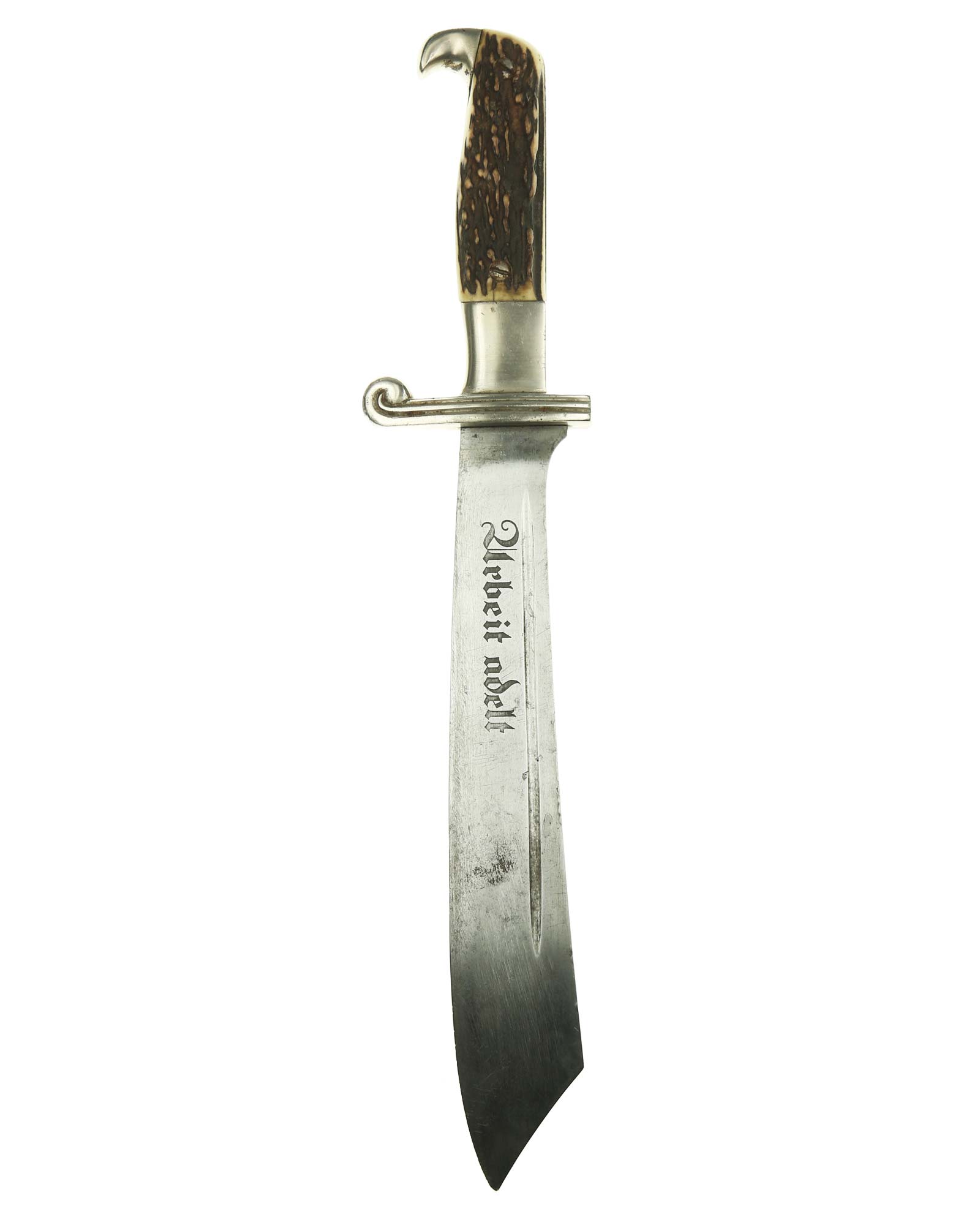 Klinge: Die Klinge ist einschneidig, leicht gebogen. die Rückenseite der Klinge ist komplett stumpf. Auf der Vorderseite befindet sich die dunkle RAD Devisenätzung in gotischer Schrift: «Arbeit adelt». Auf der Rückseite befindet sich das Dreizacklogo Logo: Carl Eickhorn Solingen.