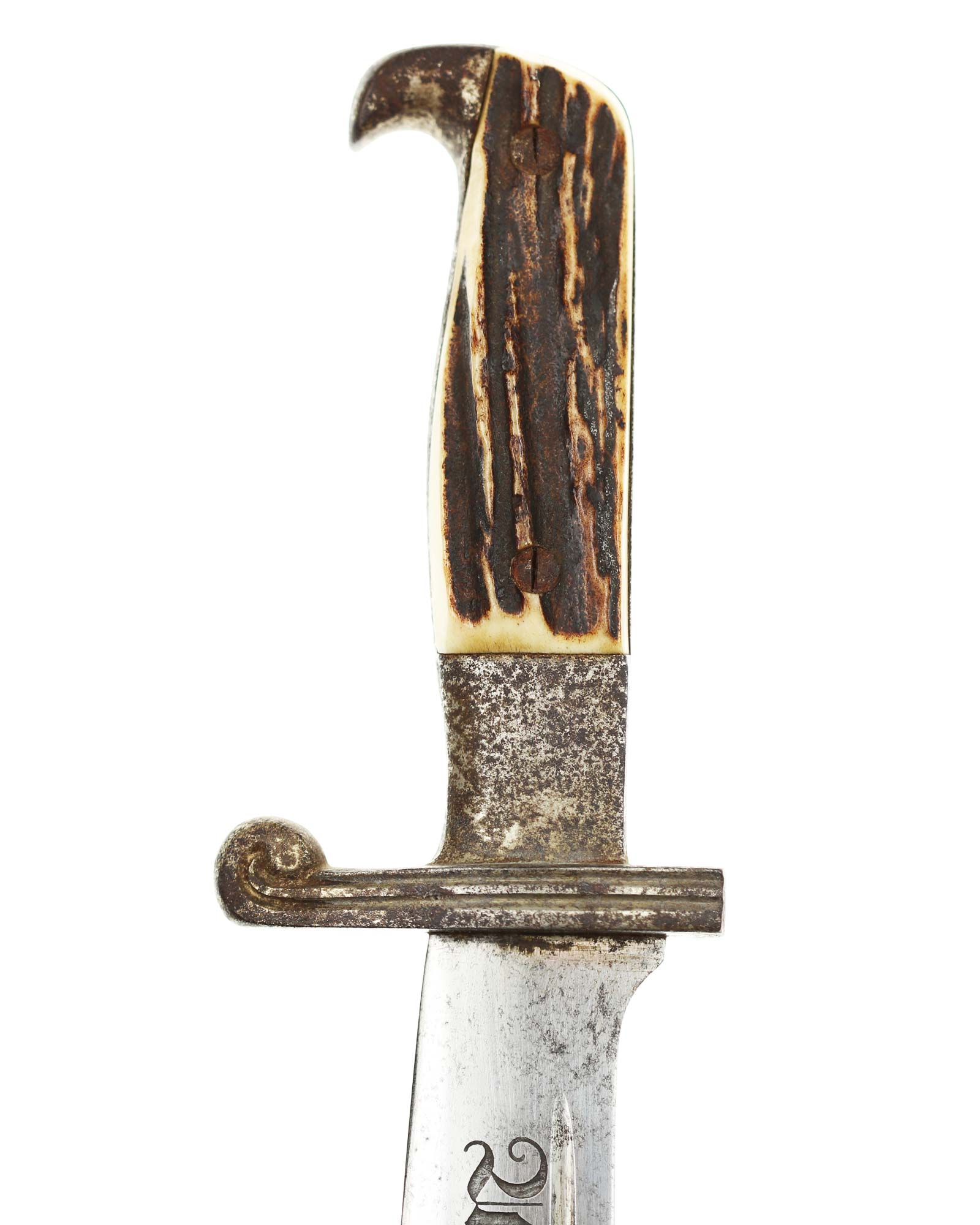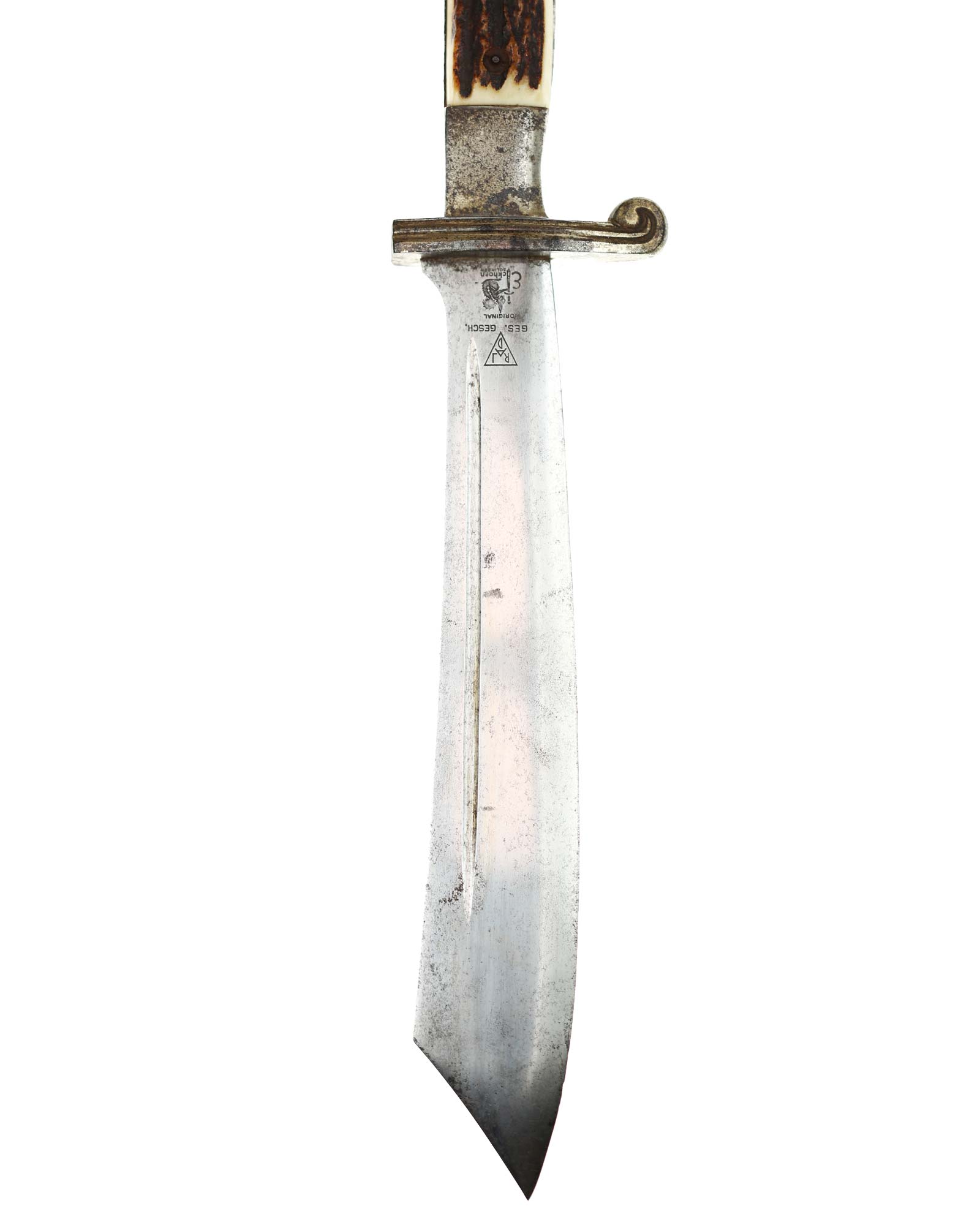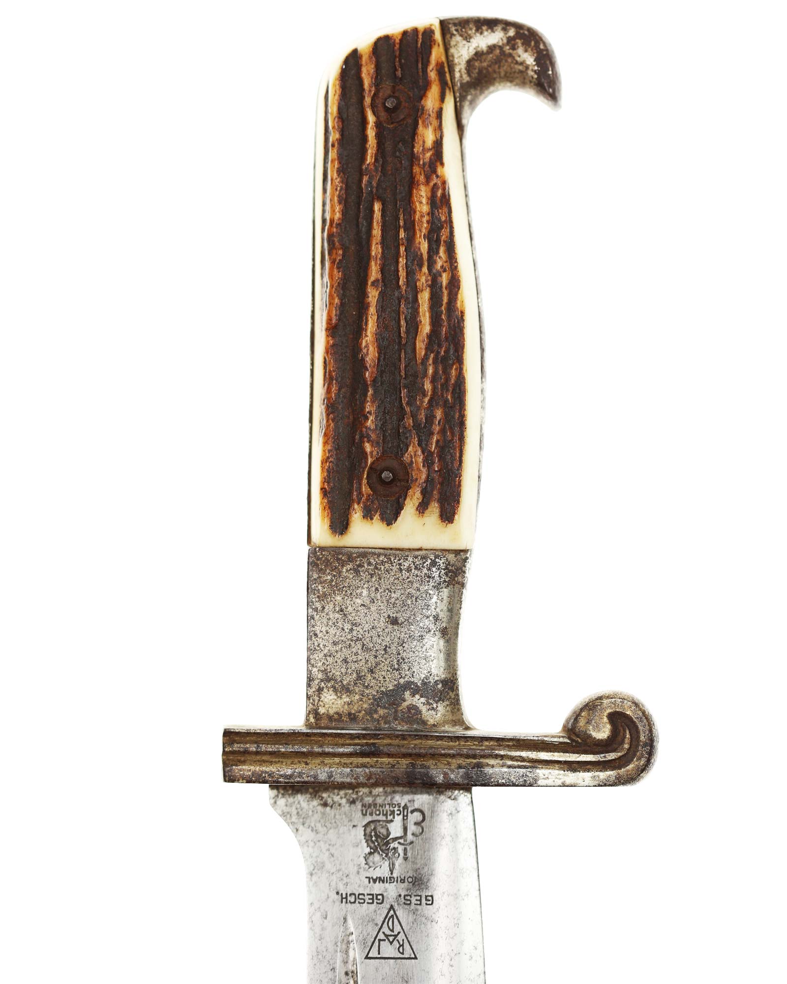 Griff: Der Griff ist mit zwei Hirschhorn-Griffschalen, diese werden durch zwei Schrauben festgehalten. Der Griff hat die Form eines Adlers, der Schnabel ist in Richtung der Klingenseite gerichtet. Die Parierstange ist flach und mit zwei Längsrillen.