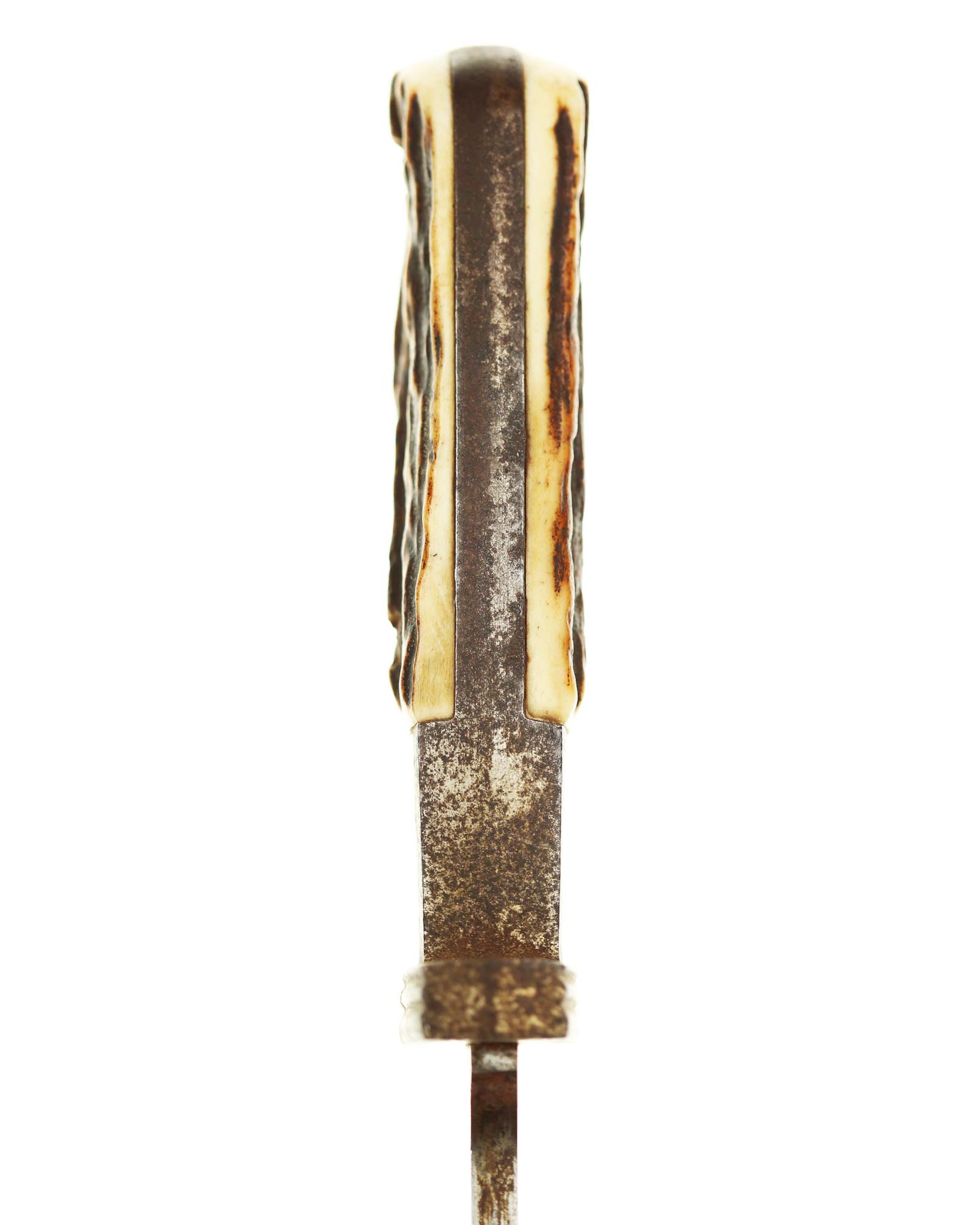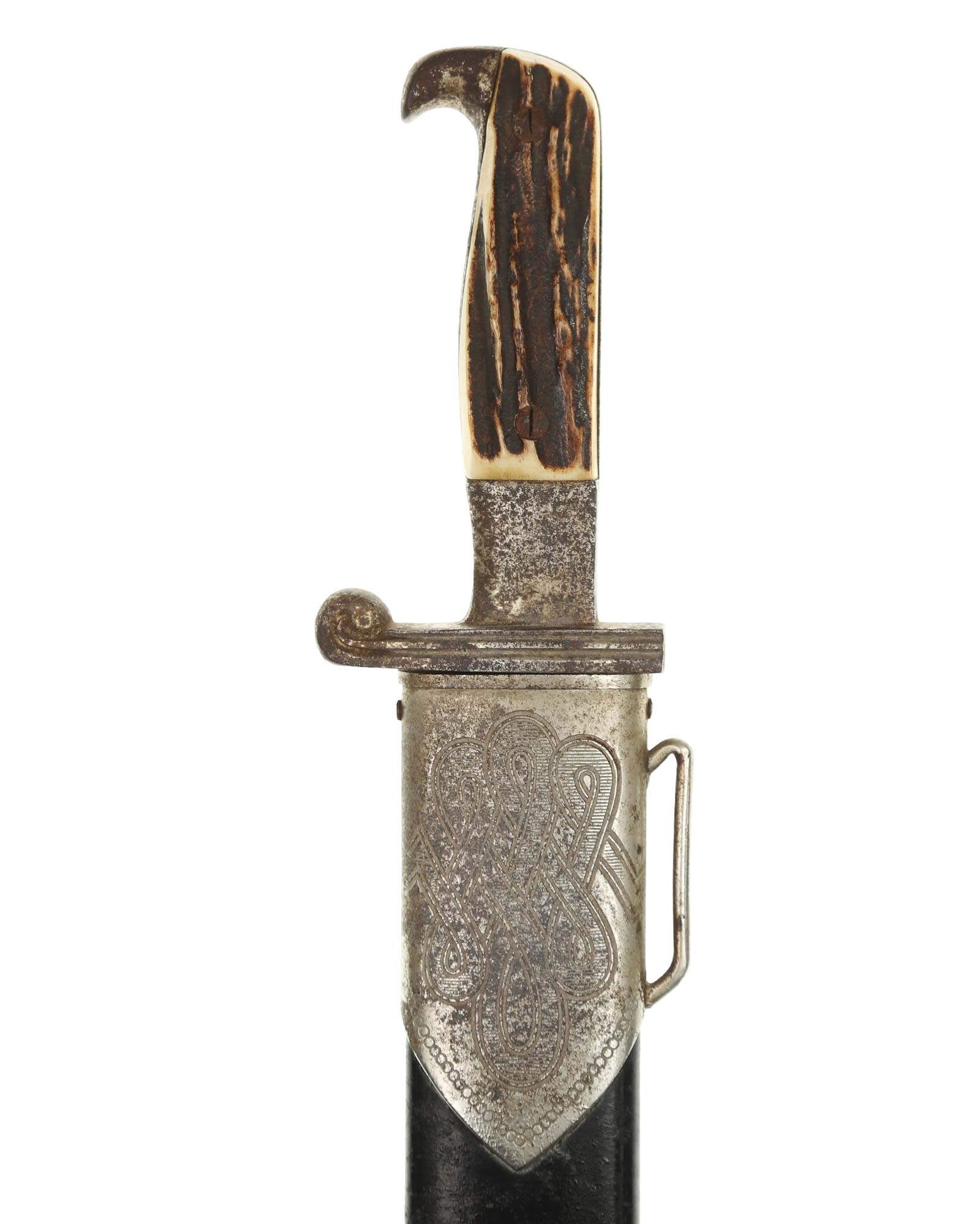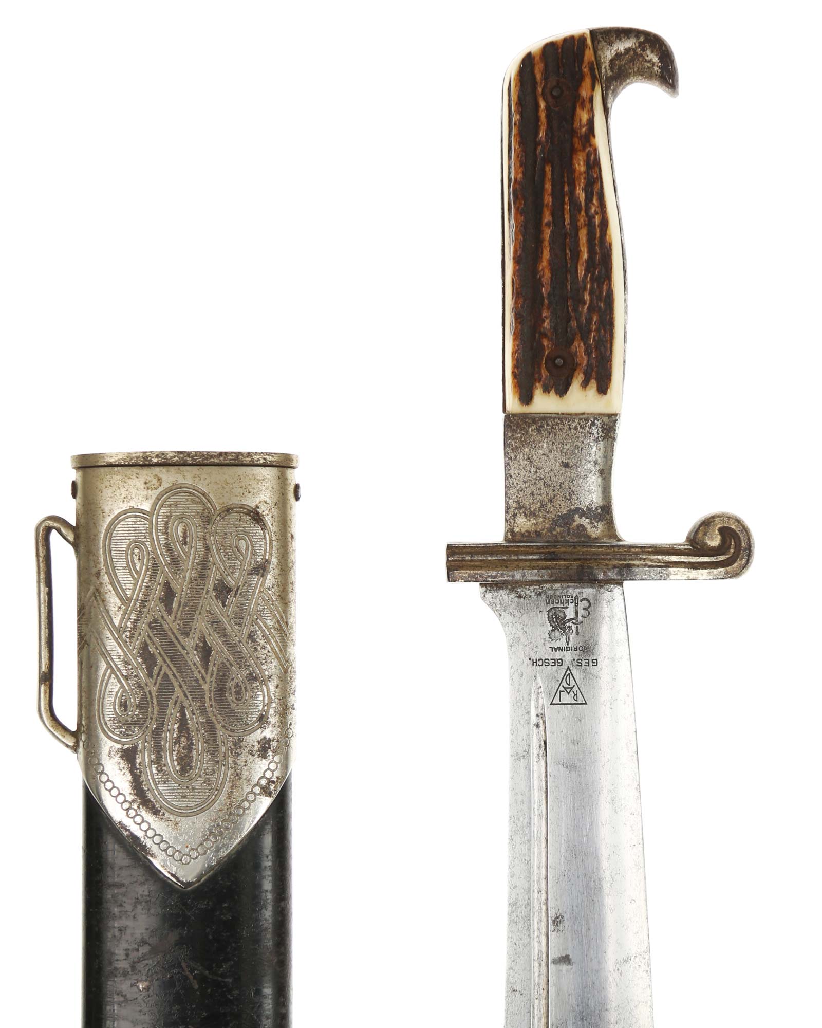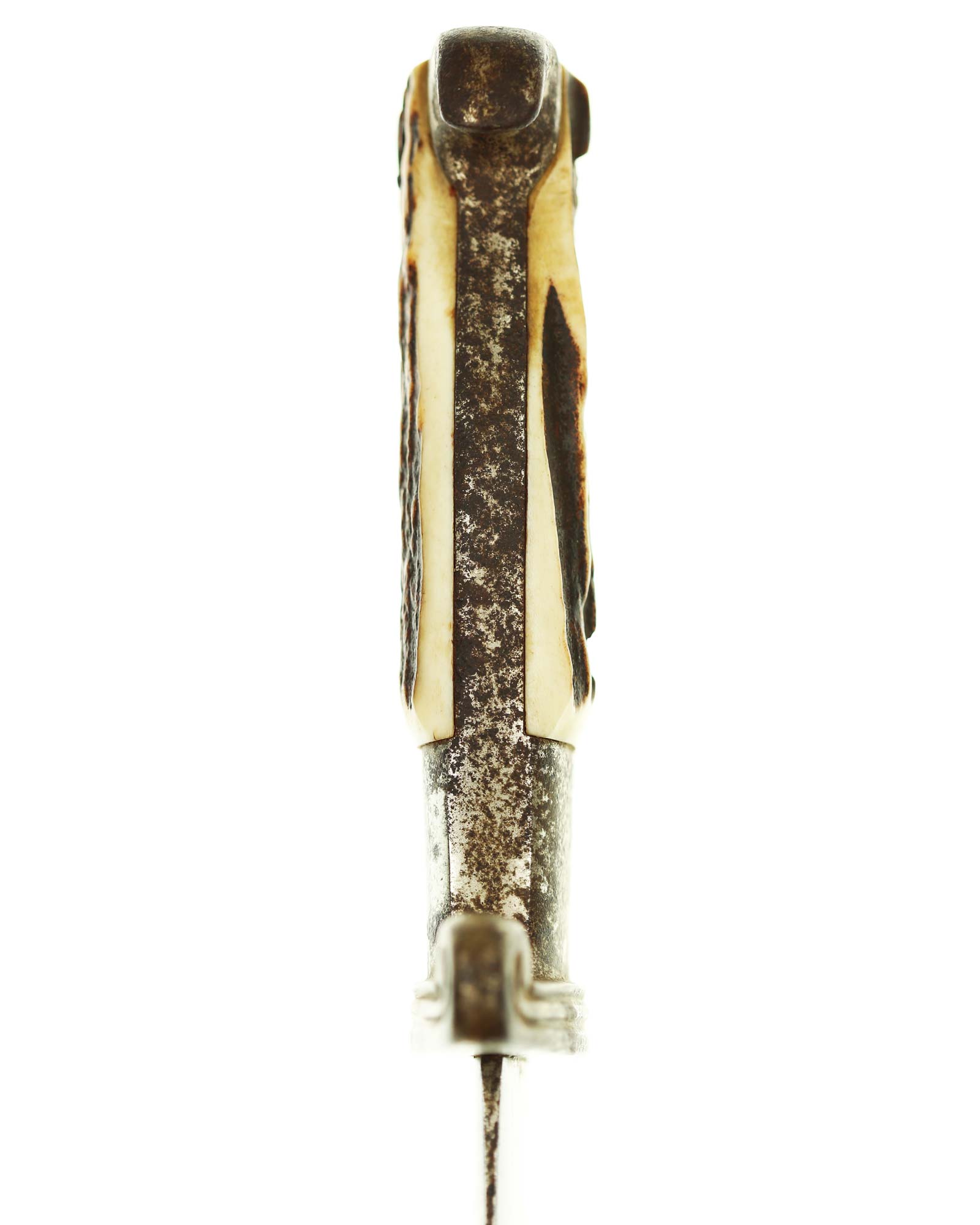 Griff: Der Griff ist mit zwei Hirschhorn-Griffschalen, diese werden durch zwei Schrauben festgehalten. Der Griff hat die Form eines Adlers, der Schnabel ist in Richtung der Klingenseite gerichtet. Die Parierstange ist flach und mit zwei Längsrillen.
