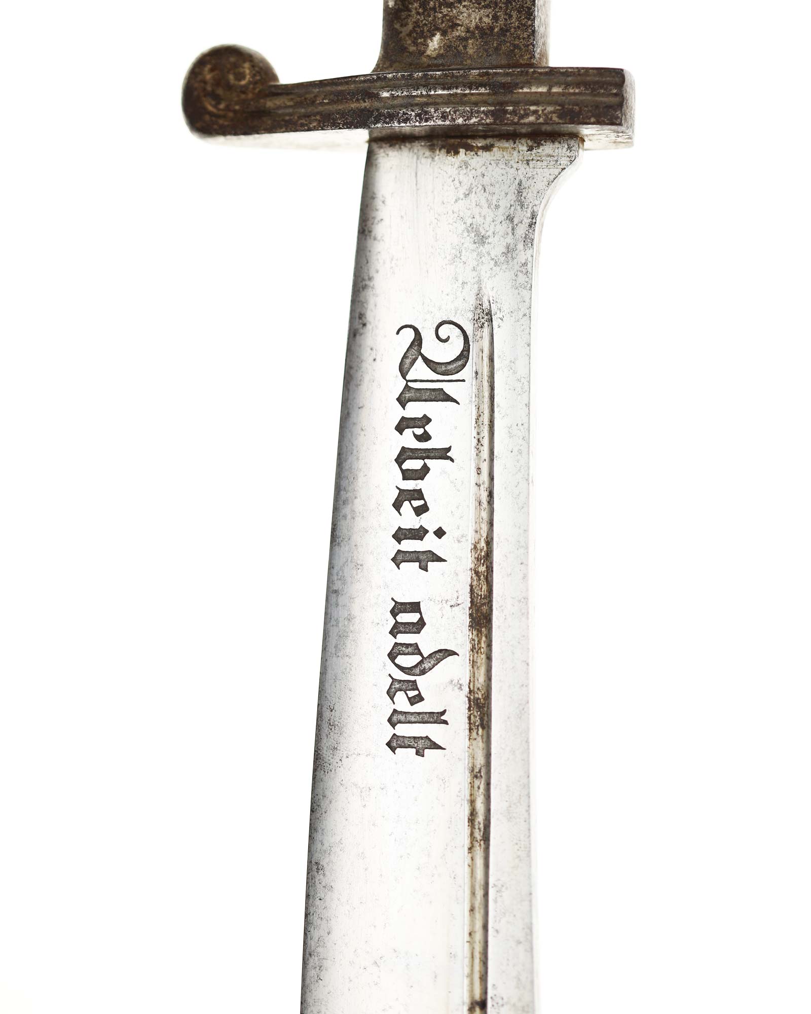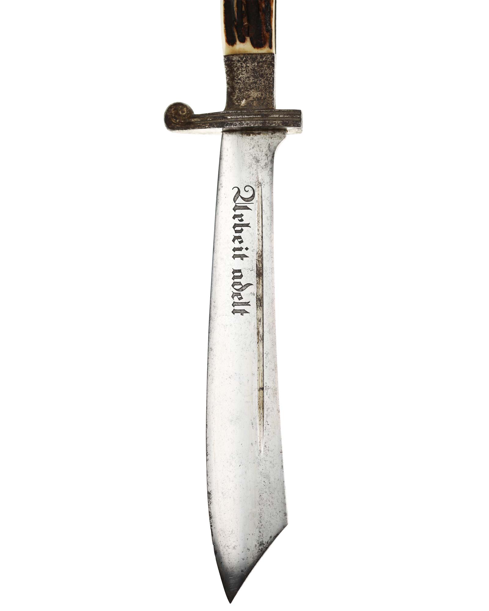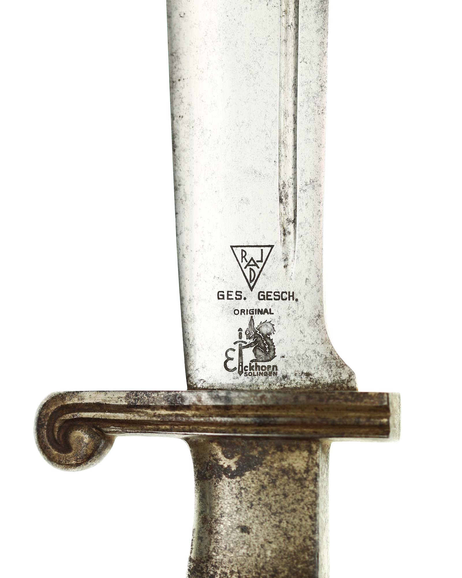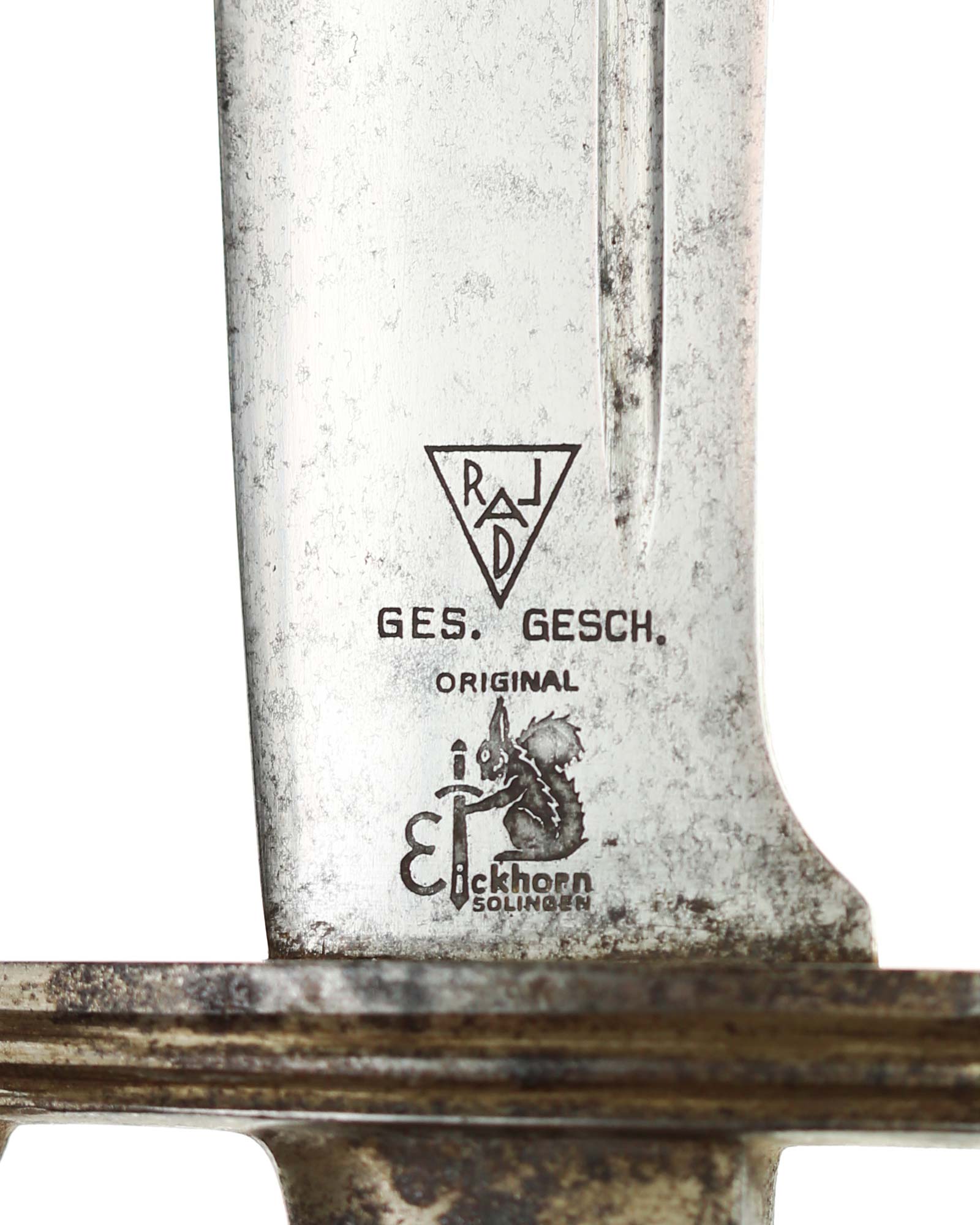 Klinge: Die Klinge ist einschneidig, leicht gebogen. die Rückenseite der Klinge ist komplett stumpf. Auf der Vorderseite befindet sich die dunkle RAD Devisenätzung in gotischer Schrift: «Arbeit adelt». Auf der Rückseite befindet sich das Dreizacklogo Logo: Carl Eickhorn Solingen.