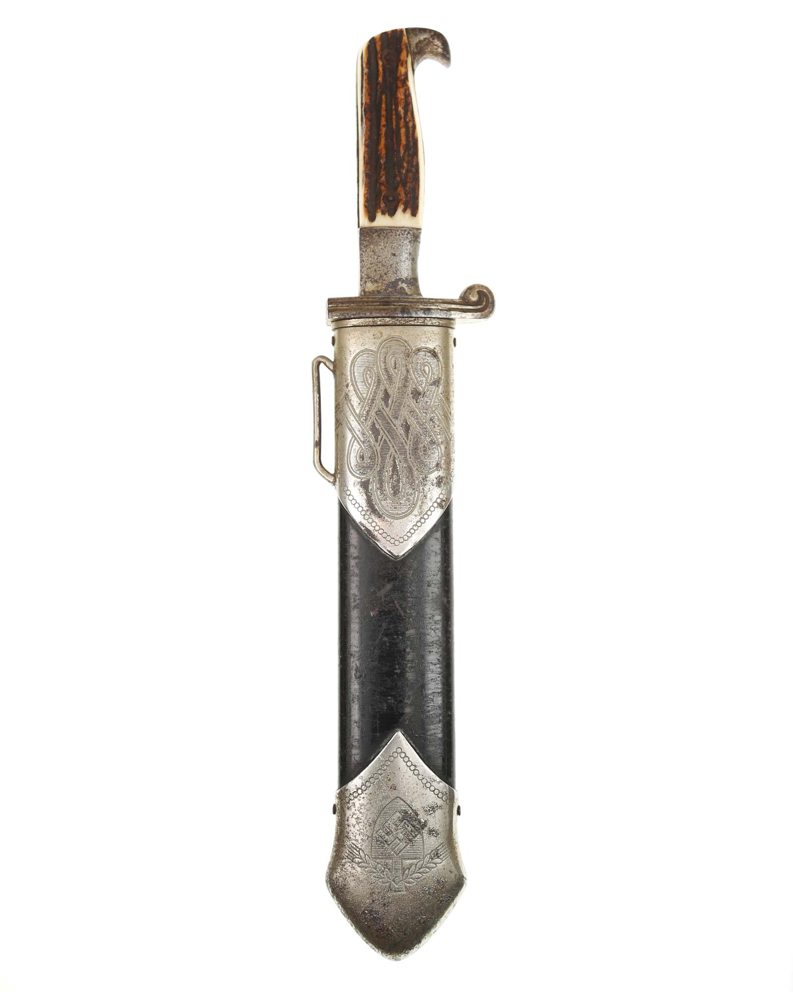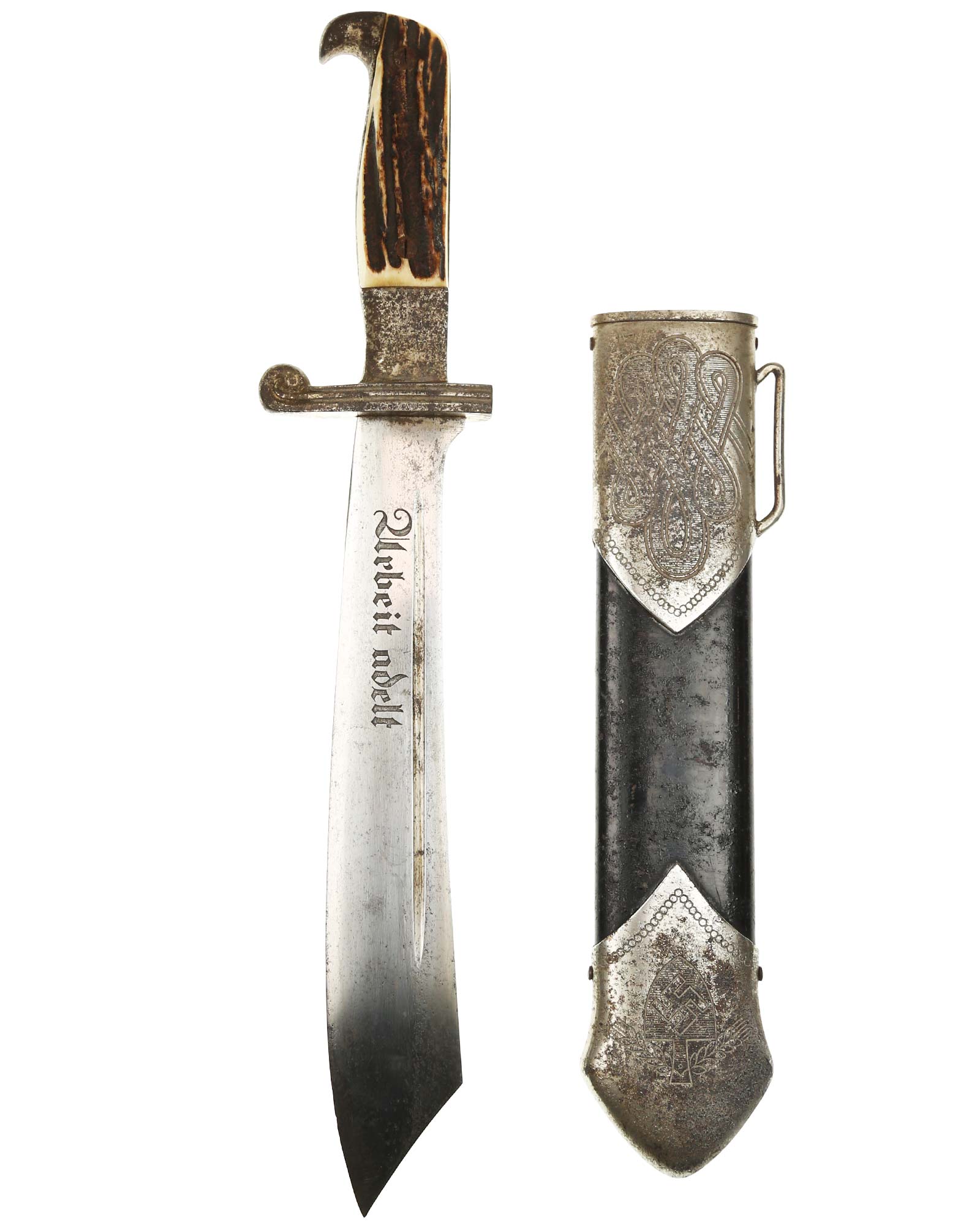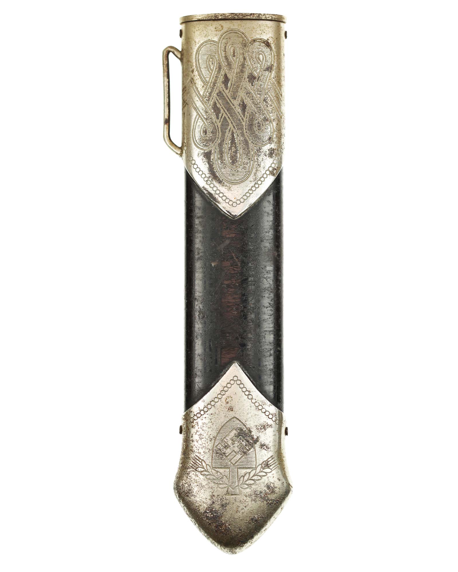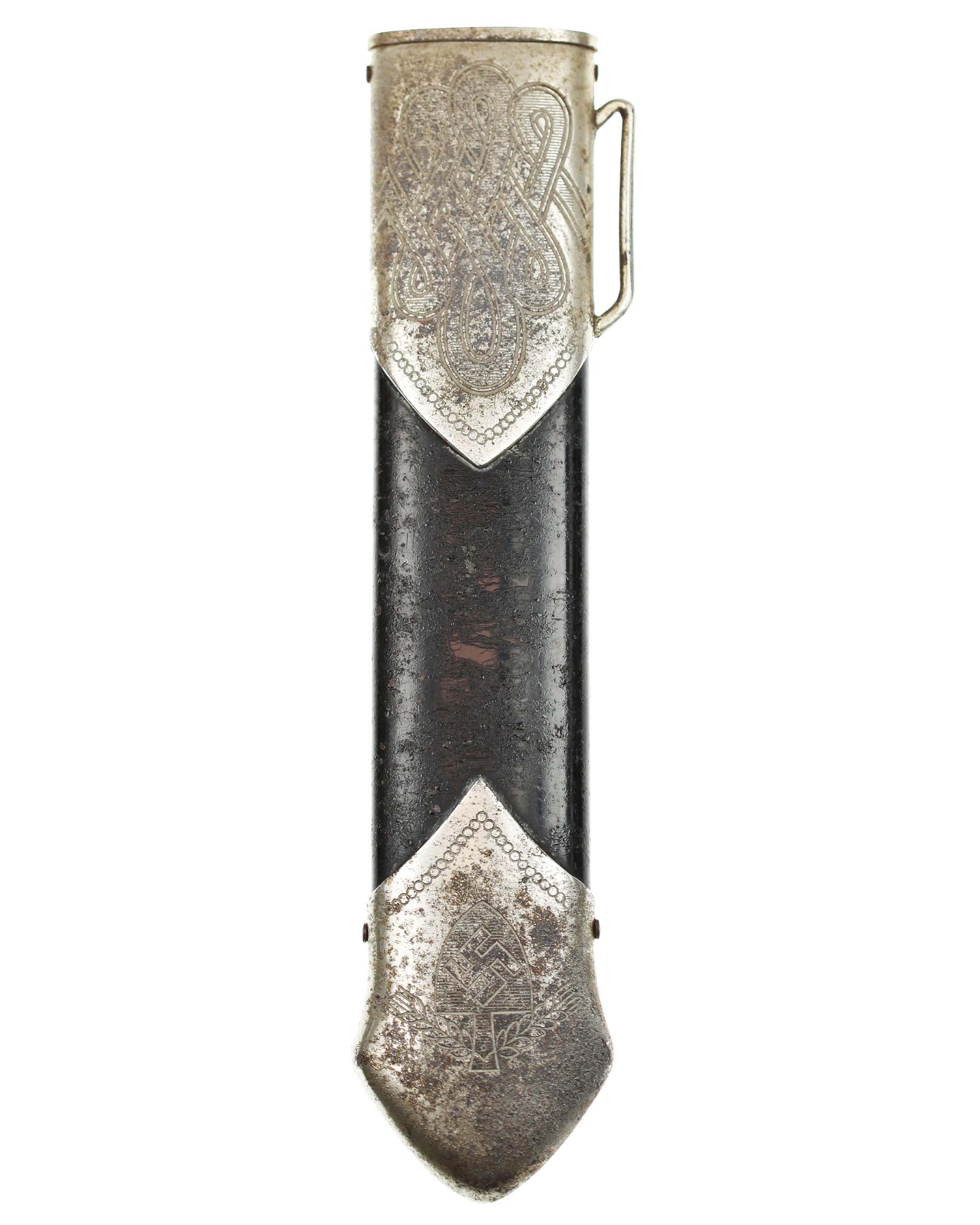 Scheide: Schwarz lackierte Stahlscheide. Der untere Beschlag ist mit dem Symbol des Reichsarbeitsdienstes ohne HK und am oberen Scheidenbeschlag befindet sich der Bügel zum Einhängen des Tragehängers.