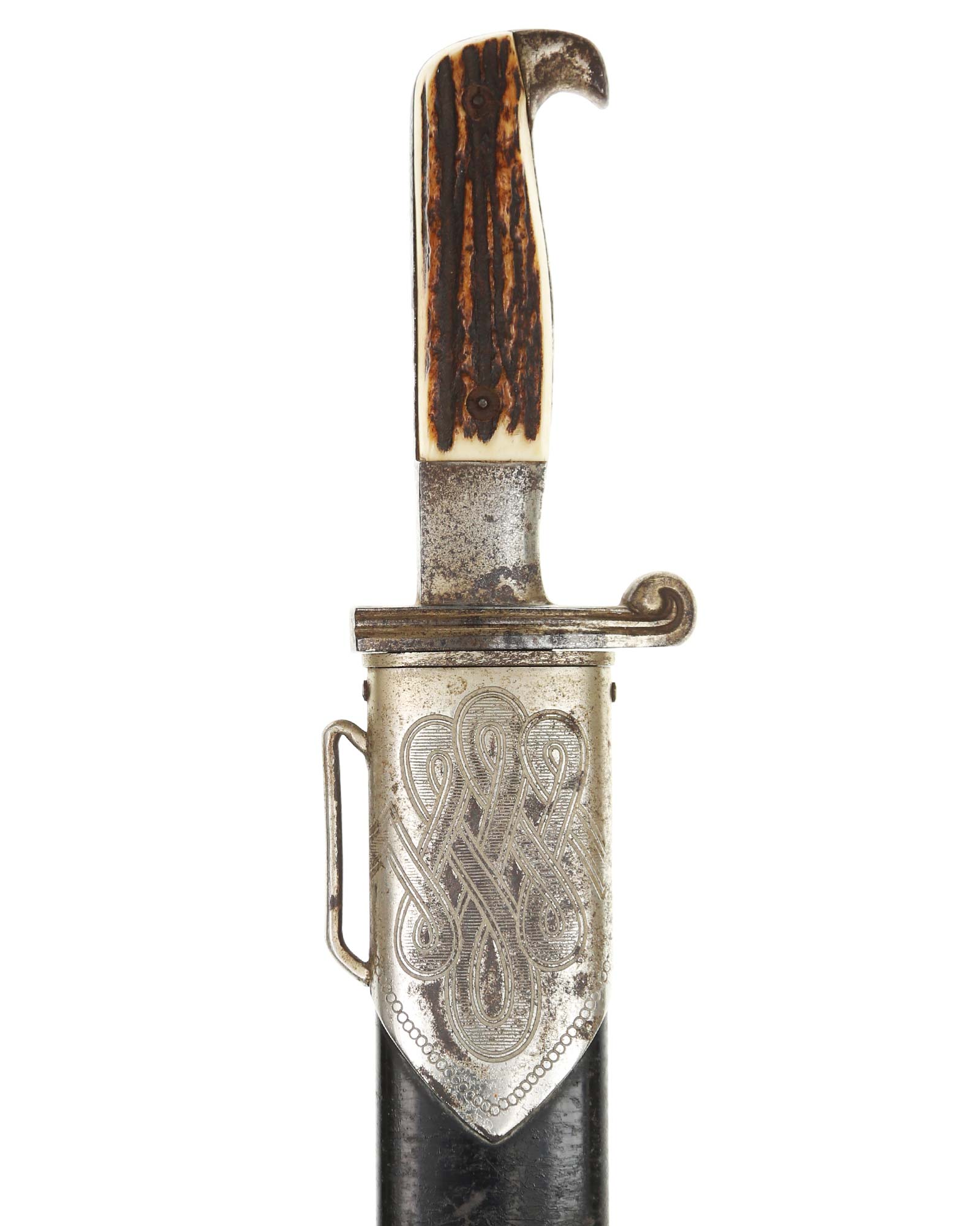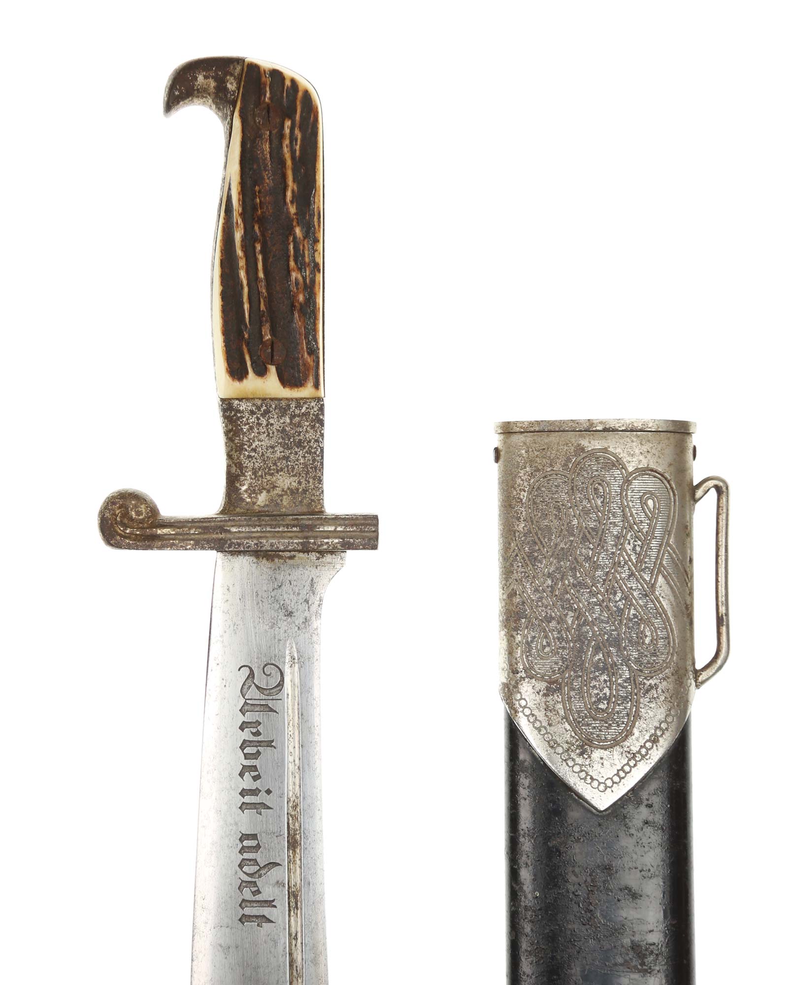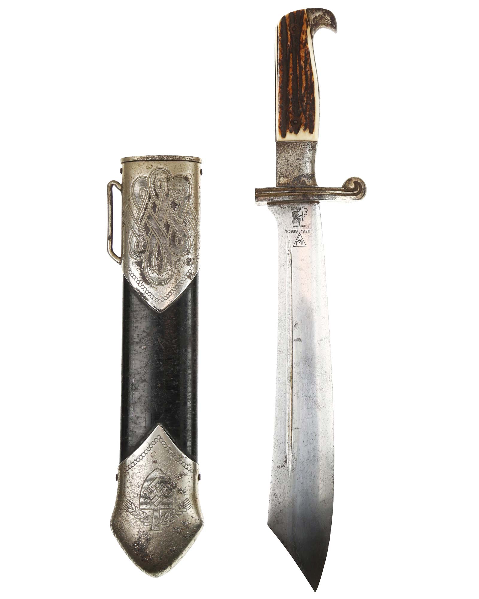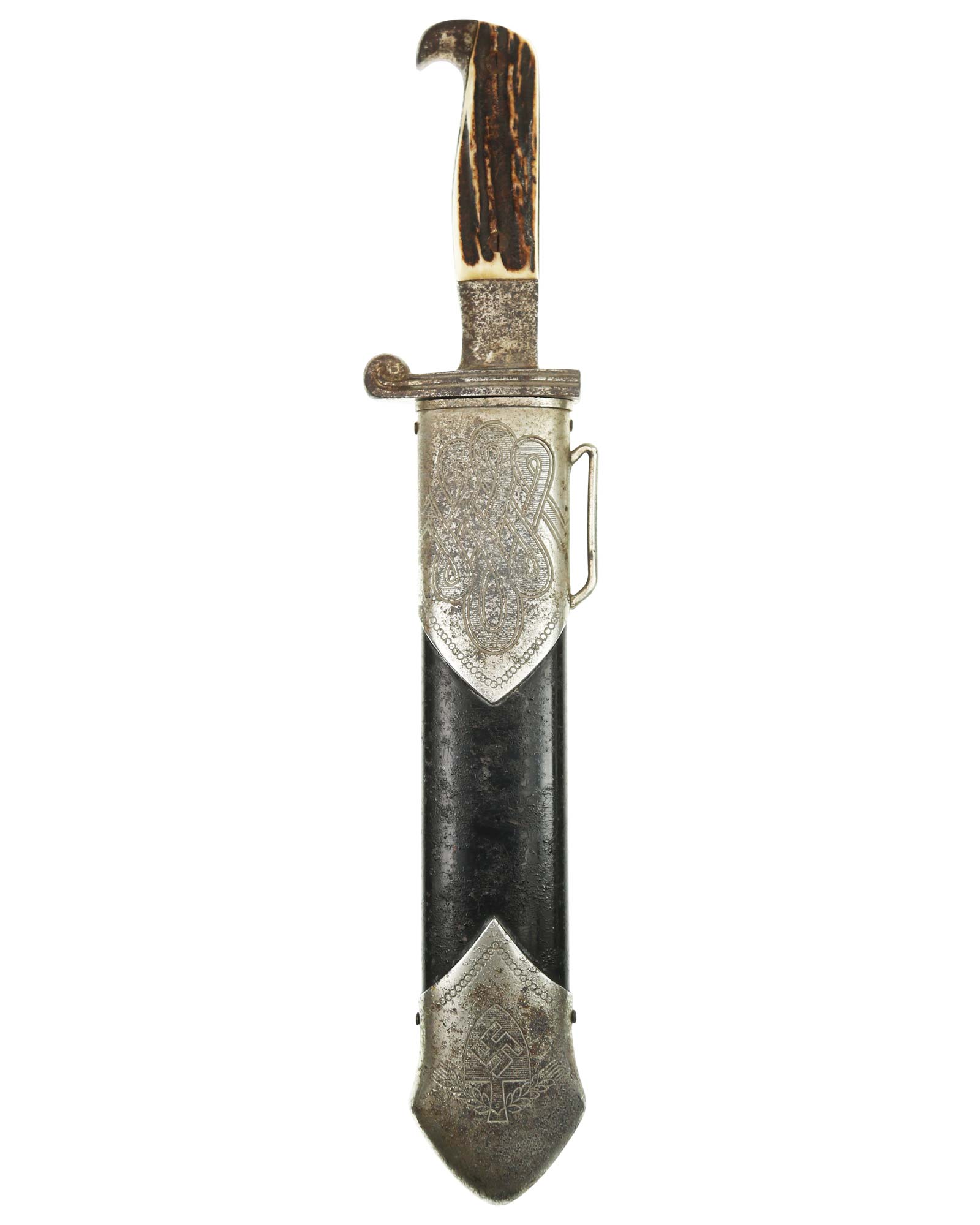 Scheide: Schwarz lackierte Stahlscheide. Der untere Beschlag ist mit dem Symbol des Reichsarbeitsdienstes ohne HK und am oberen Scheidenbeschlag befindet sich der Bügel zum Einhängen des Tragehängers.